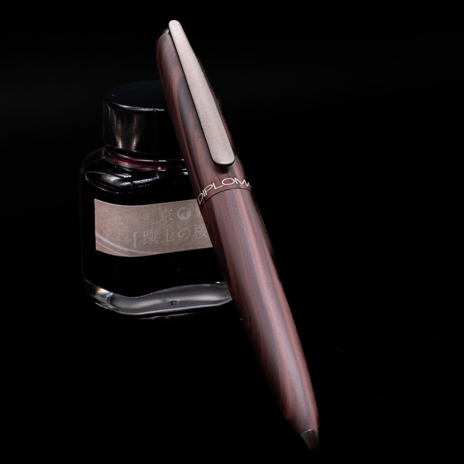 Diplomat Aero Fountain Pen - Black Forest capped, leaning against an ink bottle.