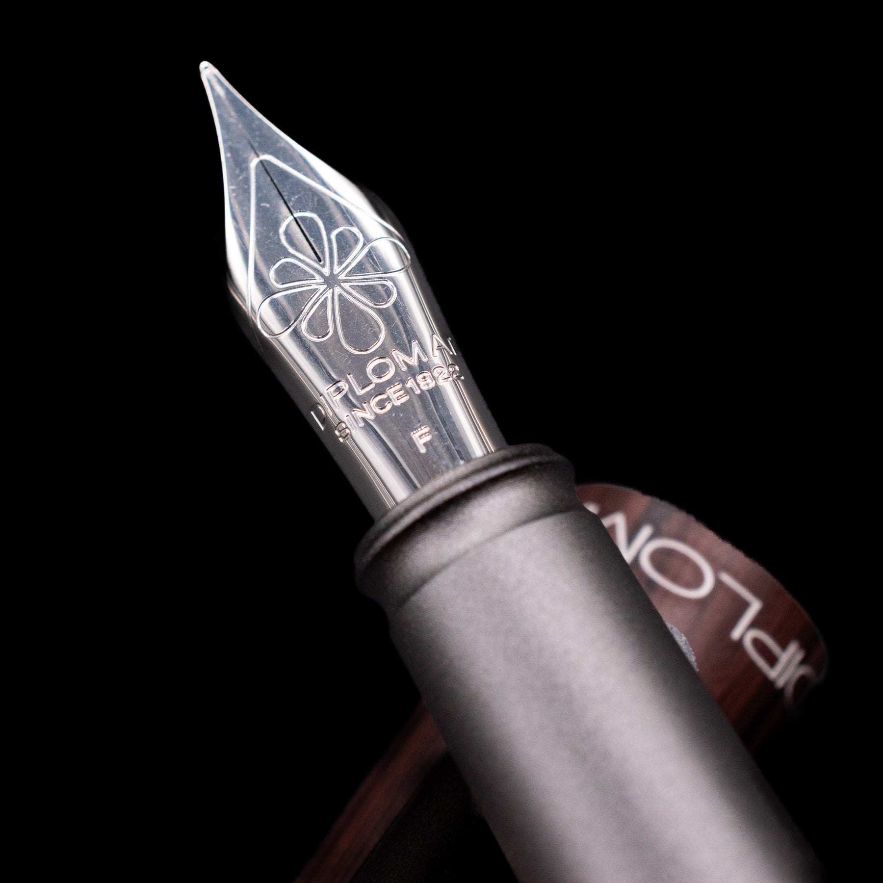 A macro shot of the nib with its intricate detailing and logo engraving for the Diplomat Aero Fountain Pen - Black Forest.