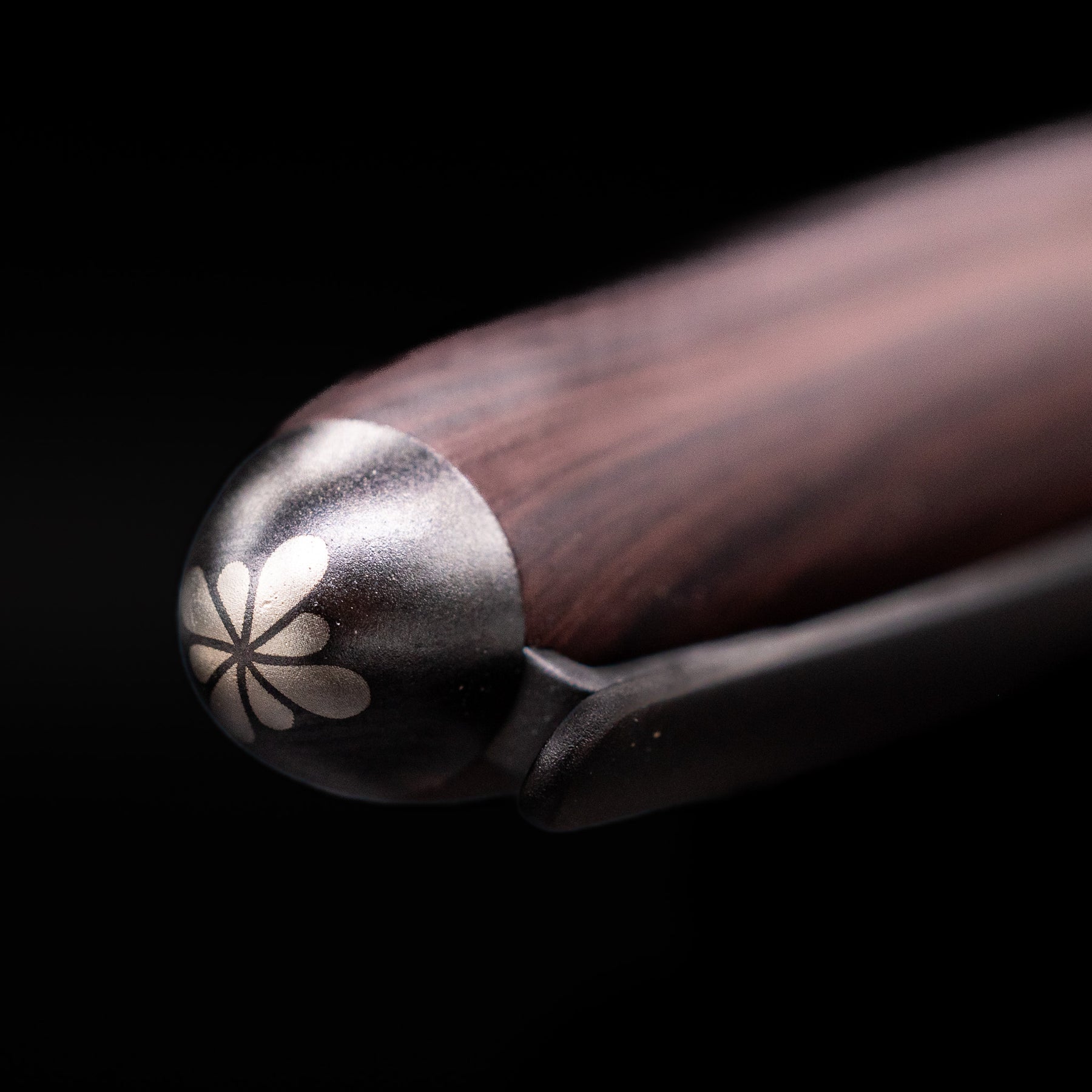 Contrasting matte black trim provides a modern counterpoint to the wood-grain body, completing the pen’s sophisticated and slightly rugged aesthetic.
