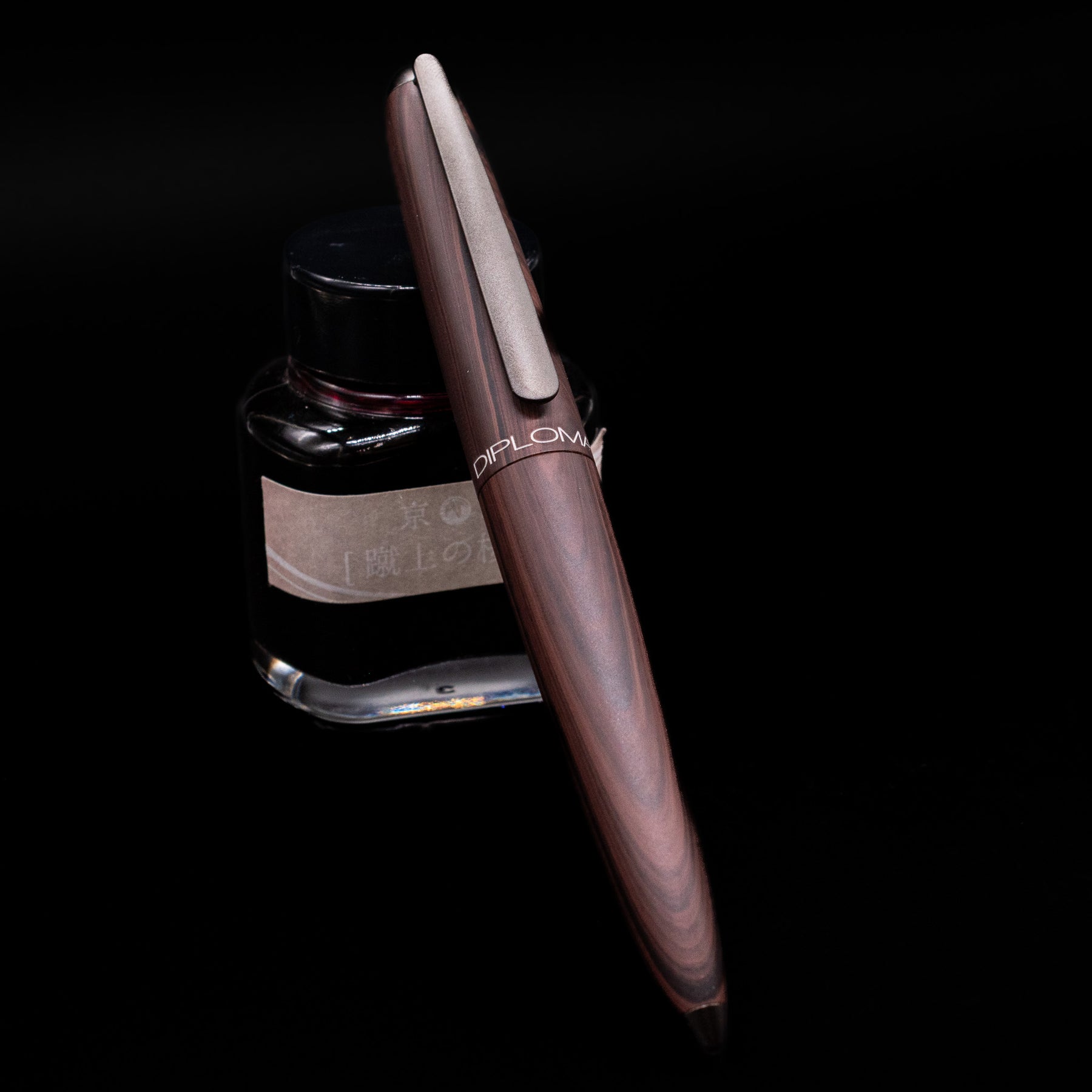 Diplomat Aero Rollerball Pen - Black Forest capped, leaning against an ink bottle.