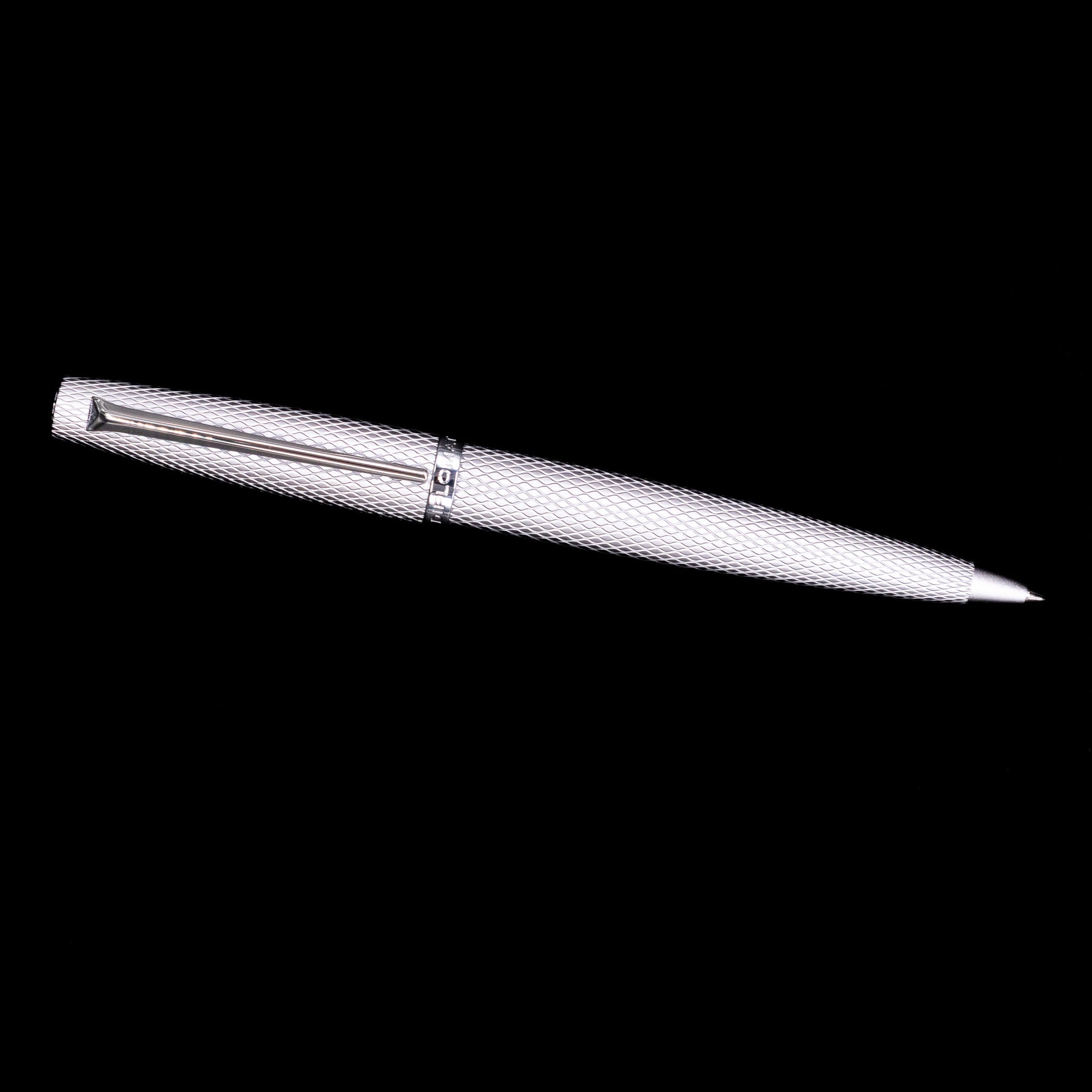 Complementing the engraved body are silver PVD-coated trims, which maintain the pen’s sleek monochromatic appearance while providing durability and resistance to wear. The streamlined silhouette feels balanced in the hand, making the pen comfortable for extended writing sessions in both professional and everyday environments.