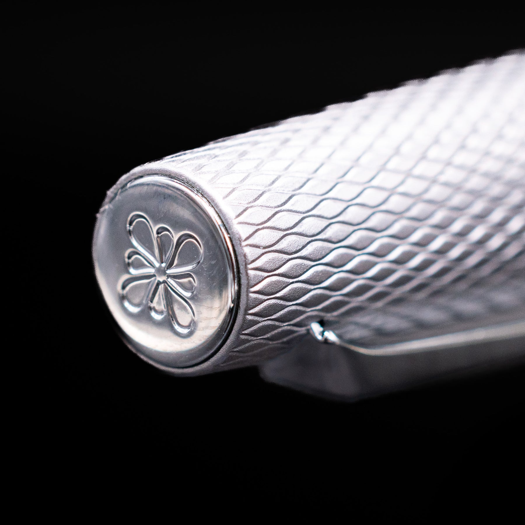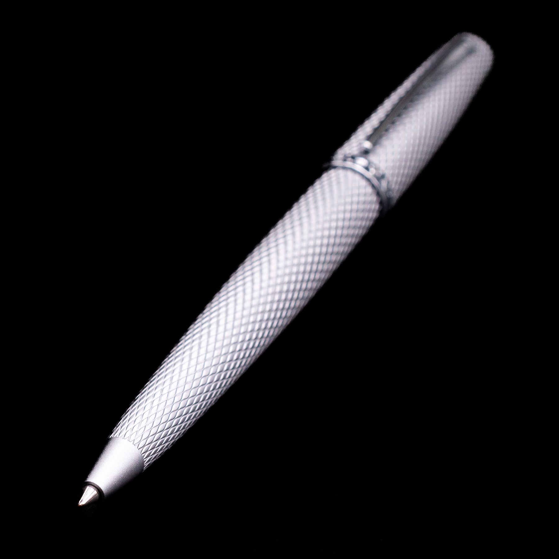 The pen features a silver anodized metal barrel decorated with a detailed guilloché engraving that resembles reptile scales—an aesthetic that inspired the Viper name. The pattern creates a dynamic interplay of light and shadow across the surface while also improving grip, giving the pen a tactile feel that is both functional and visually distinctive.