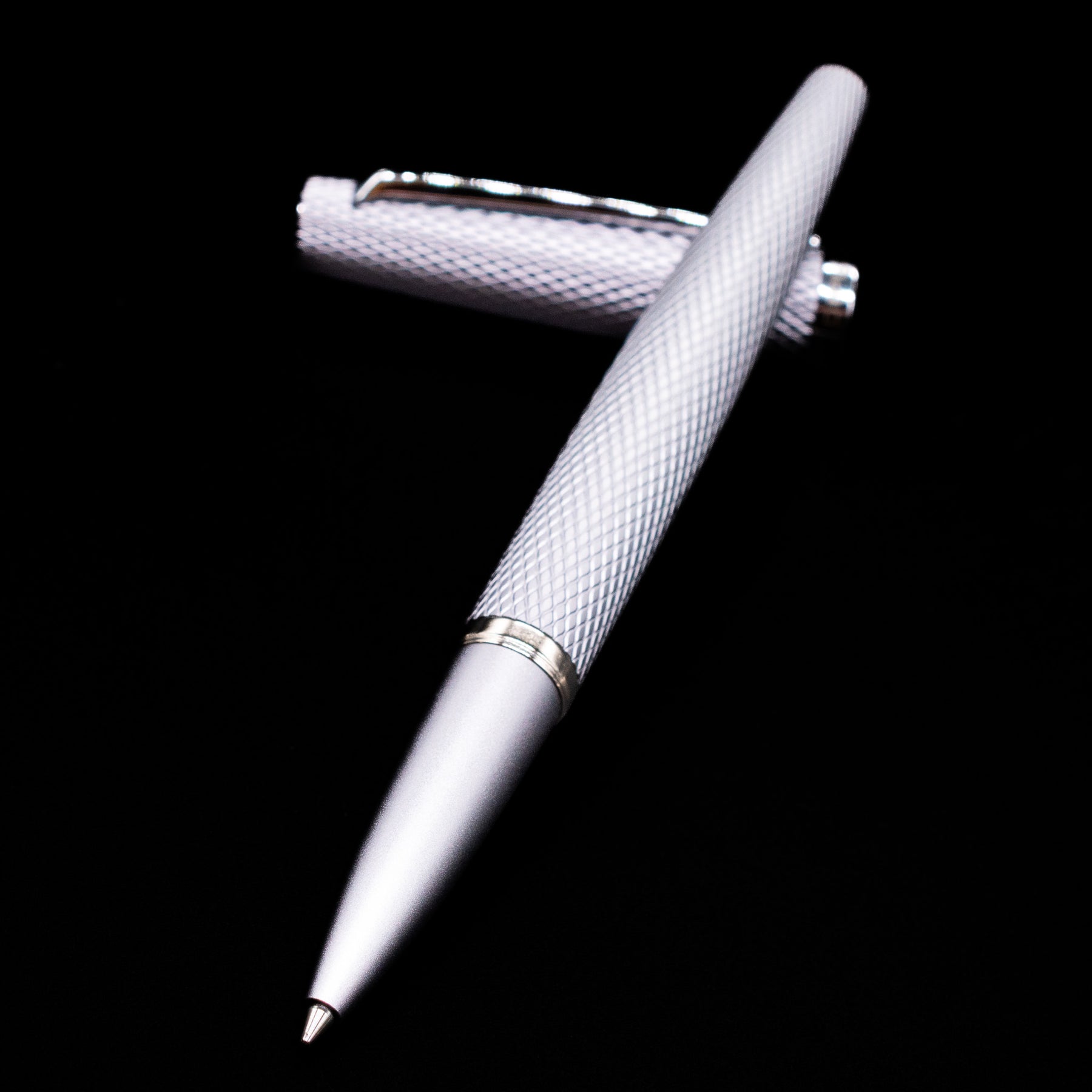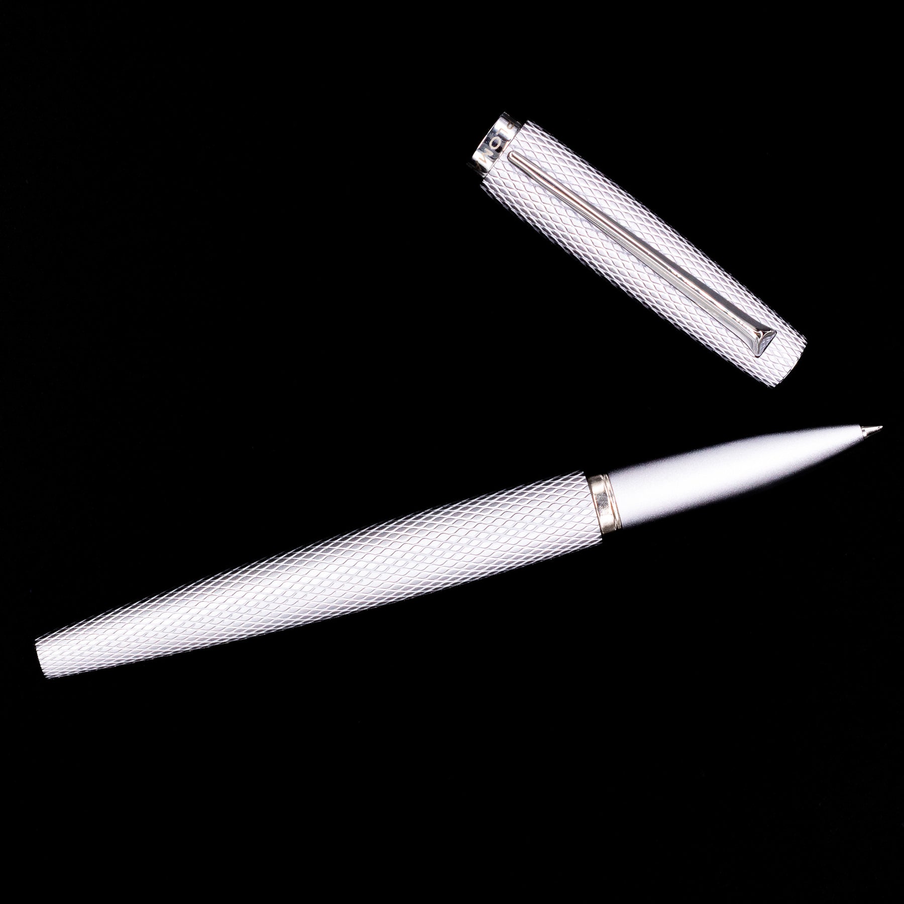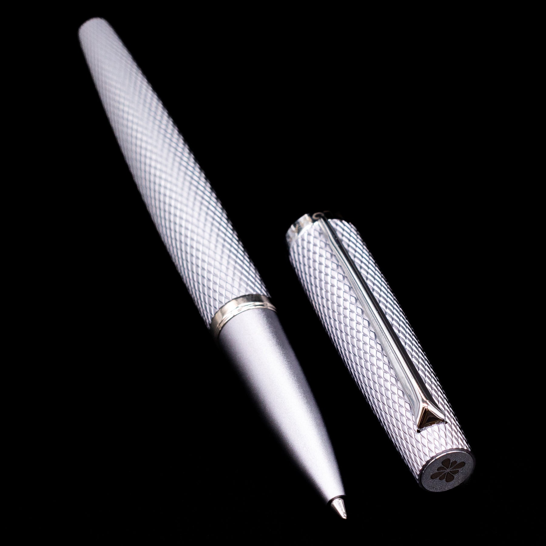Complementing the engraved body are silver PVD-coated trims, maintaining a sleek monochromatic look while adding durability and resistance to wear. The pen’s streamlined silhouette keeps it balanced and comfortable in the hand, making it suitable for both professional environments and everyday writing.