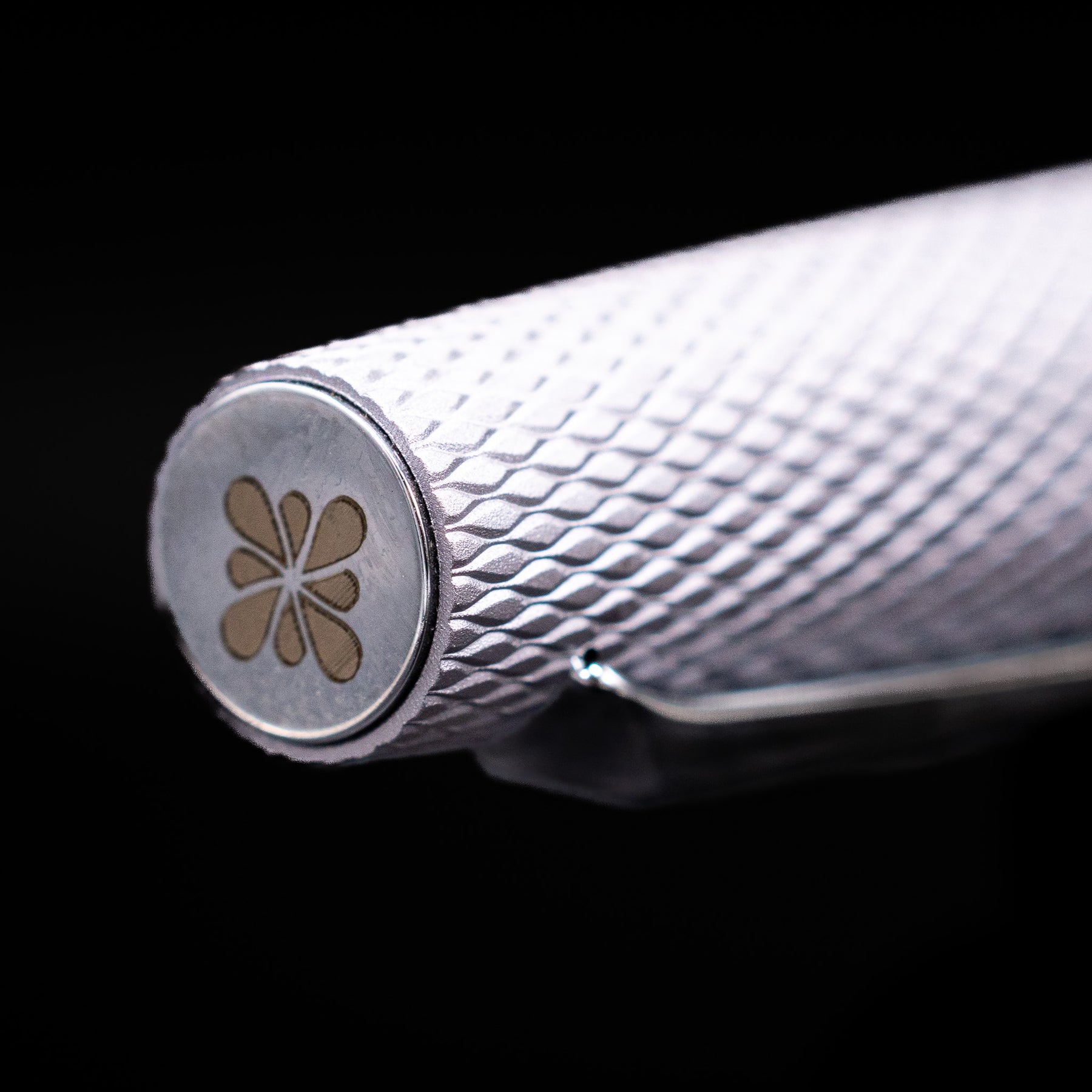 The pen features a silver anodized aluminum barrel with intricate guilloché engraving that creates a dynamic, scale-like pattern across the entire surface. The textured finish not only gives the pen a striking visual identity but also improves grip and tactile feedback while writing.