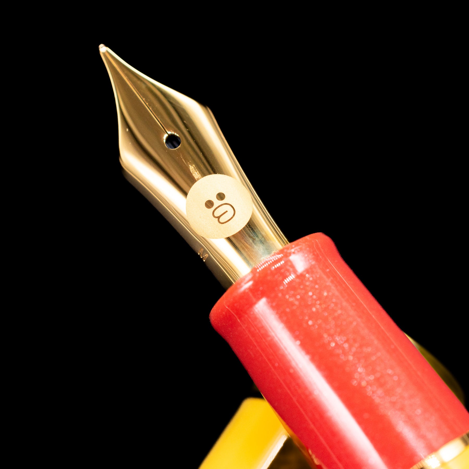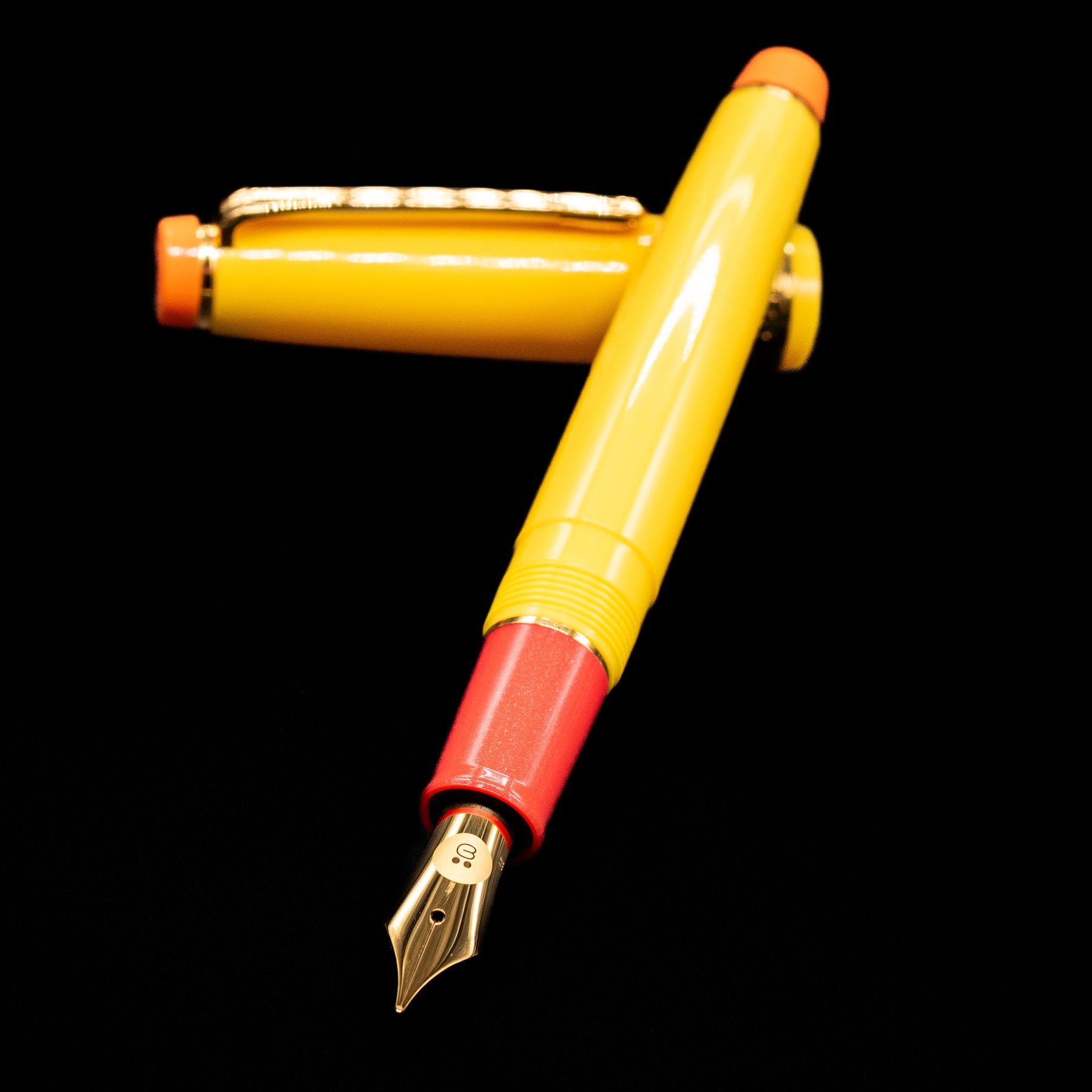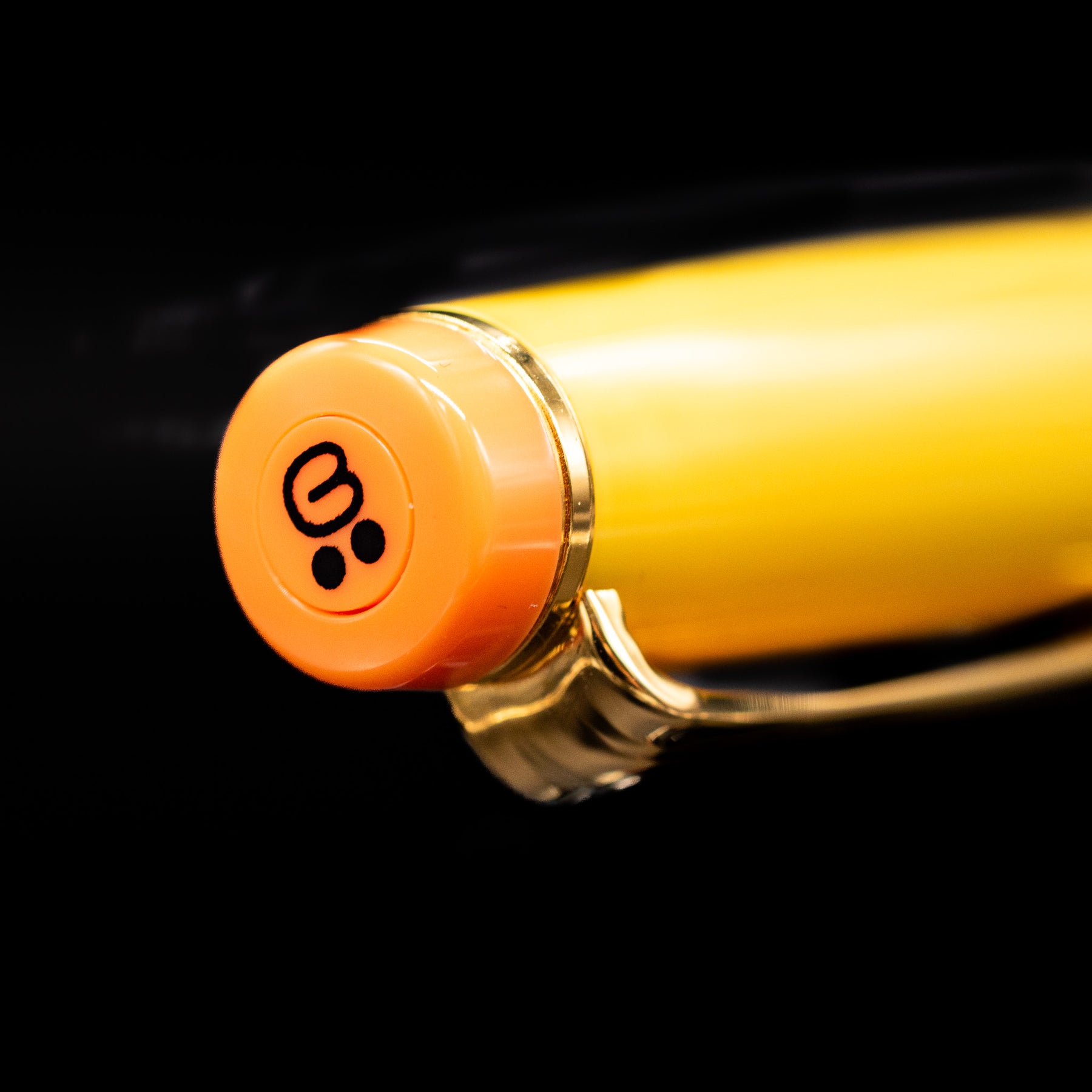 The pen features a vibrant yellow resin body, echoing Sally’s iconic color, paired with warm gold-plated trim that gives the design a polished and elegant contrast. The grip section adds a subtle visual twist with a sparkling glitter finish, adding a whimsical element that reflects the playful nature of the collaboration.