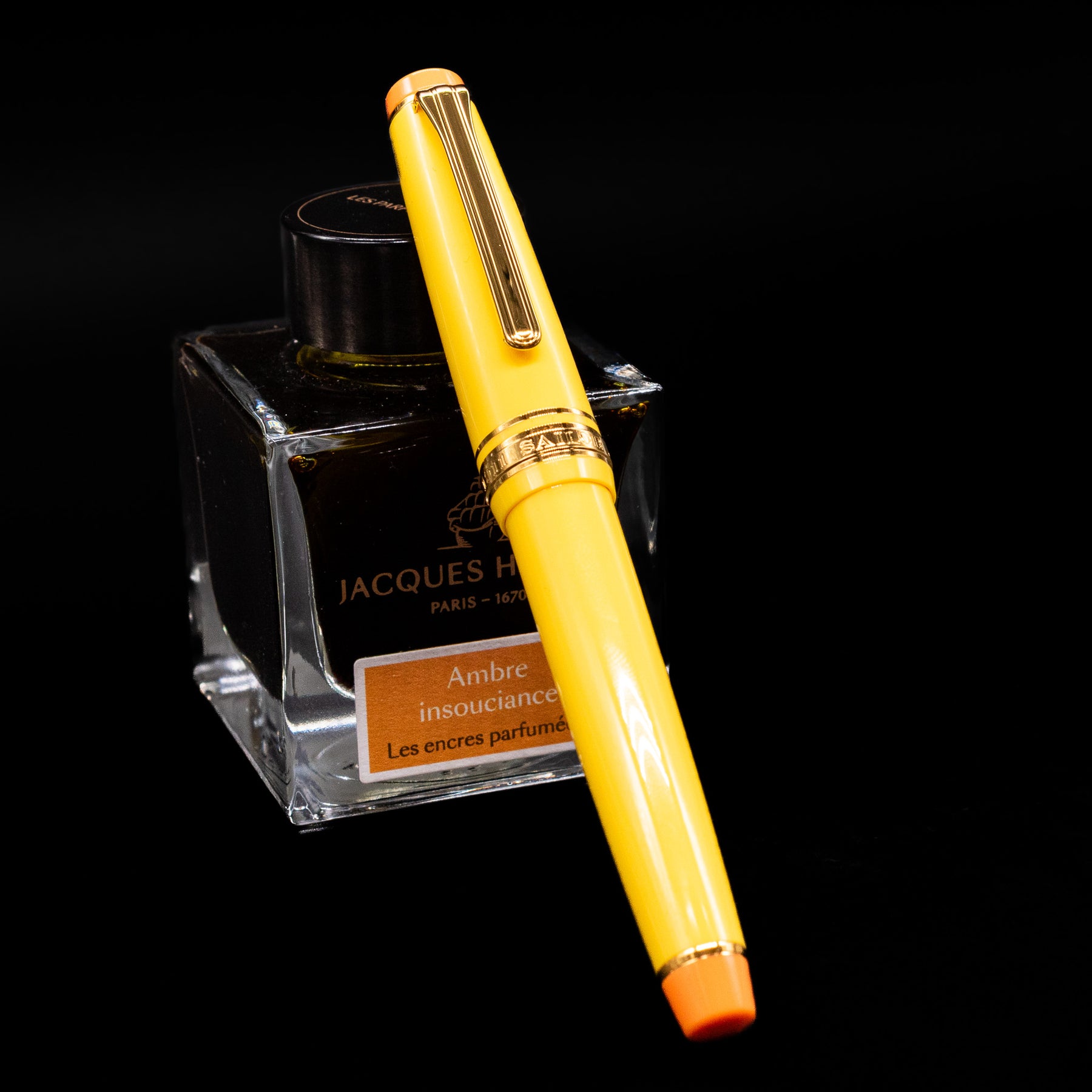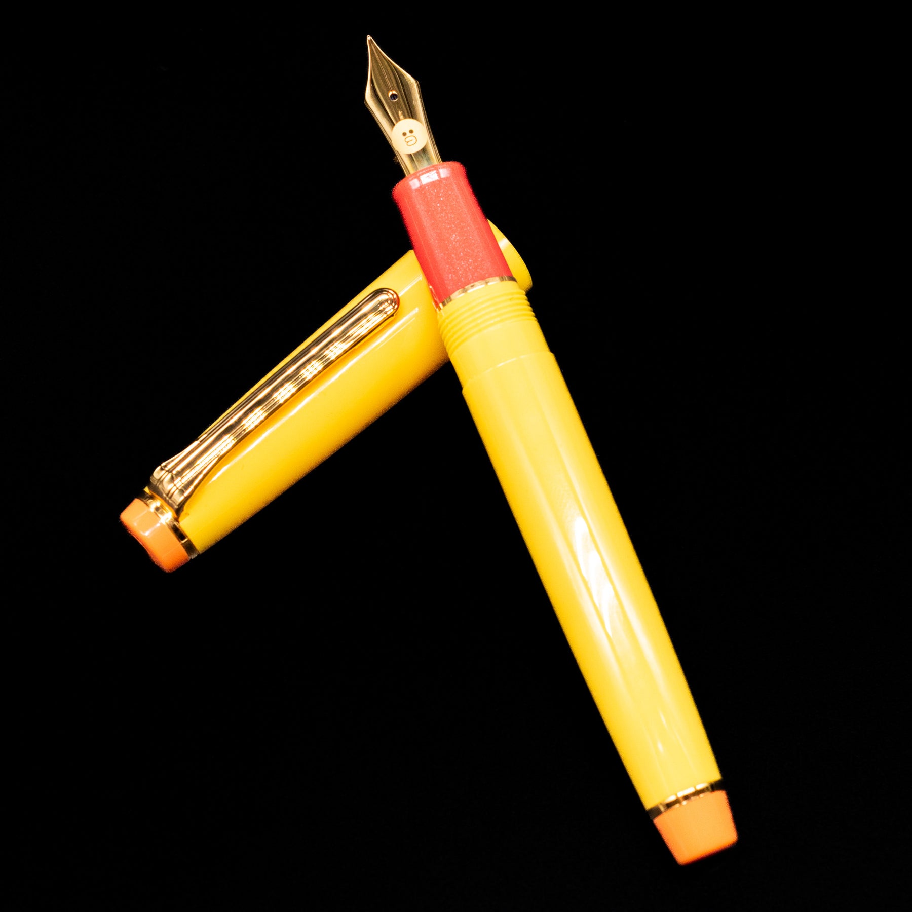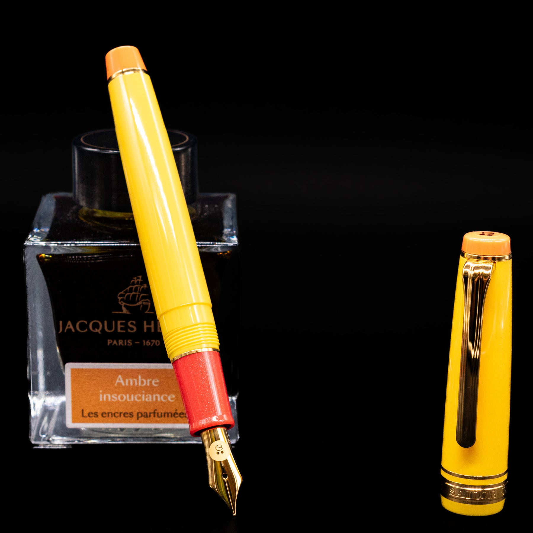 The pen features a vibrant yellow resin body, echoing Sally’s iconic color, paired with warm gold-plated trim that gives the design a polished and elegant contrast. The grip section adds a subtle visual twist with a sparkling glitter finish, adding a whimsical element that reflects the playful nature of the collaboration.