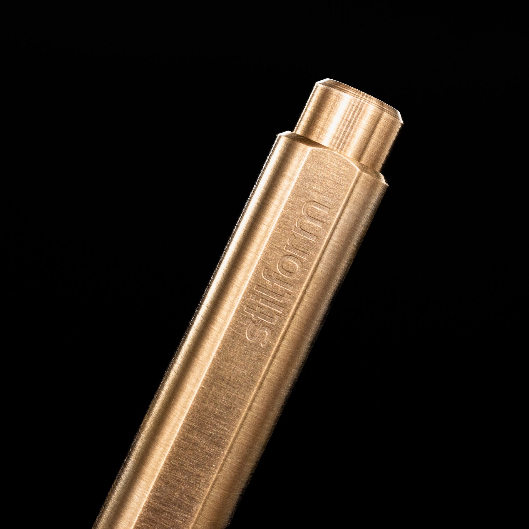 A macro shot of the logo on the bottom of the Stilform FLOW Rollerball Pen – Brass Radial Brushed.