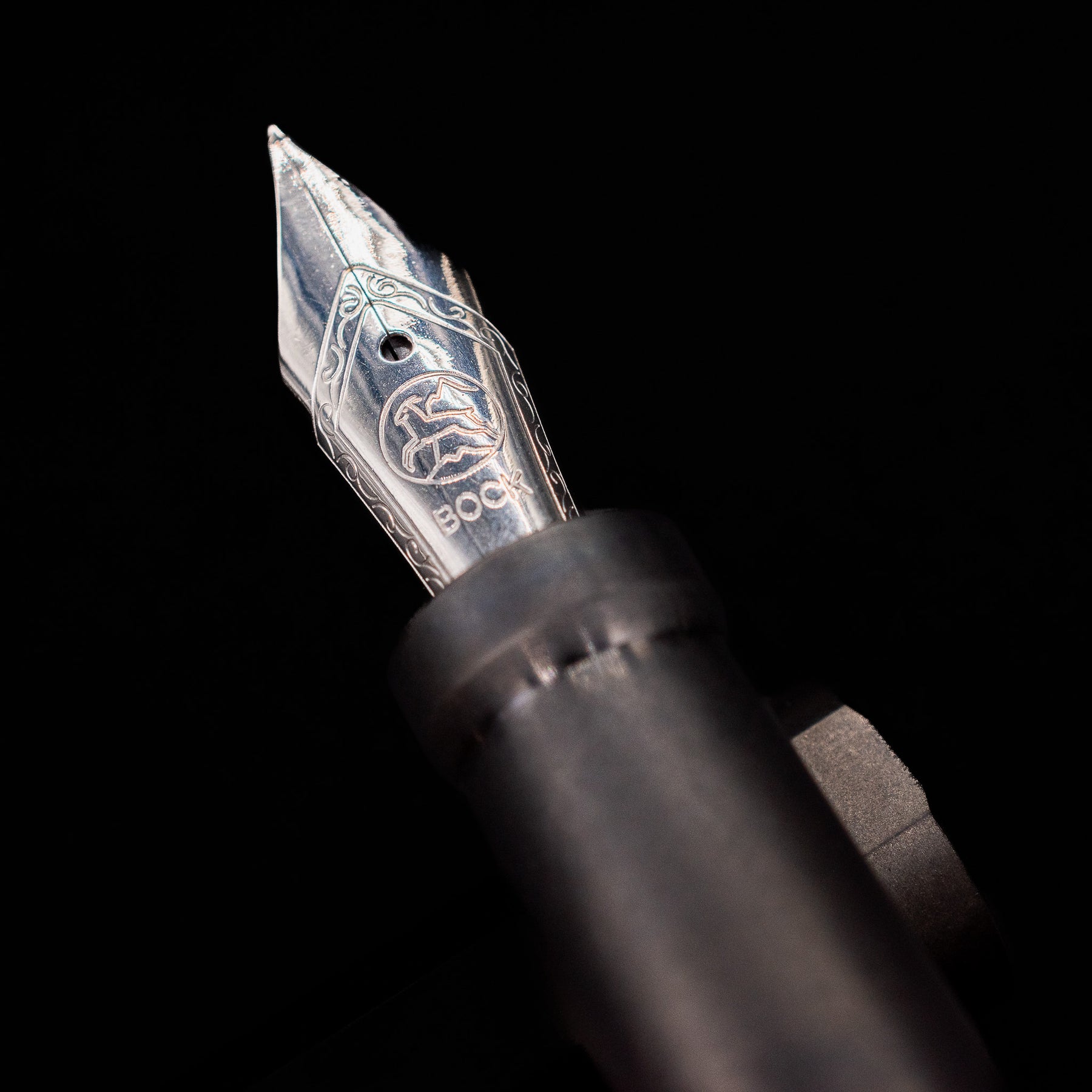 A macro shot of the nib with its intricate detailing and logo engraving for the Stilform INK Fountain Pen – Titanium DLC.