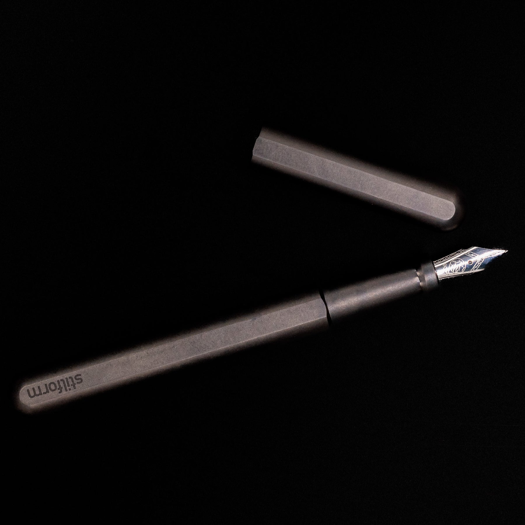 Stilform INK Fountain Pen – Titanium DLC laying across its own cap, crossed, with a focus on the nib.