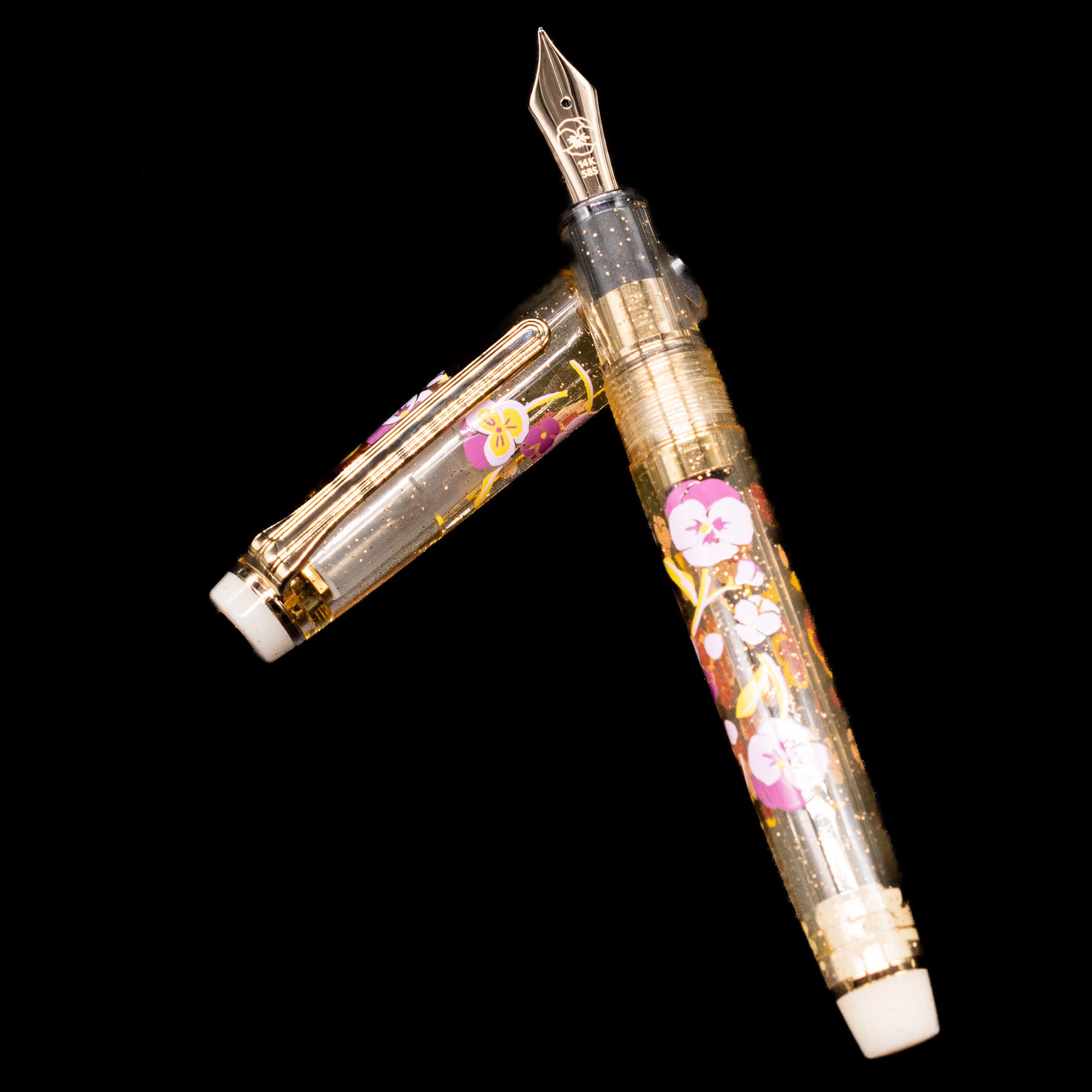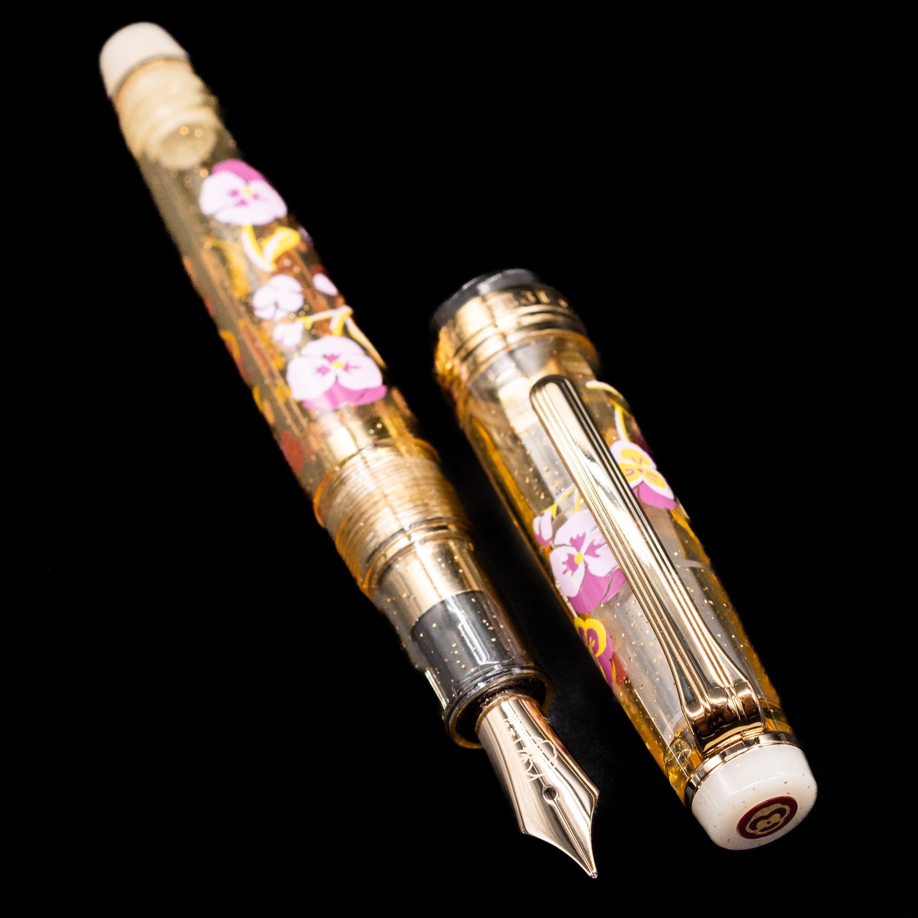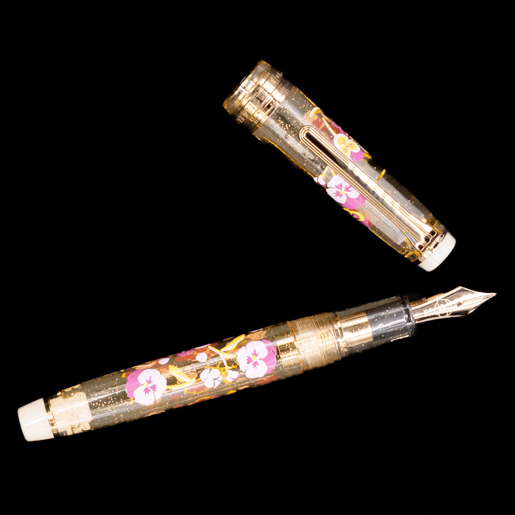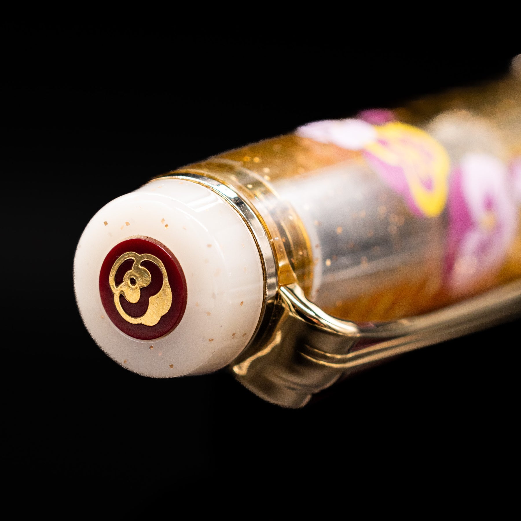 The barrel and cap are finished in a gentle soft gold/clear resin that evokes the delicate petals of cherry blossoms in full bloom. Subtle shimmer and tonal variation give the resin depth and movement, creating a refined palette that feels both artisanal and timeless. Polished gold-plated trim enhances the elegance of the design while keeping the overall look clean and contemporary.