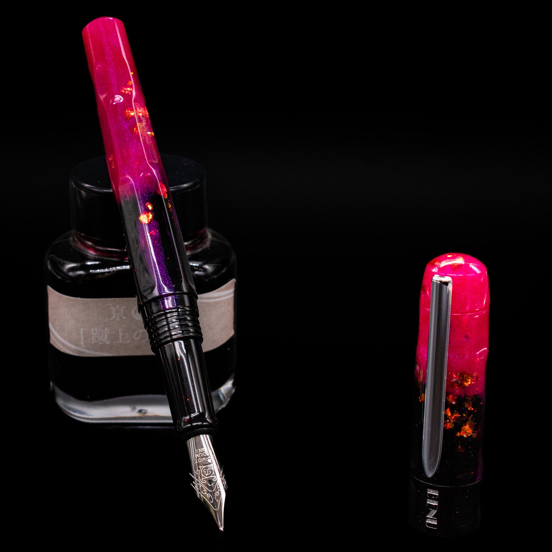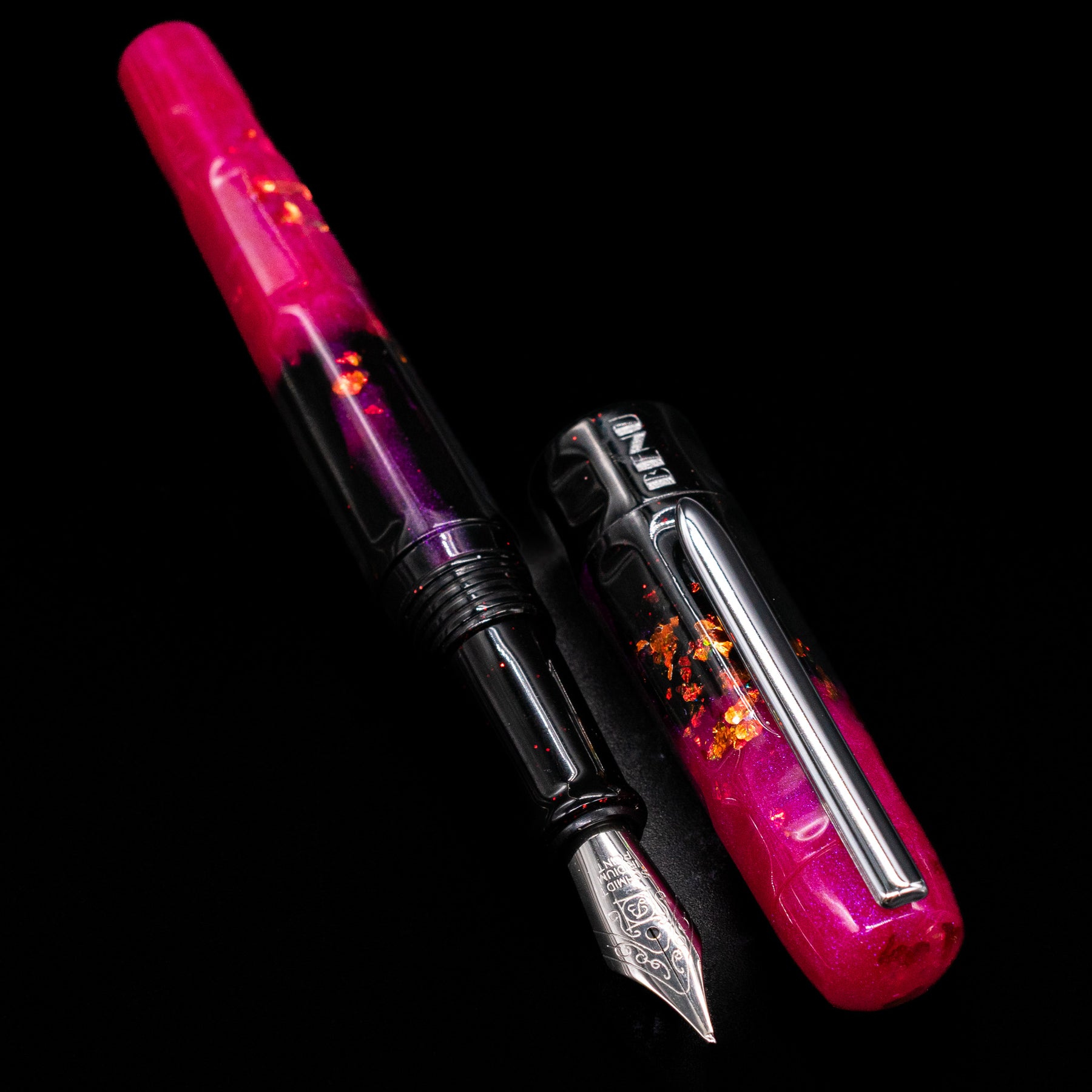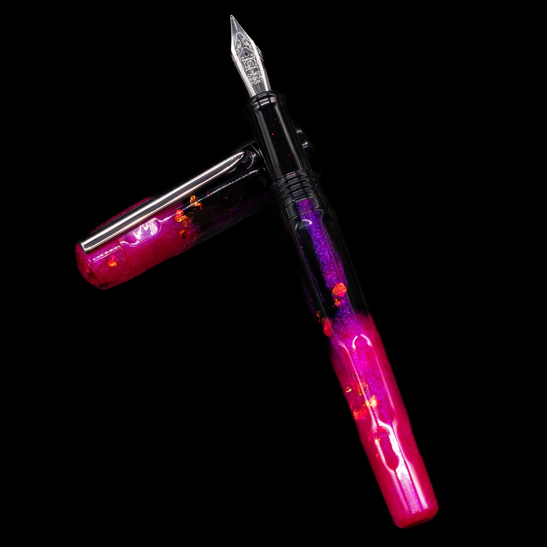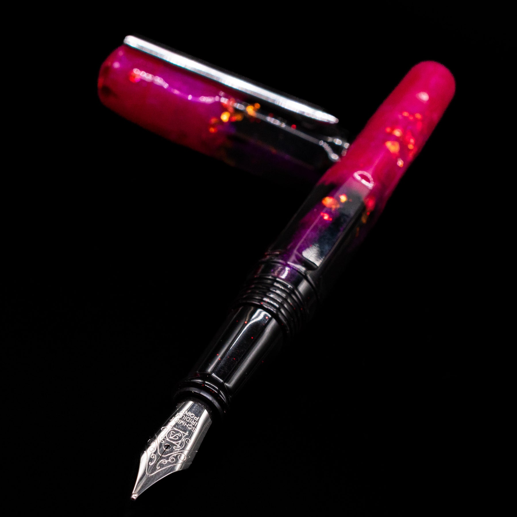 Brilliant violet, magenta, rose, and copper resin swirls — each pen completely unique
