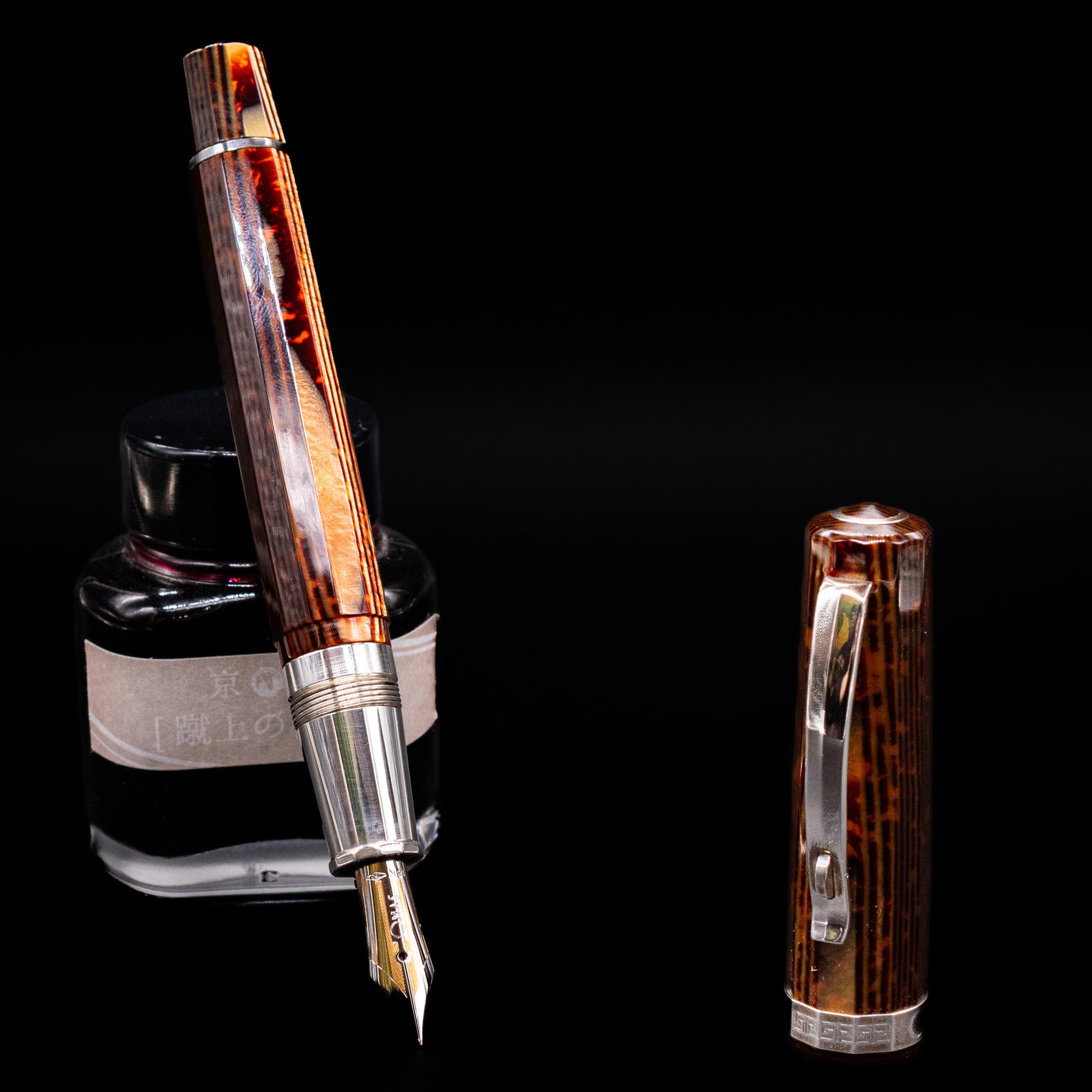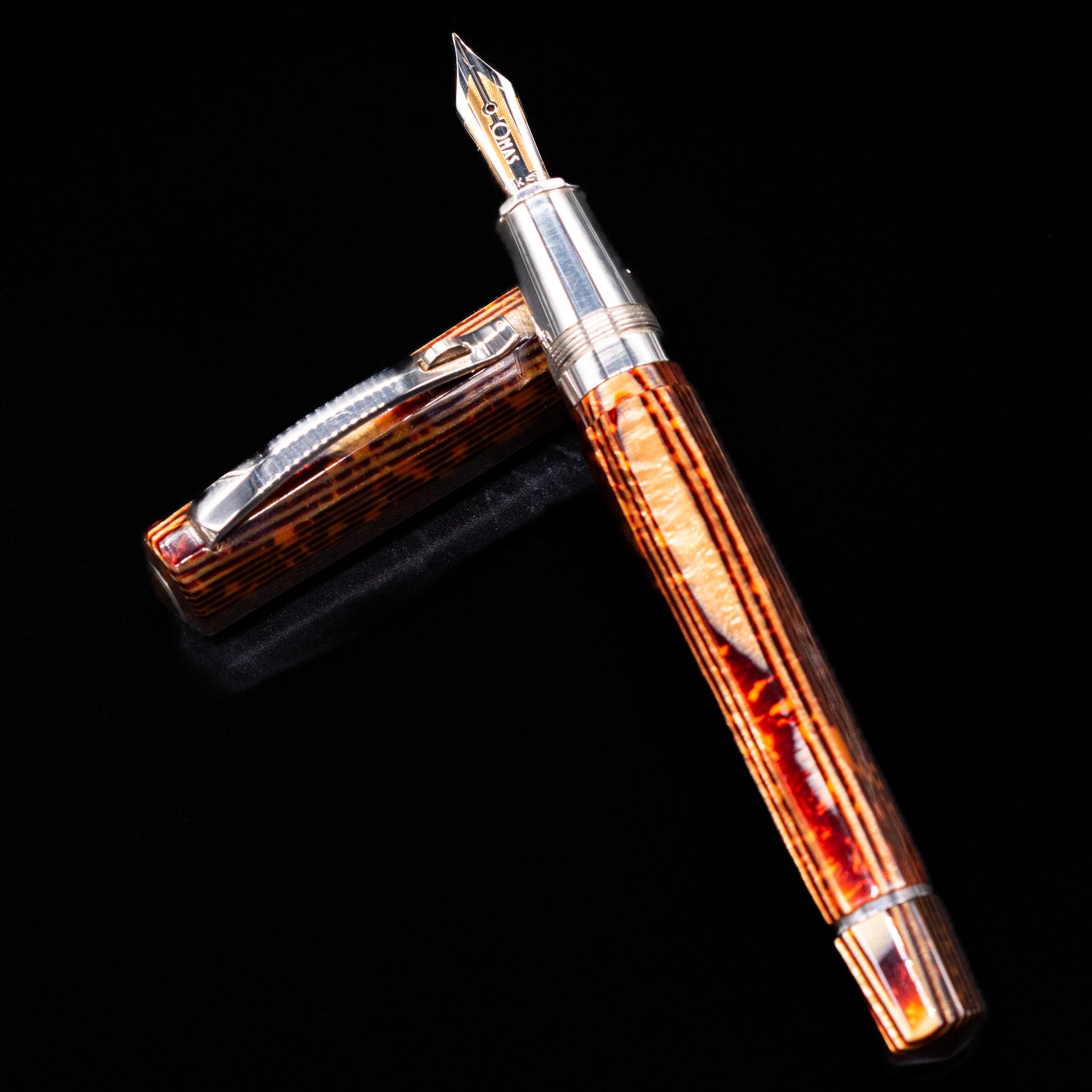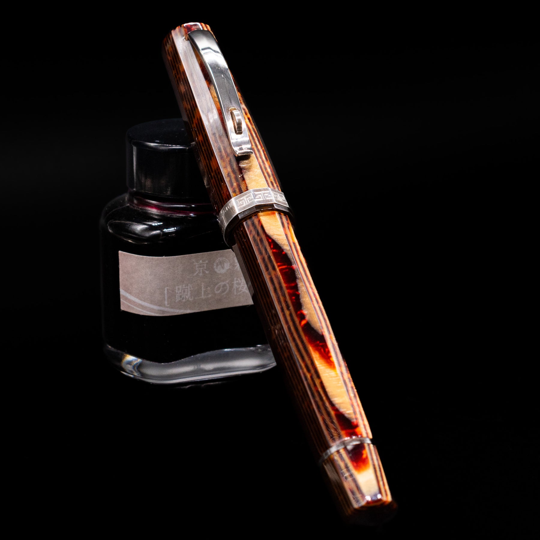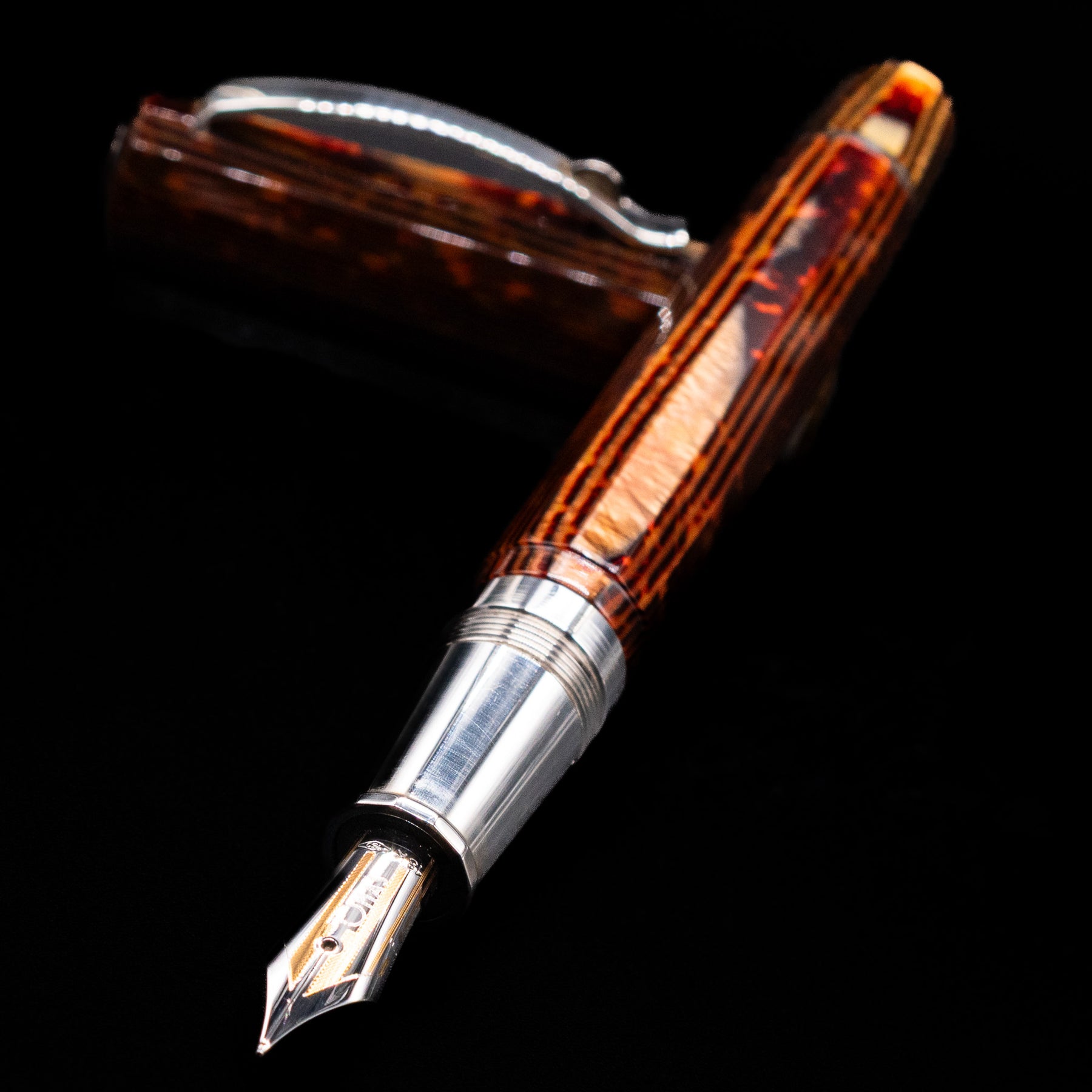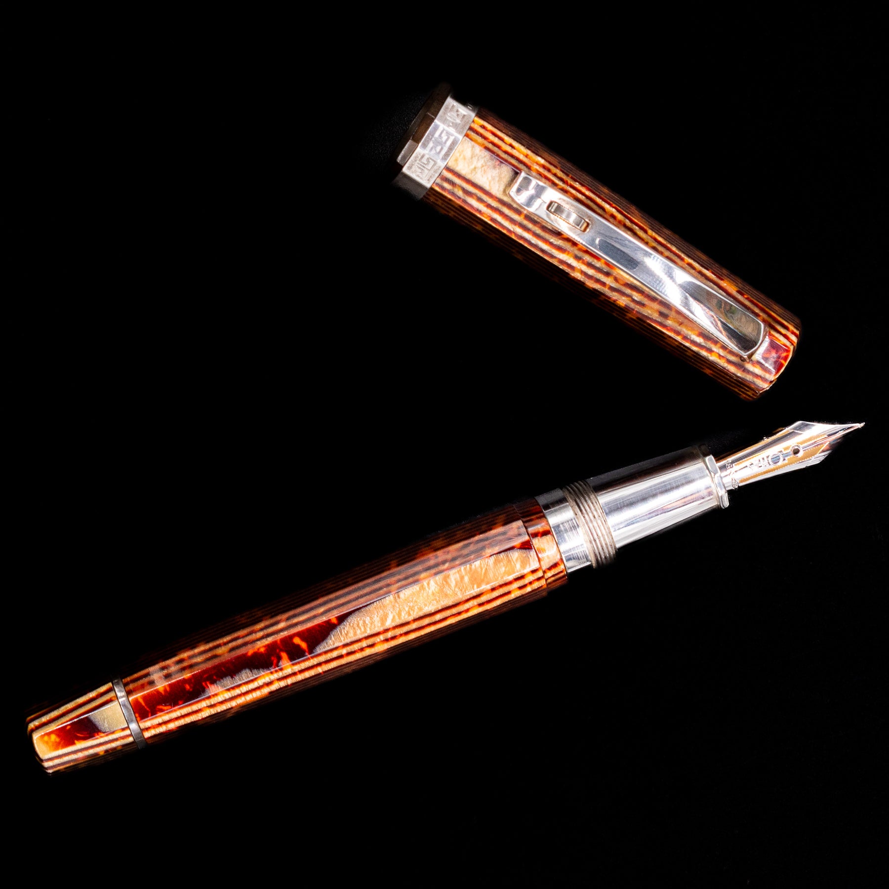 Each pen’s barrel and cap exhibit warm, earthy bronze tones accented with black striations and iridescent highlights that shift subtly as the angle of light changes. The dynamic depth and organic movement of the Arco pattern are what make every example unique, while matching between components is a trait only found in the most meticulously produced celluloid editions.