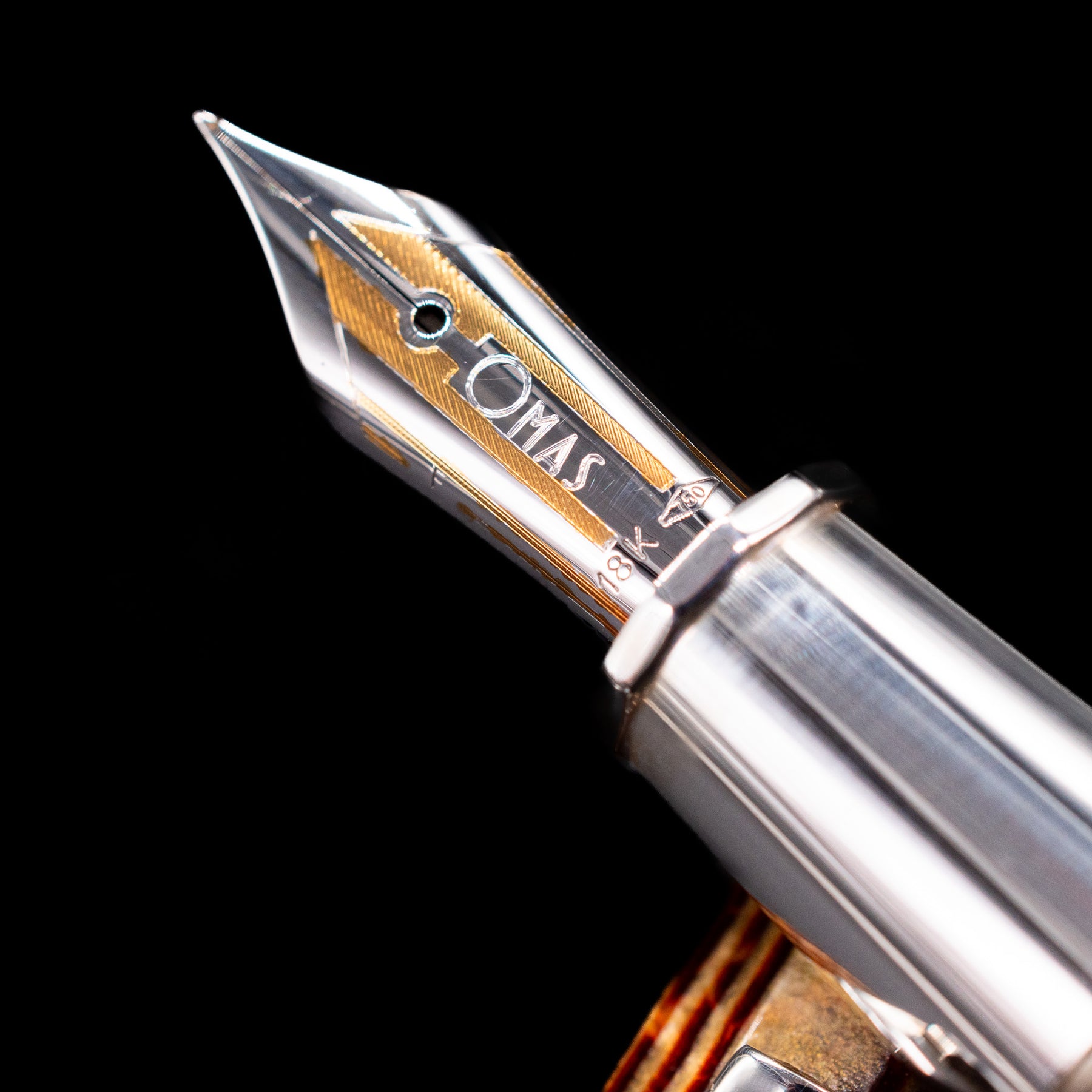 A macro shot of the nib with its intricate detailing and logo engraving for the OMAS Grand Paragon Arco Bronze Fountain Pen - Preowned.