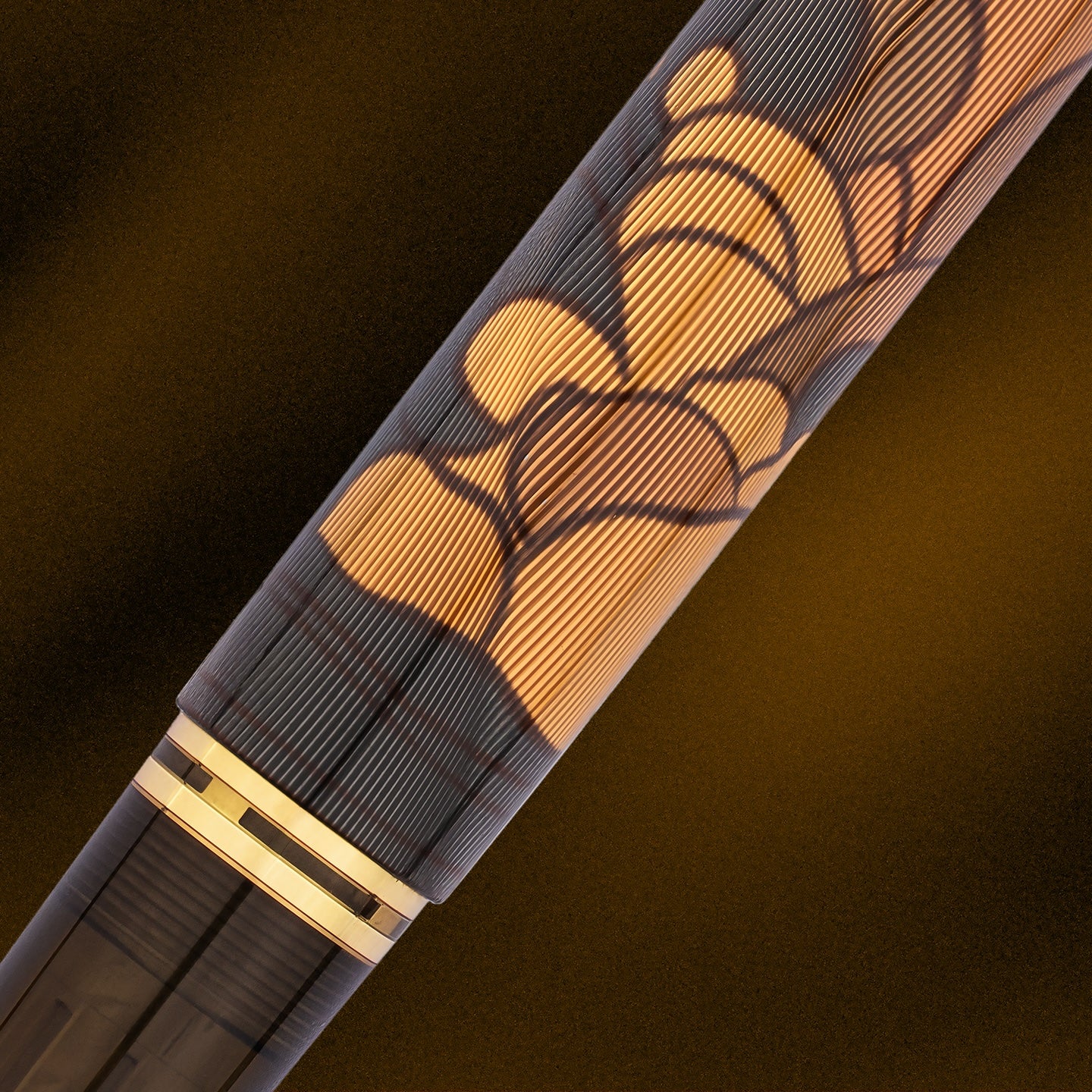 The barrel is crafted using Pelikan’s sophisticated Aurora process, where finely engraved guilloché structures are layered beneath multiple coats of lacquer. This technique creates a luminous, dimensional surface that enhances both the visual complexity and tactile quality of the pen. The design is framed by semi-transparent warm brown resin components, which ground the piece and connect the historic inspiration with a modern aesthetic.