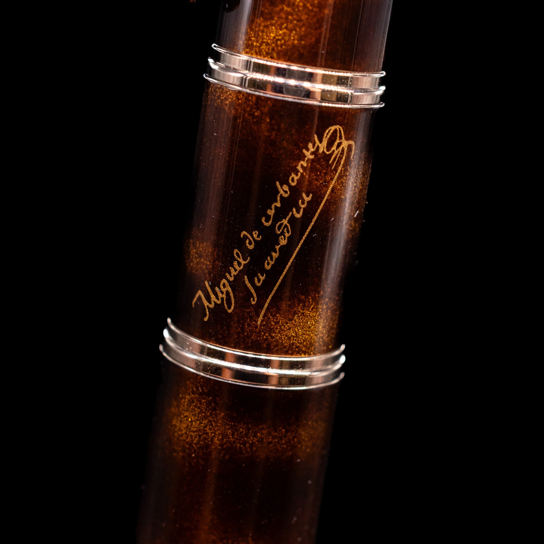 The barrel is crafted from luminous brown lacquer, a nod to the rich tones of classical Spanish manuscripts. Gold-plated trim accents the design with refined contrast, while the clip features a stylized quill motif—paying tribute to Cervantes’ penmanship. The cap ring is elegantly engraved with the phrase “El ingenioso hidalgo Don Quijote de la Mancha”, celebrating his most famous work.