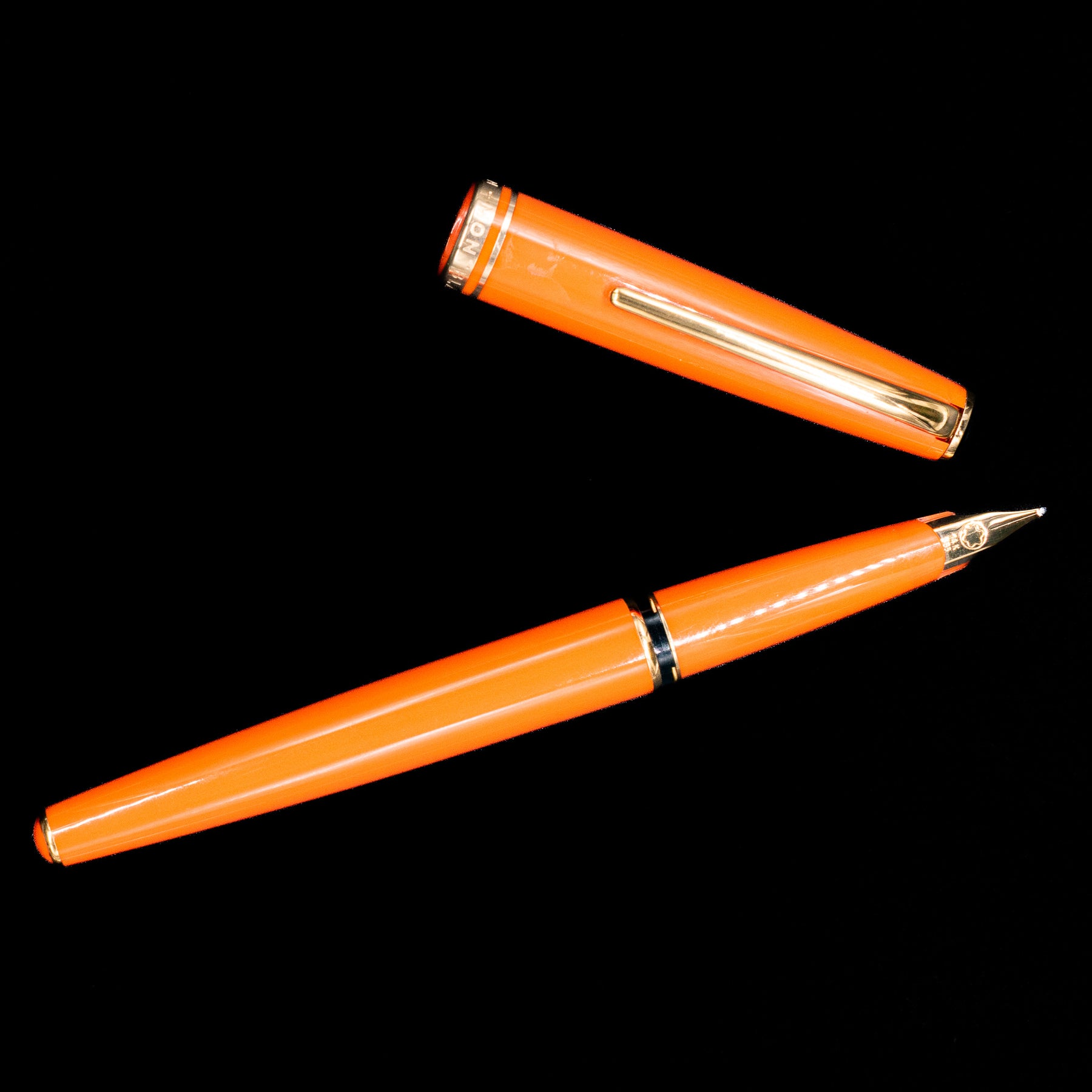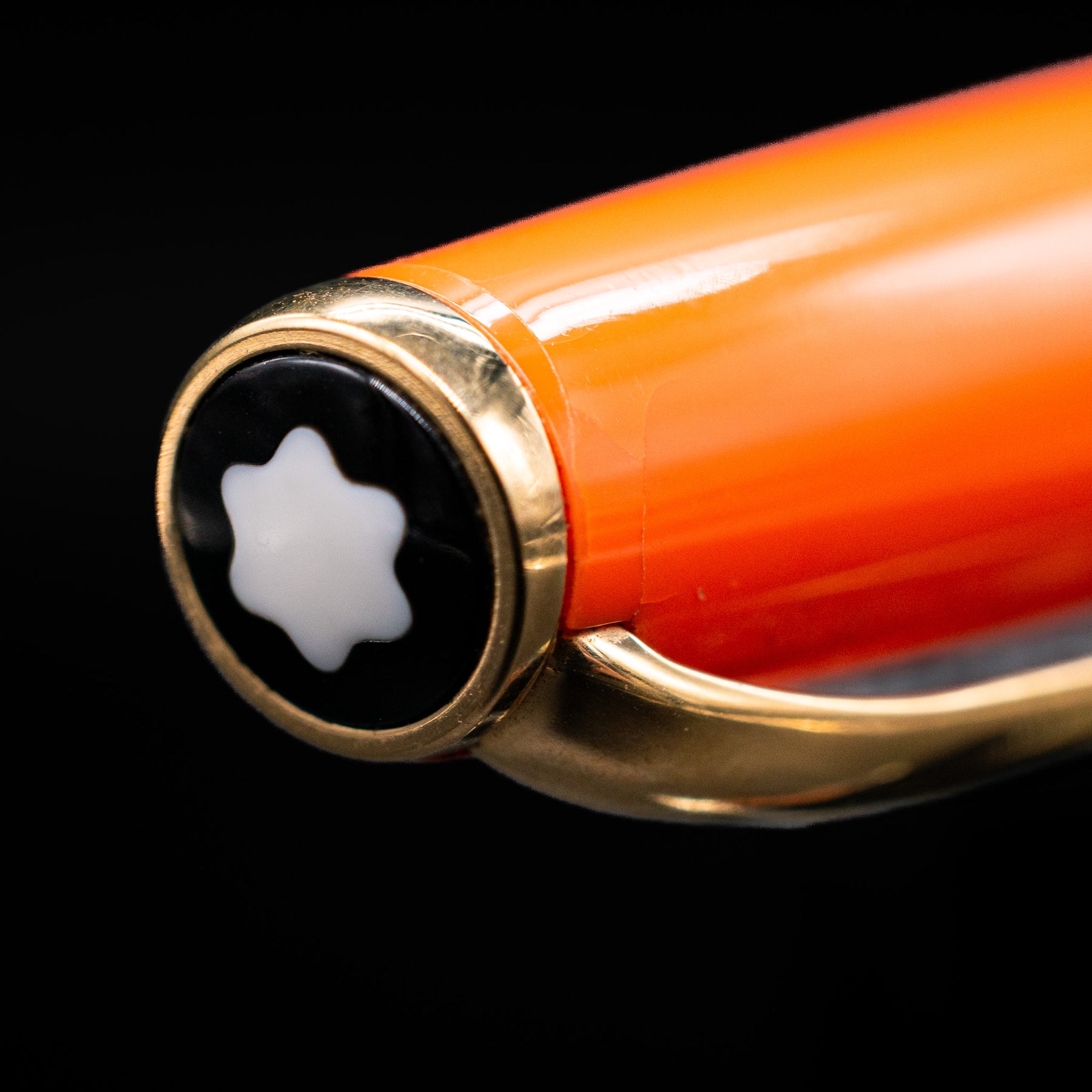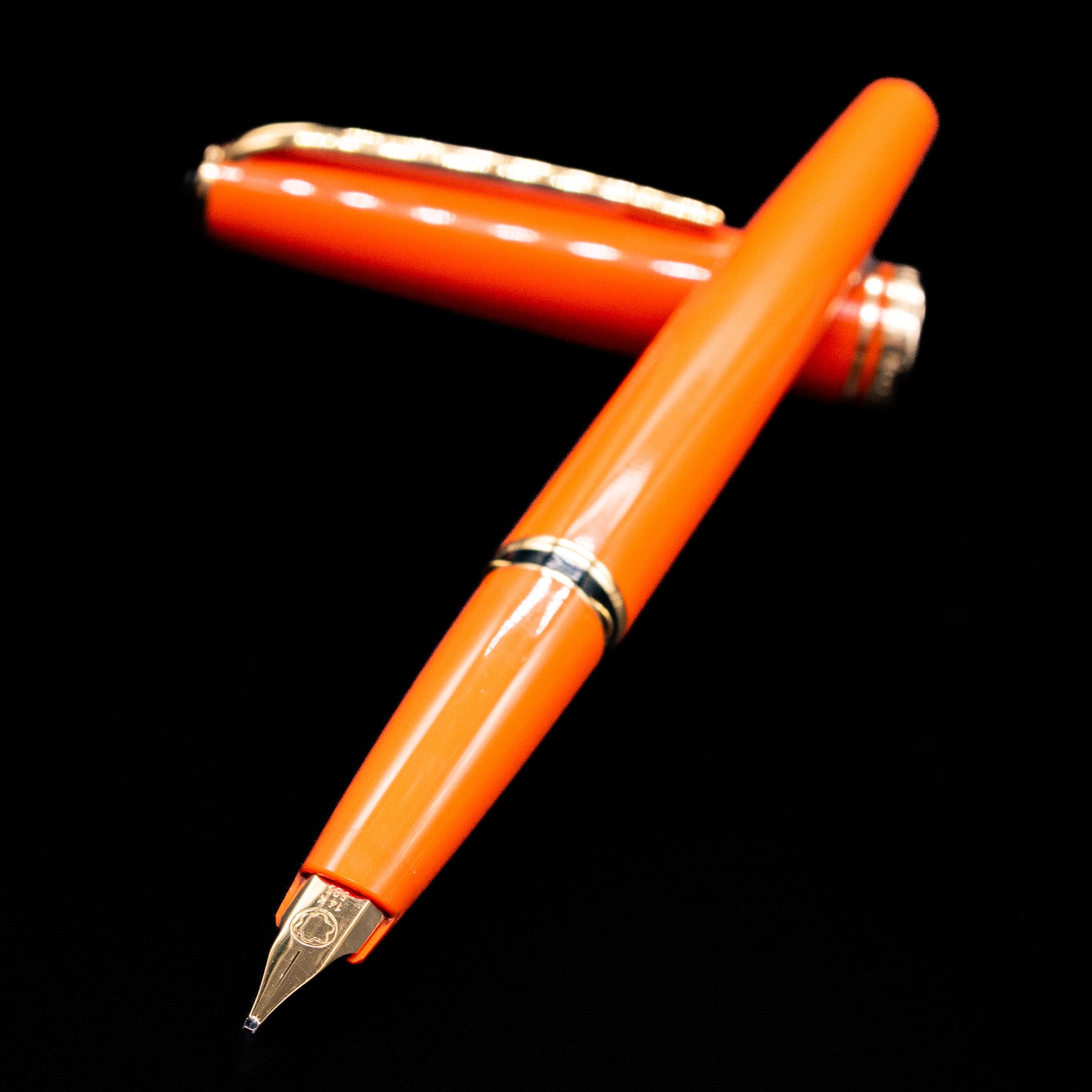 This Montblanc Generation Orange & Gold Fountain Pen has an orange resin barrel and cap with gold-plated trim and the Montblanc emblem on the top. The fountain pen has a 14K gold nib that writes smoothly and beautifully, while the cartridge or converter filling system allows you to use bottled ink or cartridges.