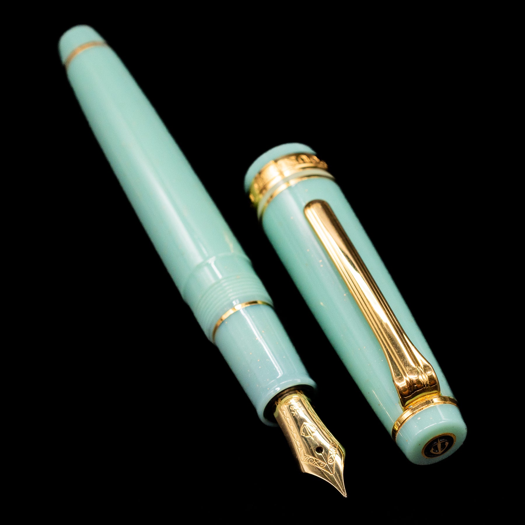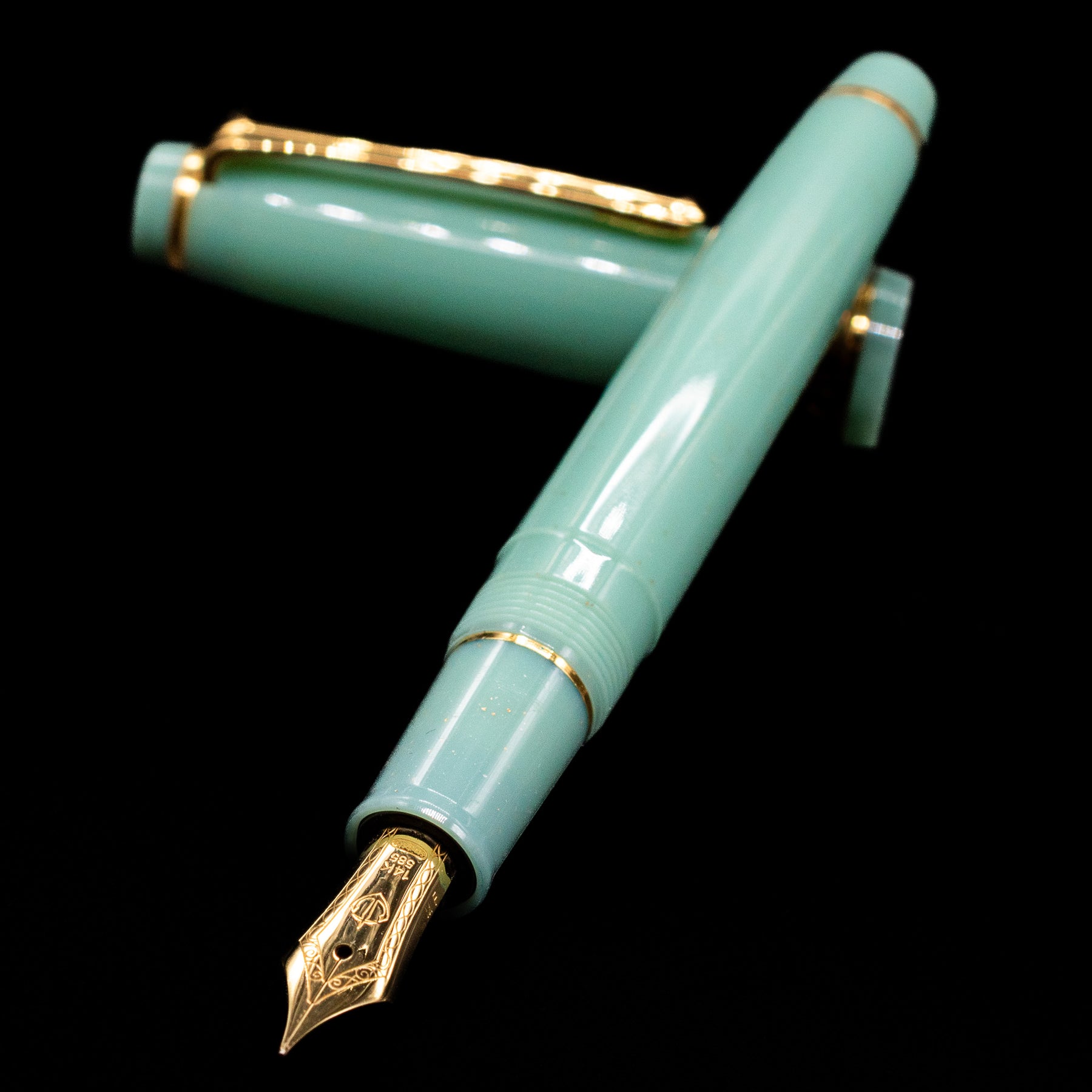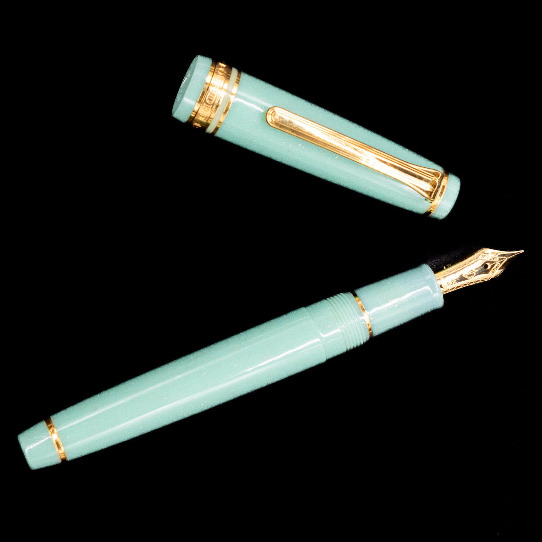 Finished in a light, shimmering pistachio colored resin inspired by mythical depths, the Dragon Palace body evokes the drama and beauty of its namesake. The cap and barrel fit seamlessly, offering a secure closure and balanced weight for smooth, comfortable writing, whether you're signing correspondence or journaling. Inside lies Sailor’s renowned 14k gold nib, tuned for crisp, expressive ink flow — delivering a fluid, controlled line that shows off the character of your ink.