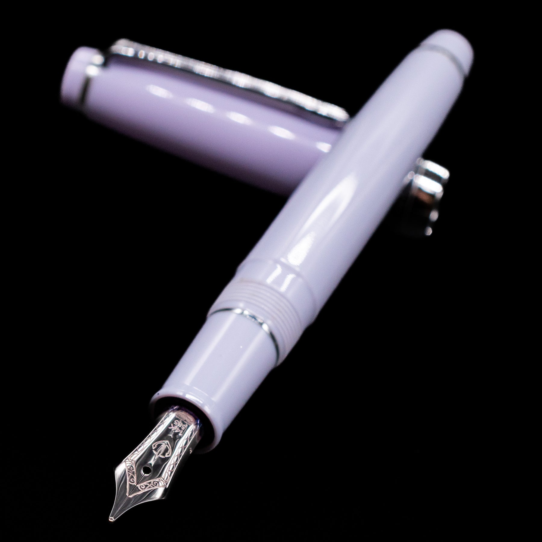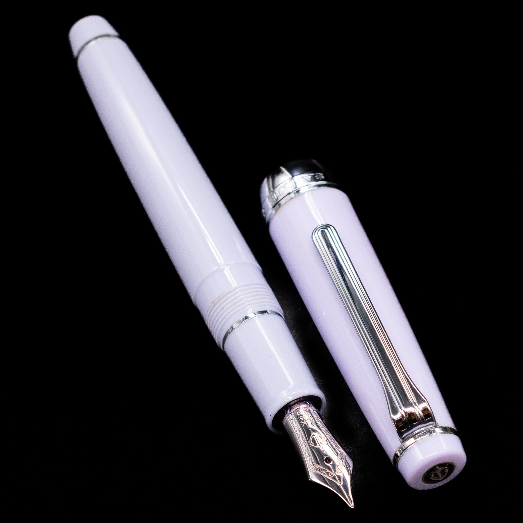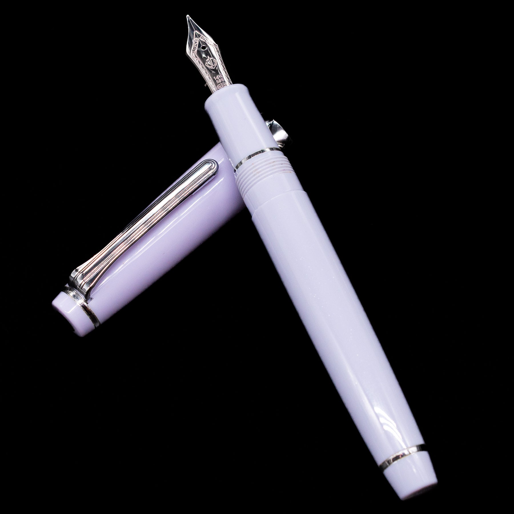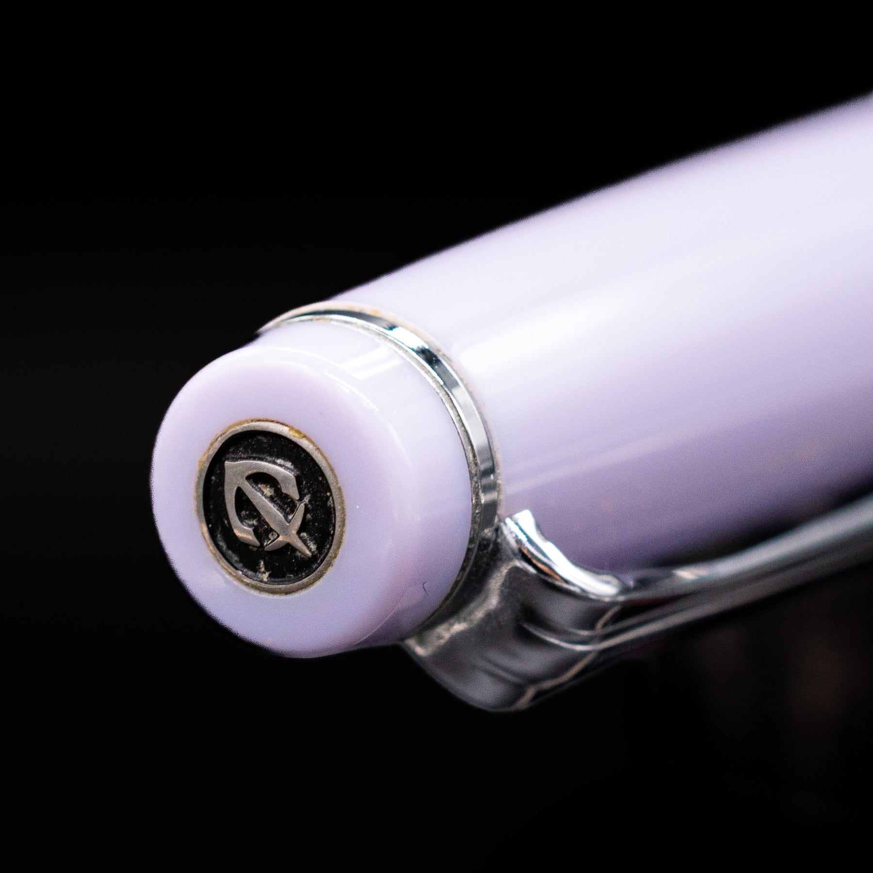 Rhodium-trimmed silver fittings — clip, rings, and cap accents give a frosty, modern contrast to the pastel body.