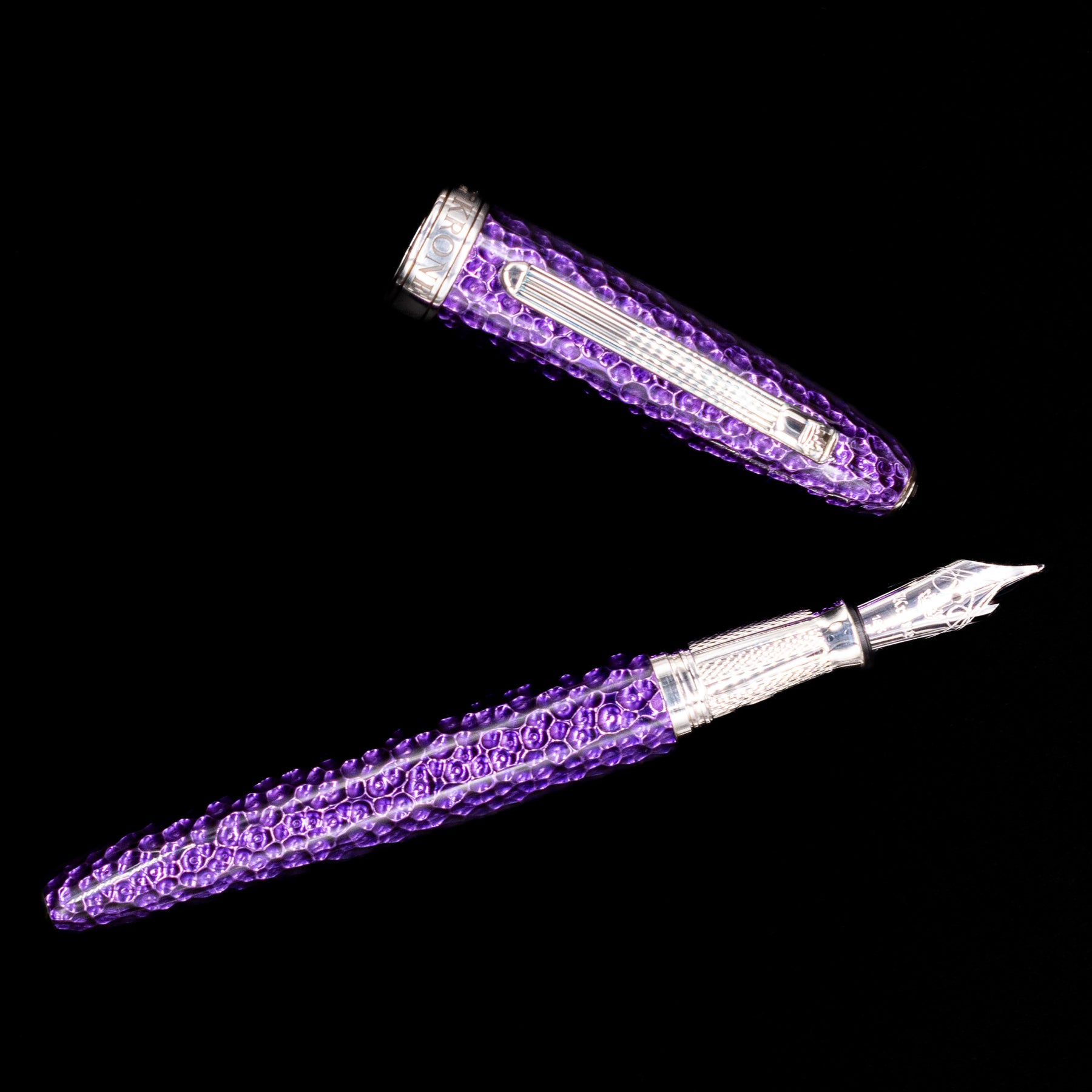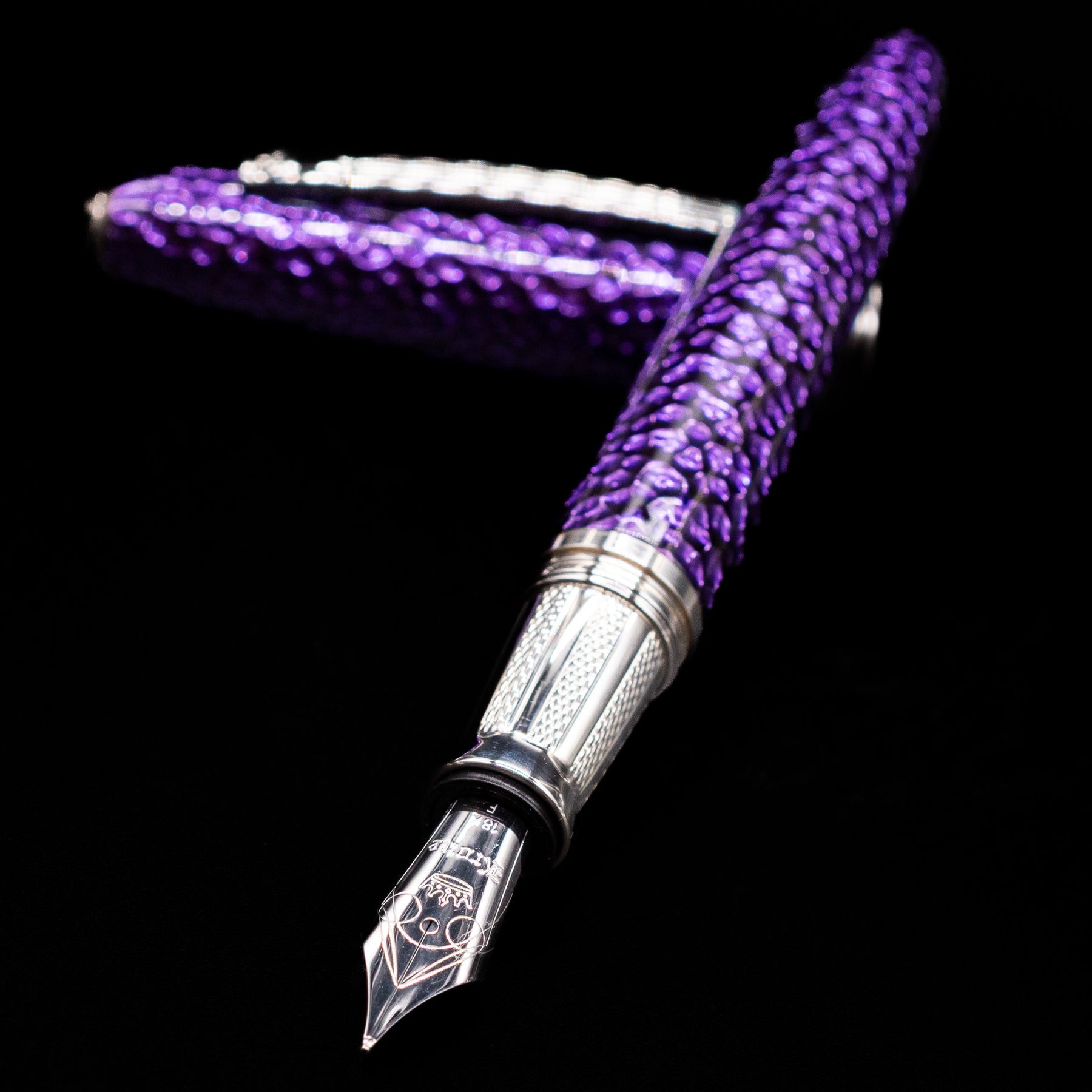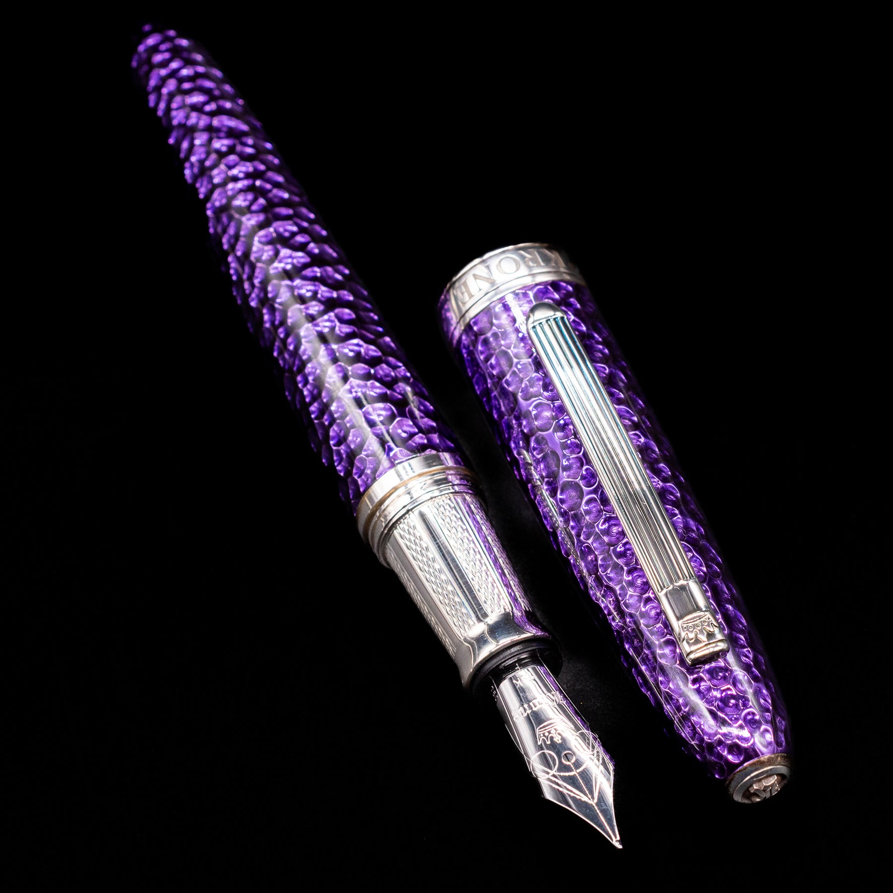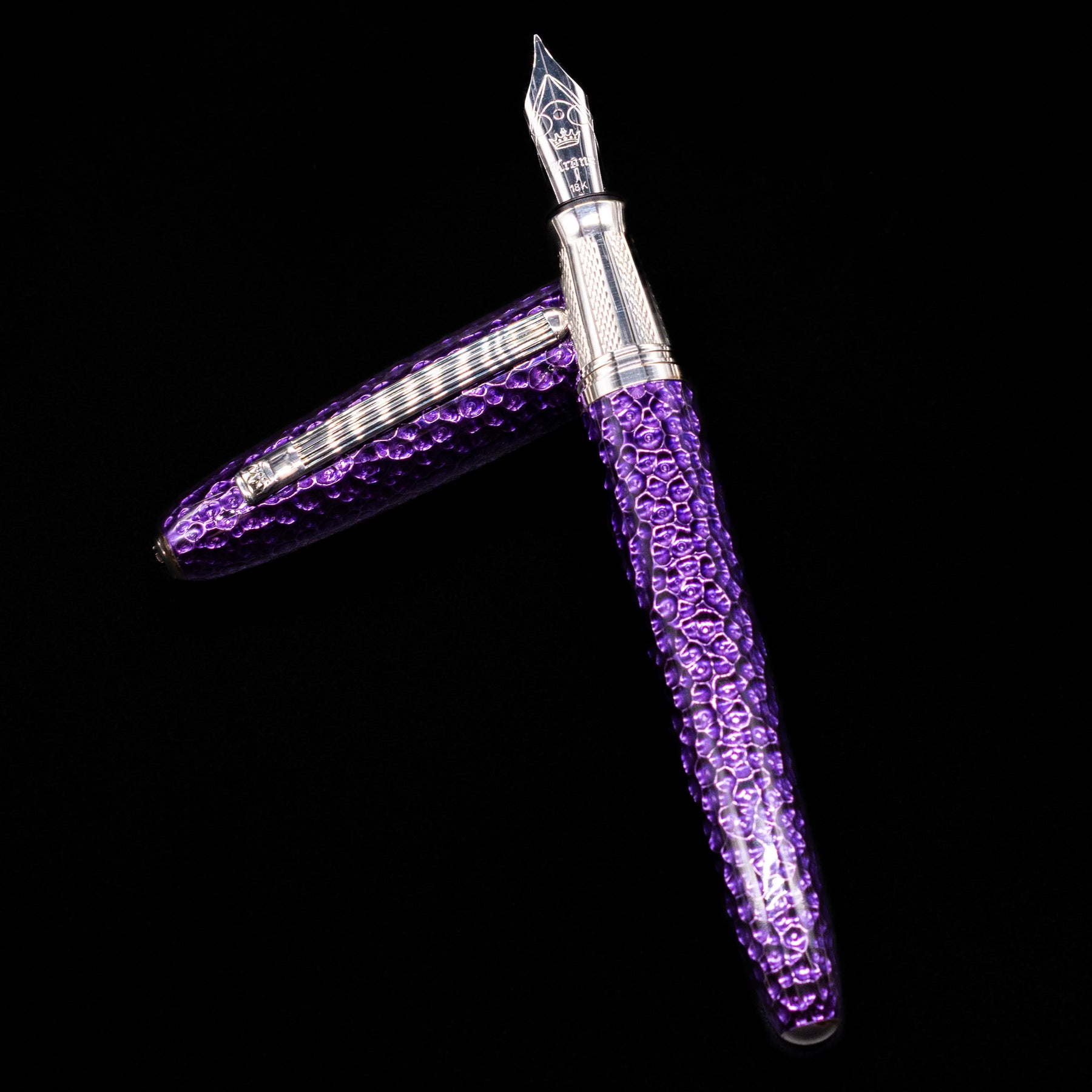 Krone Spark Hammered Purple Fountain Pen - Preowned laying across its own cap, crossed, with a focus on the nib.