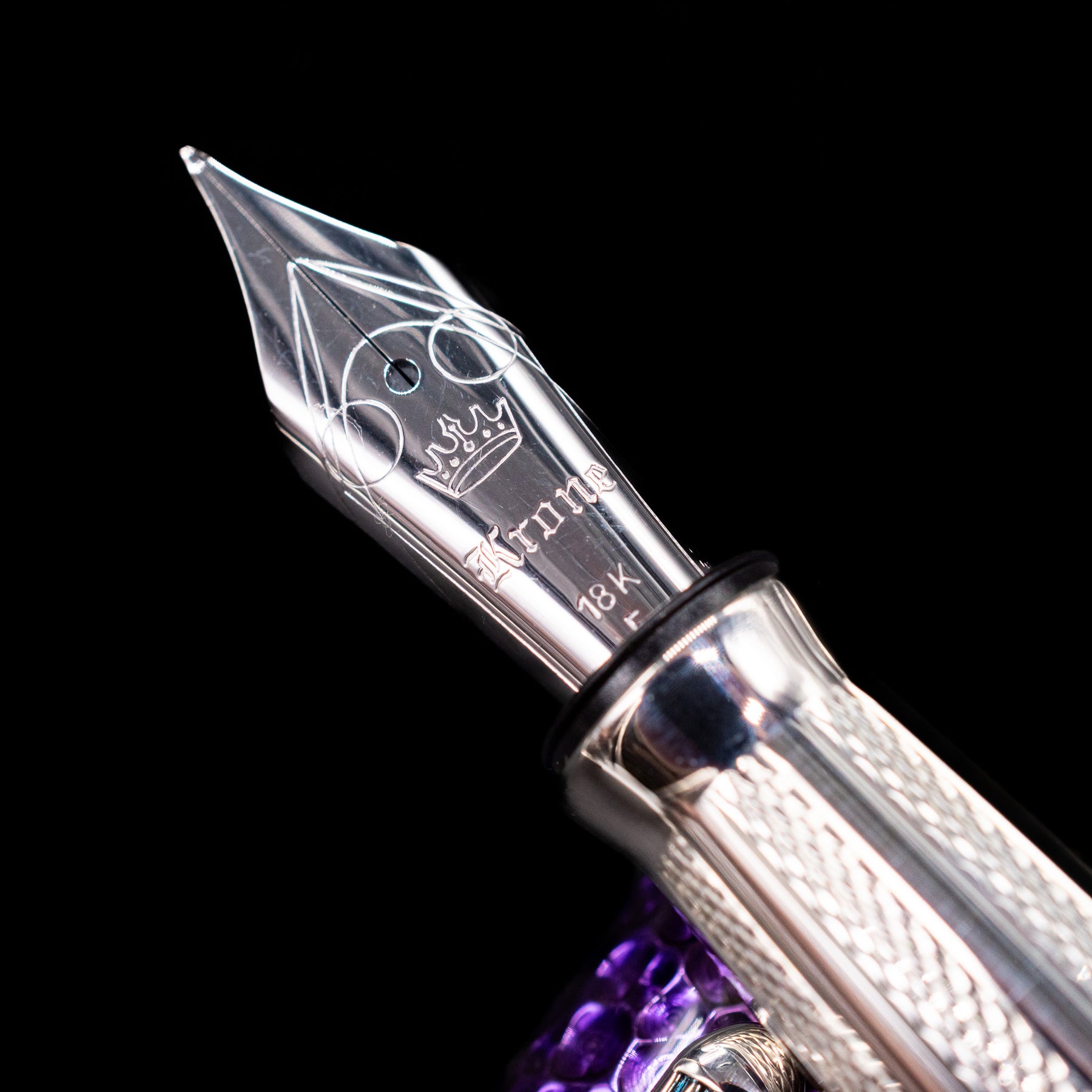 A macro shot of the nib with its intricate detailing and logo engraving for the Krone Spark Hammered Purple Fountain Pen - Preowned.