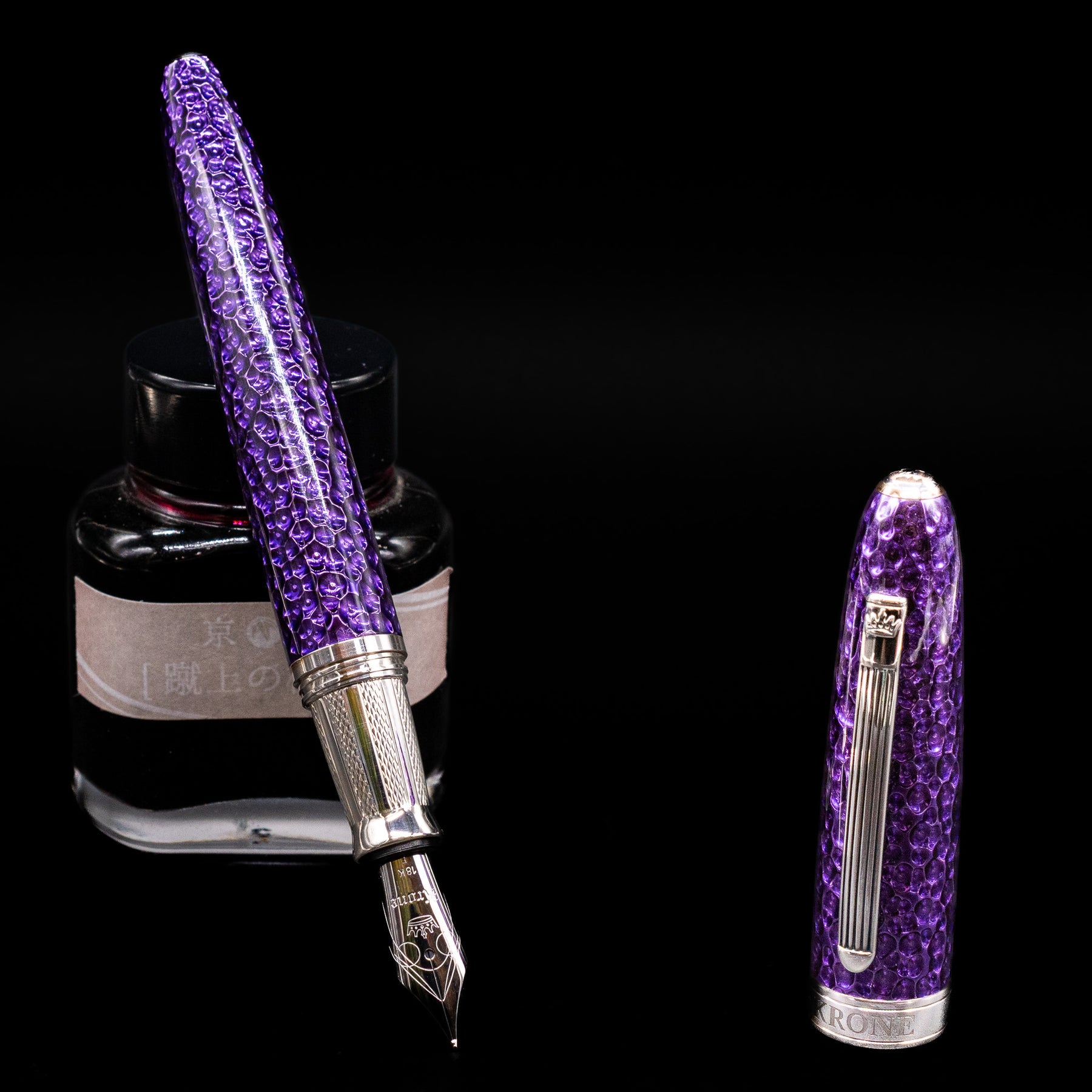 Krone Spark Hammered Purple Fountain Pen - Preowned leaning on an ink bottle uncapped showcasing the detailing on the nib.