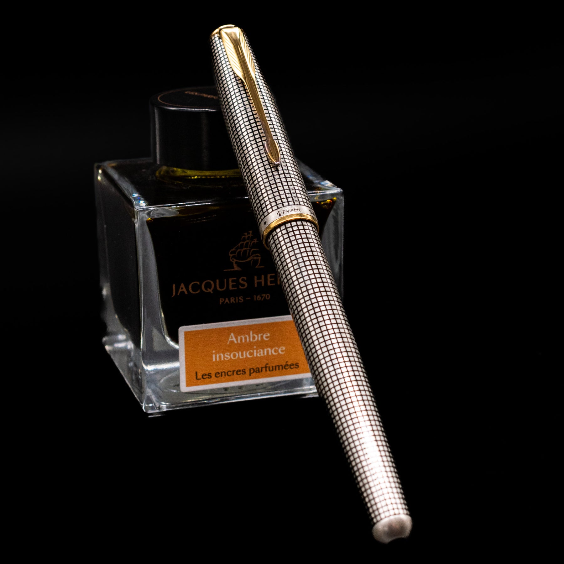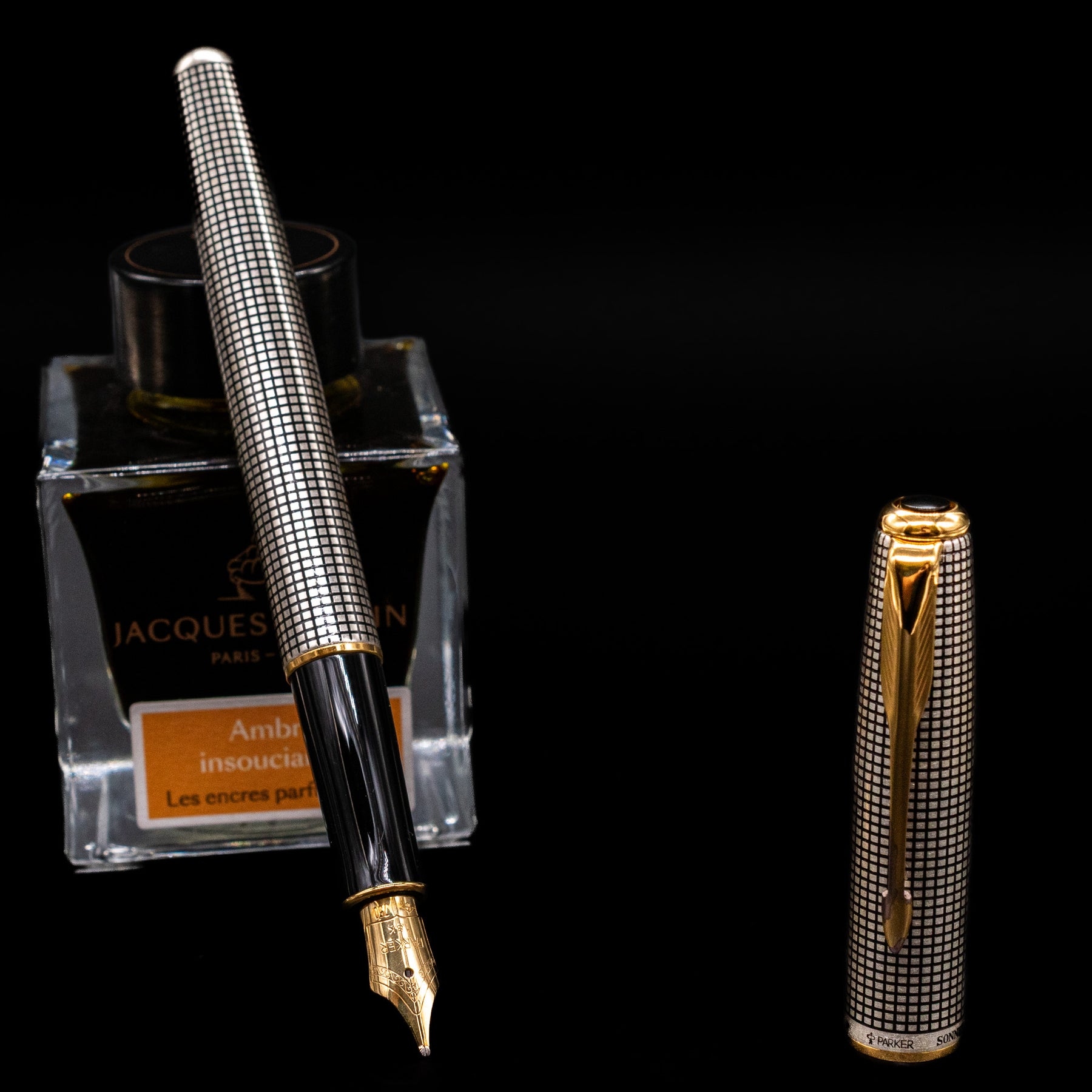 Parker Sonnet Cisele Sterling Silver Old Style Fountain Pen - Preowned capped, leaning against an ink bottle.