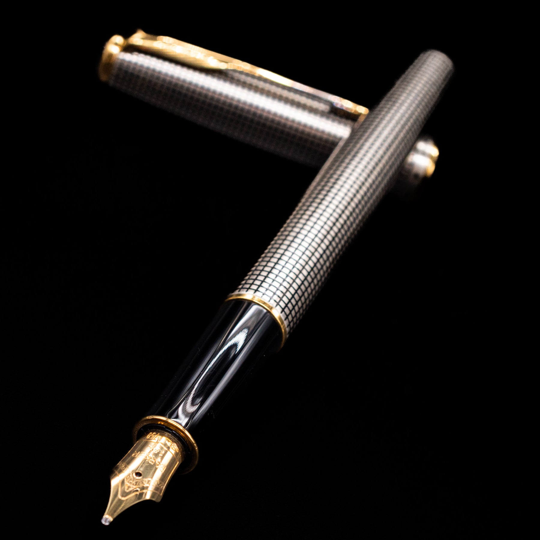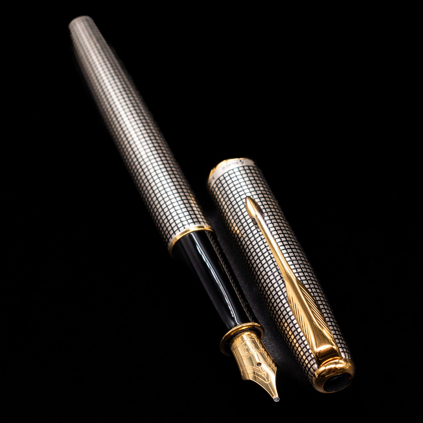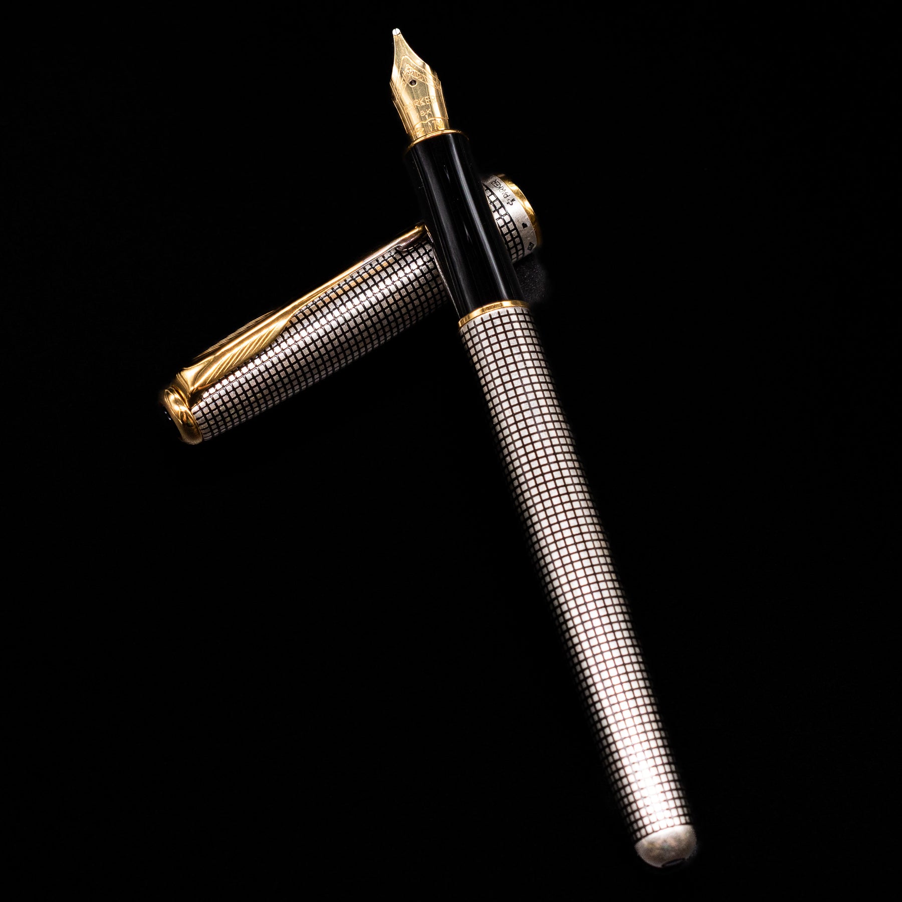 Parker Sonnet Cisele Sterling Silver Old Style Fountain Pen - Preowned laying across its own cap, crossed, with a focus on the nib.