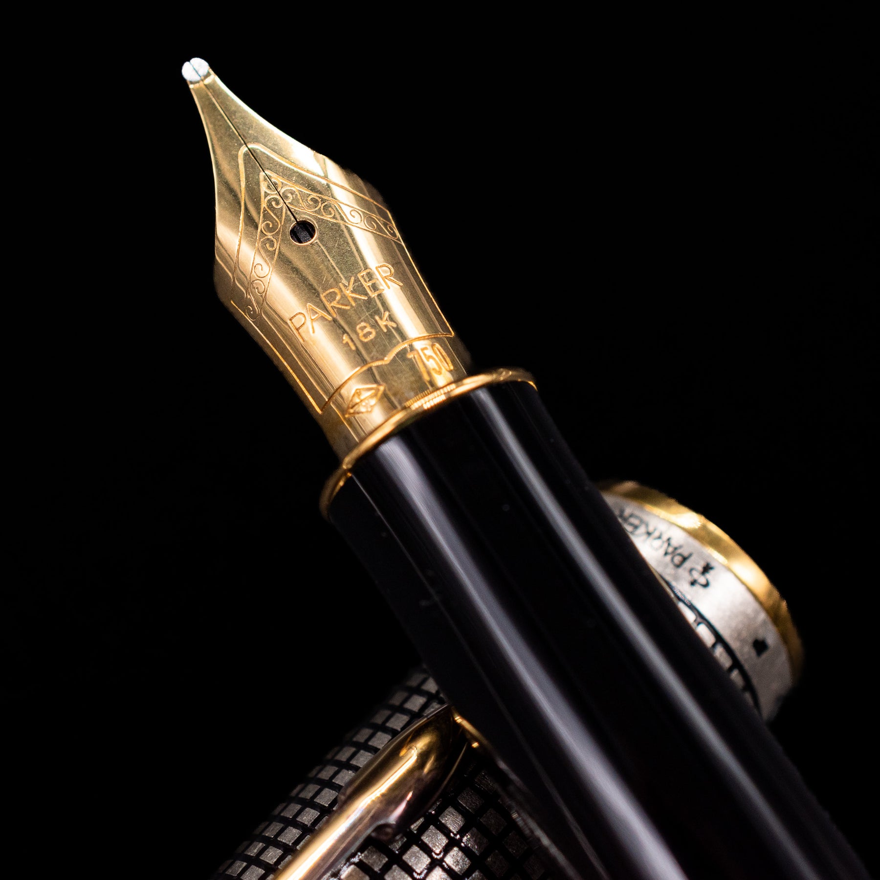 A macro shot of the nib with its intricate detailing and logo engraving for the Parker Sonnet Cisele Sterling Silver Old Style Fountain Pen - Preowned.