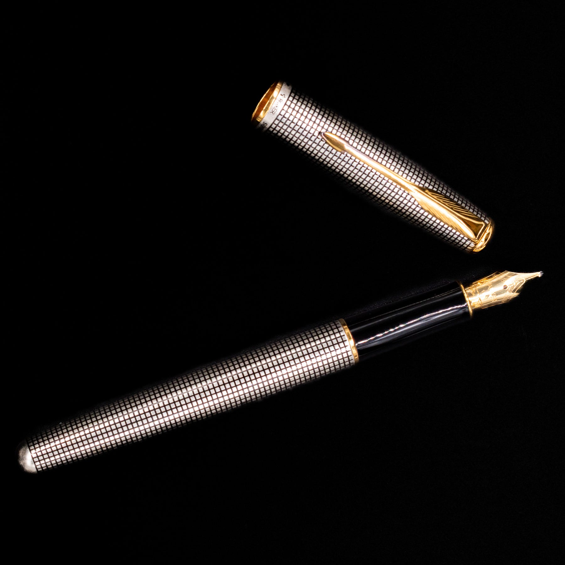 Parker Sonnet Cisele Sterling Silver Old Style Fountain Pen - Preowned laying on top of its cap in a crossed position showing full view of the entire uncapped pen.