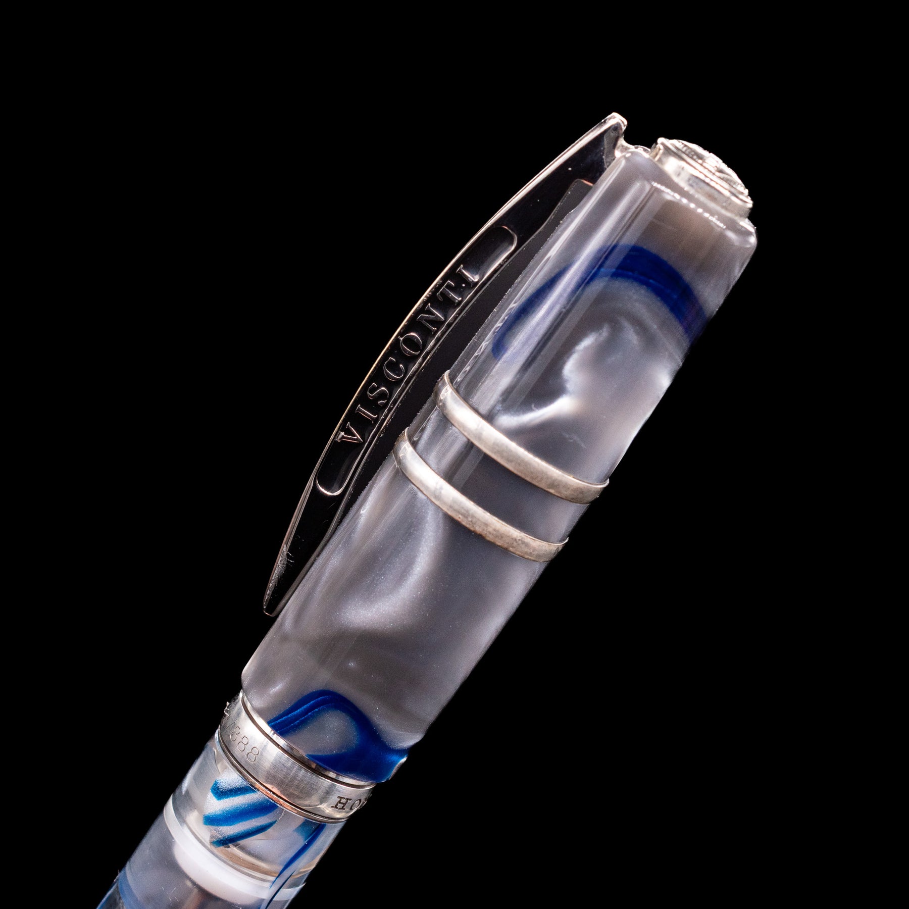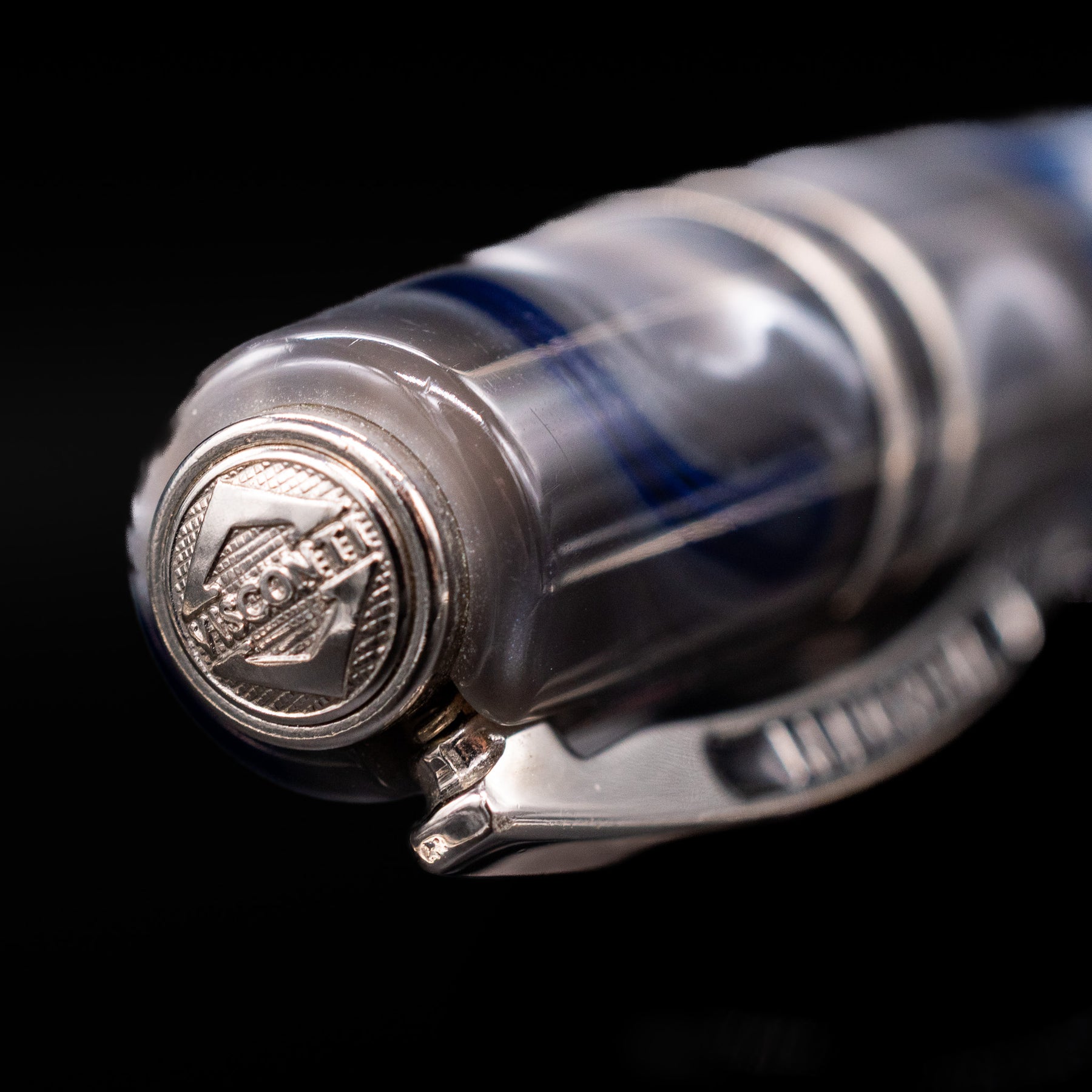 Polished 925 sterling silver trim accentuates the elegant design, with arc-shaped clip and cap rings bringing a refined, metallic contrast to the soft greys and blues of the body. At the filling end is Visconti’s patented Double Reservoir Power Filler™ system — a precision titanium-built vacuum mechanism that draws and stores significant ink volume while minimizing air and leakage.