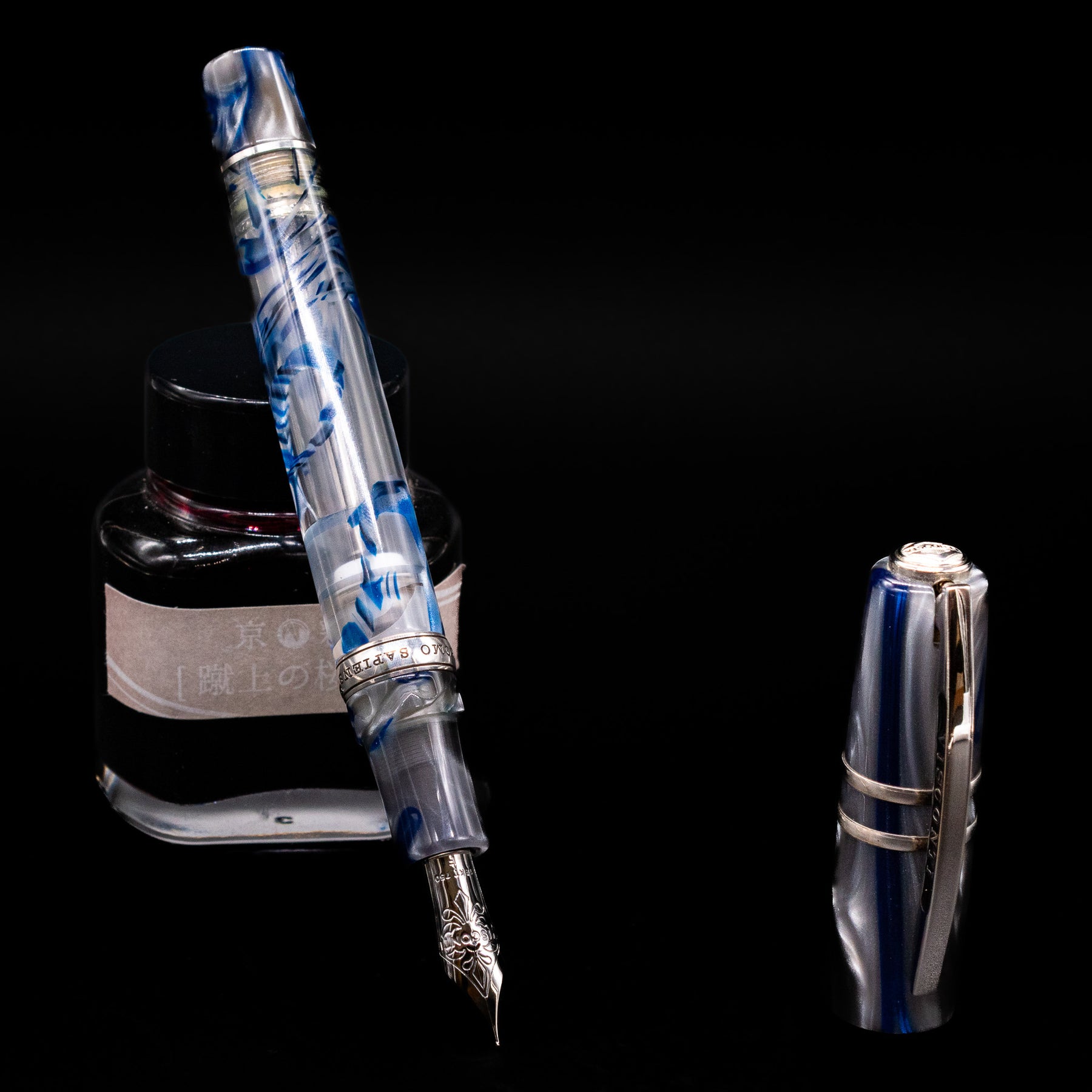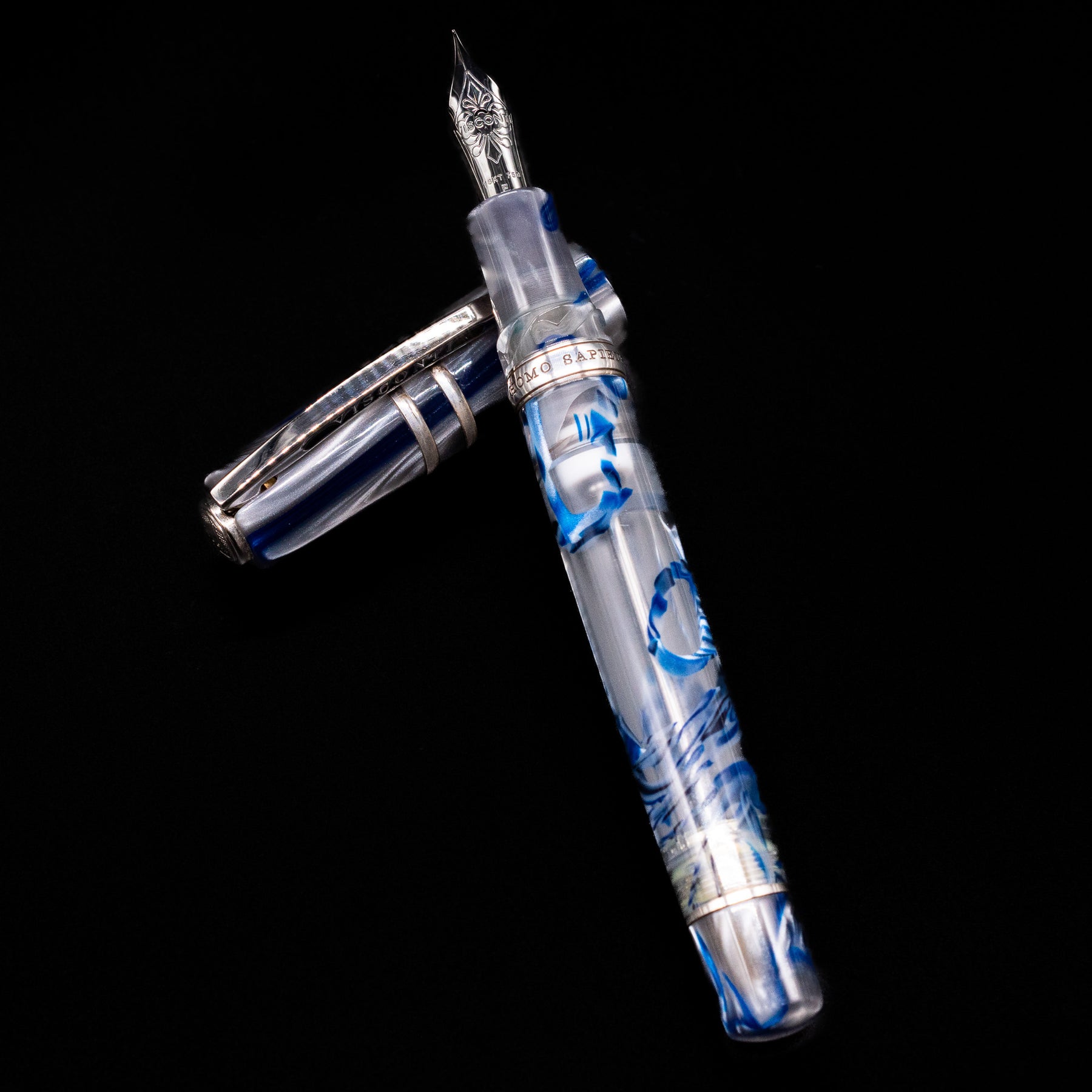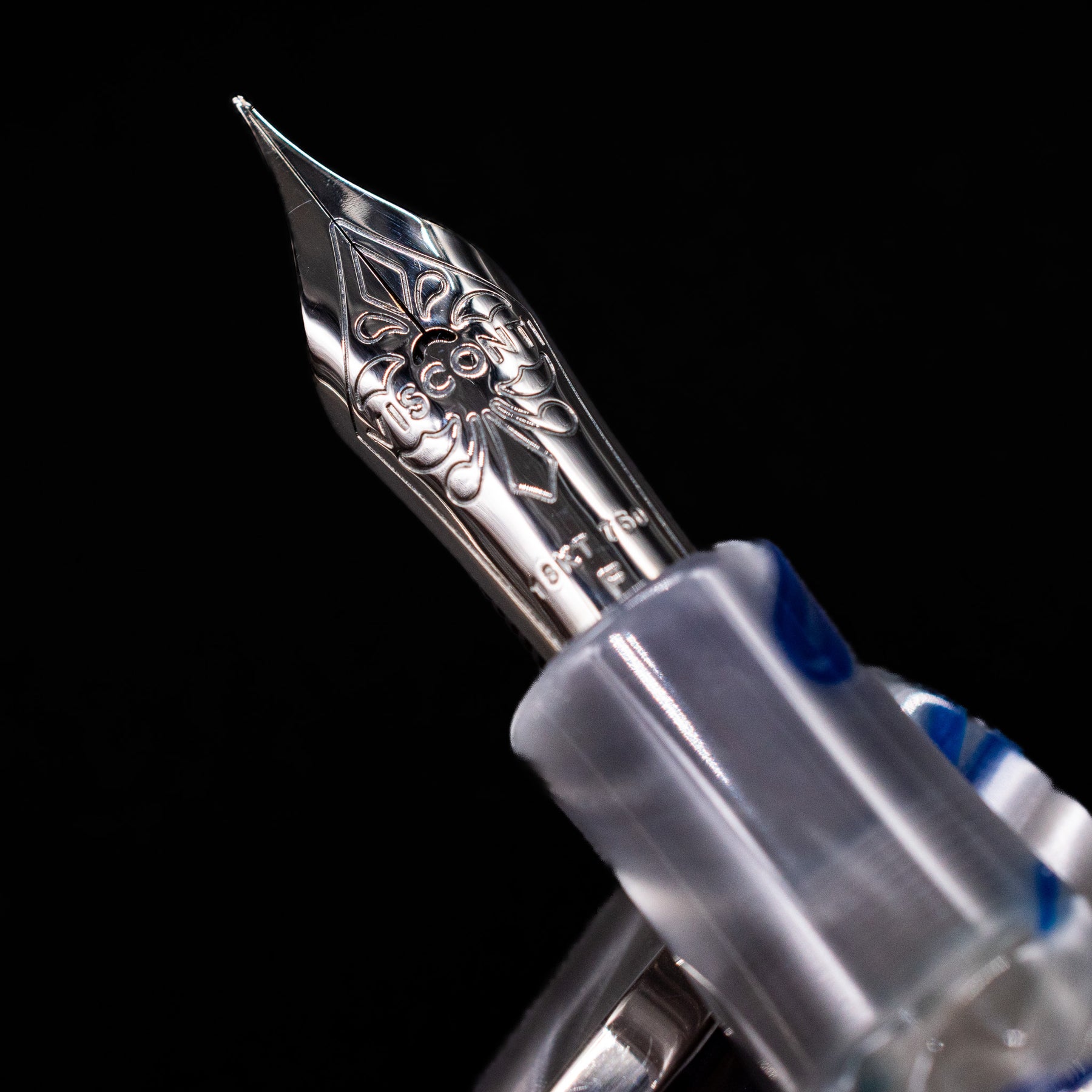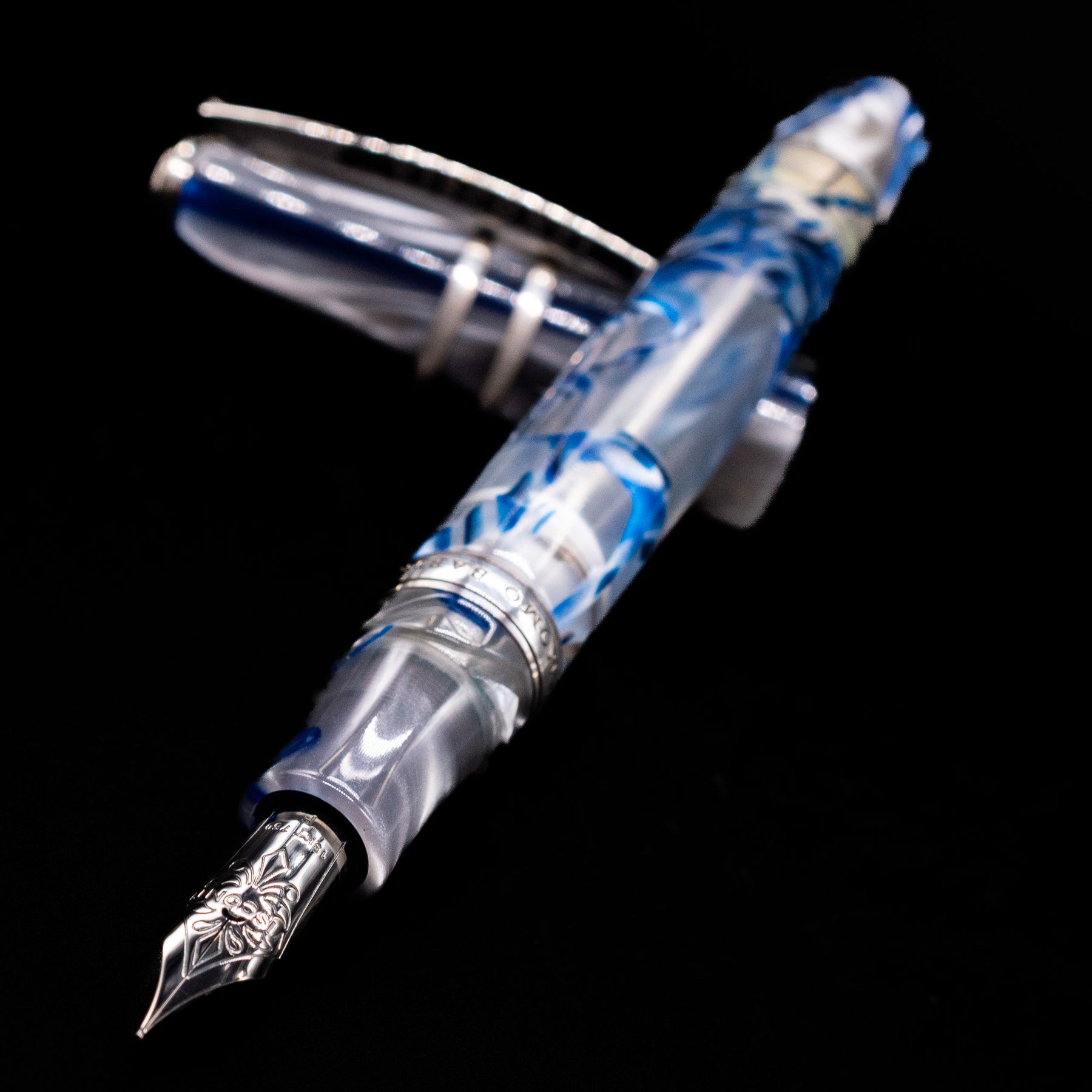 The London Fog design is defined by its semi-clear acrylic and celluloid construction: ribbons of finely shaved blue and grey celluloid are suspended throughout a transparent barrel, creating a smoky, ethereal visual effect evocative of its namesake fog over the Thames. This unique material — often described as acryloid — combines the depth and warmth of celluloid with the clarity and durability of acrylic, giving each pen a one-of-a-kind pattern and depth.