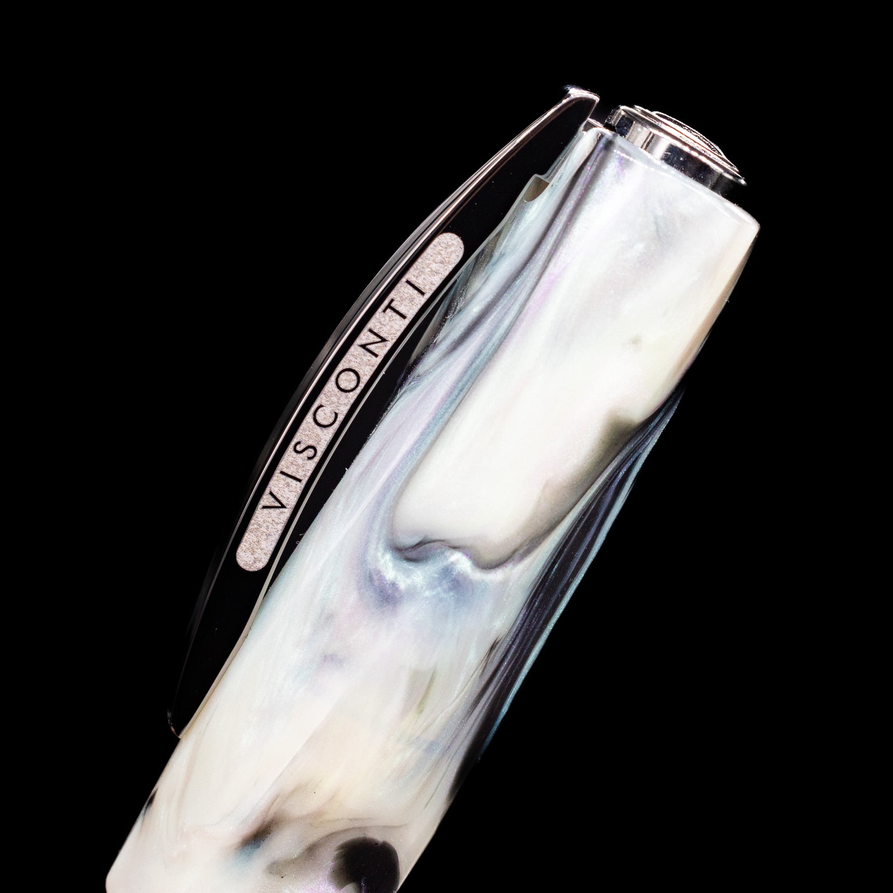 The pen is perfectly accentuated with ruthenium-plated brass trim and the iconic Visconti bridge clip. The Visconti Divina Abalone fountain pen also features the Visconti hook and lock cap, a Pull & Turn piston filling system, and a 14kt gold nib (plated to match the trim).