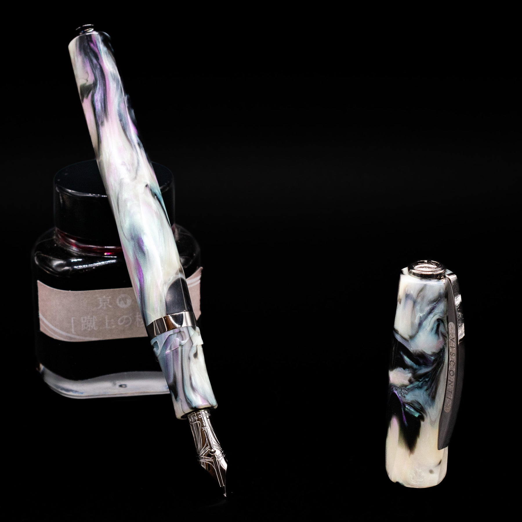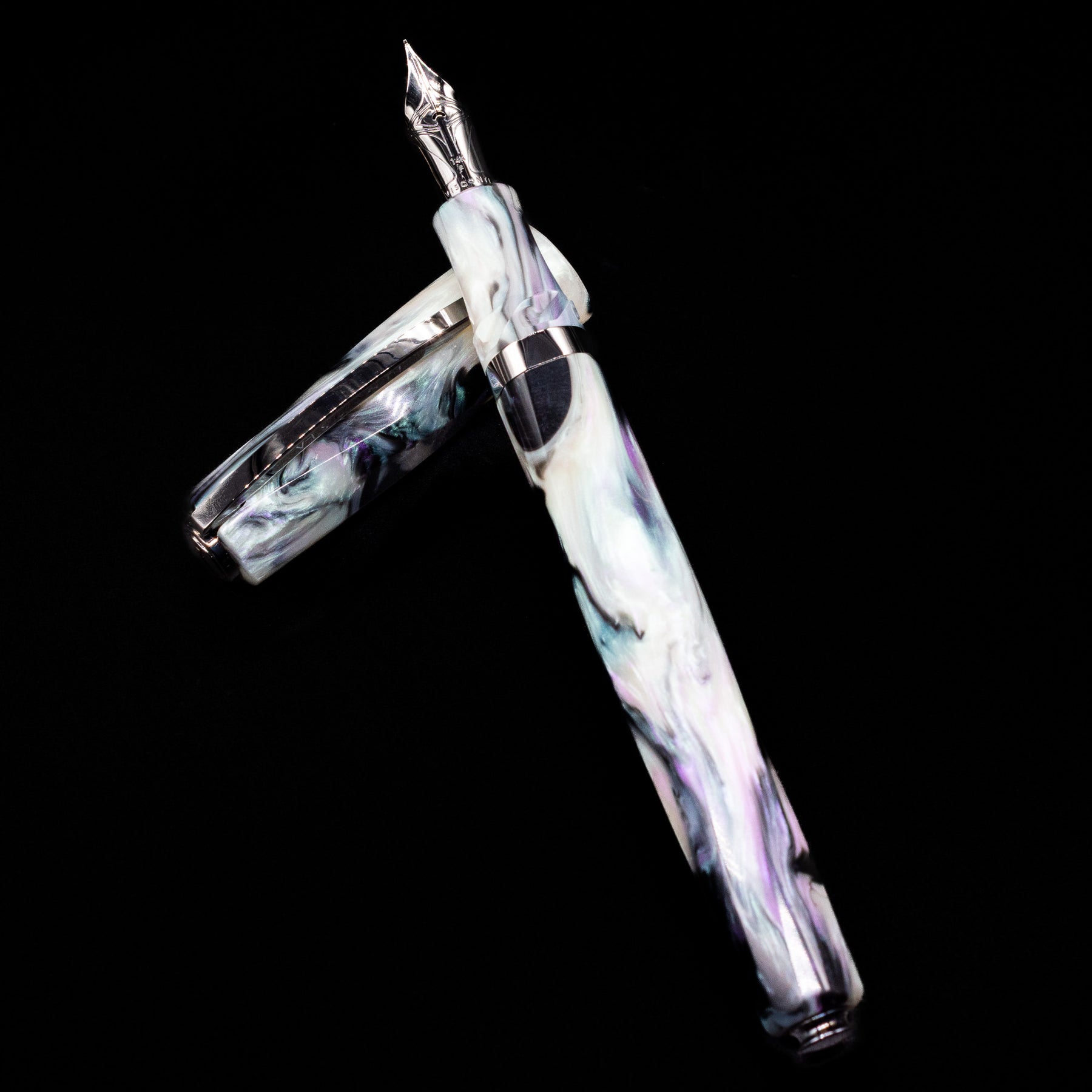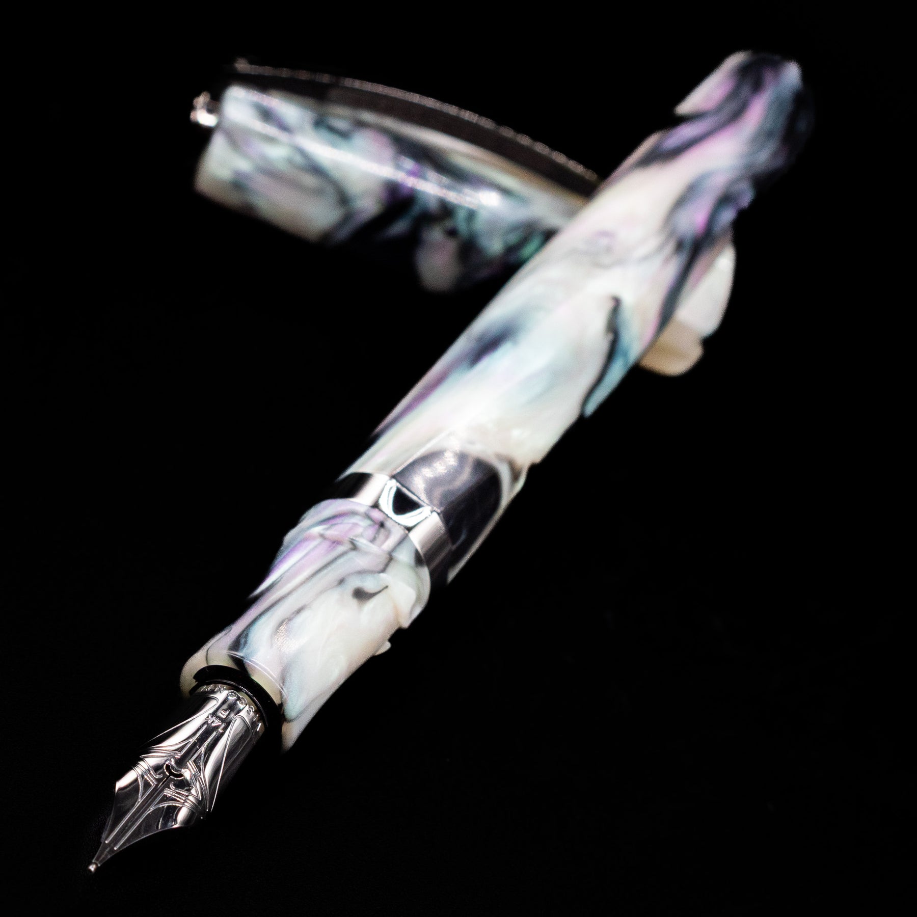 The Visconti Divina Abalone Brooks Resin fountain pen is a special collaboration between the well-loved Italian pen maker and Jonathan Brooks, a highly respected USA resin designer. Brooks creates his fiercely beautiful resins using a mix of pigments that generate a rush of vivid color in countless stunning shades and variations. In fact, Brooks is the designer and manufacturer of a significant portion of stunning resins currently seen on the market. This pen is limited to just 58 pieces, and is a Truphae Exclusive! Each pen is individually numbered on the grip section.
