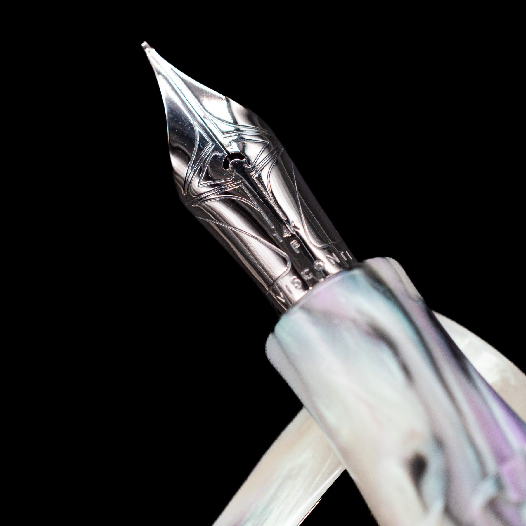 Close-up of the Visconti 18k gold nib on the Divina Abalone Serial