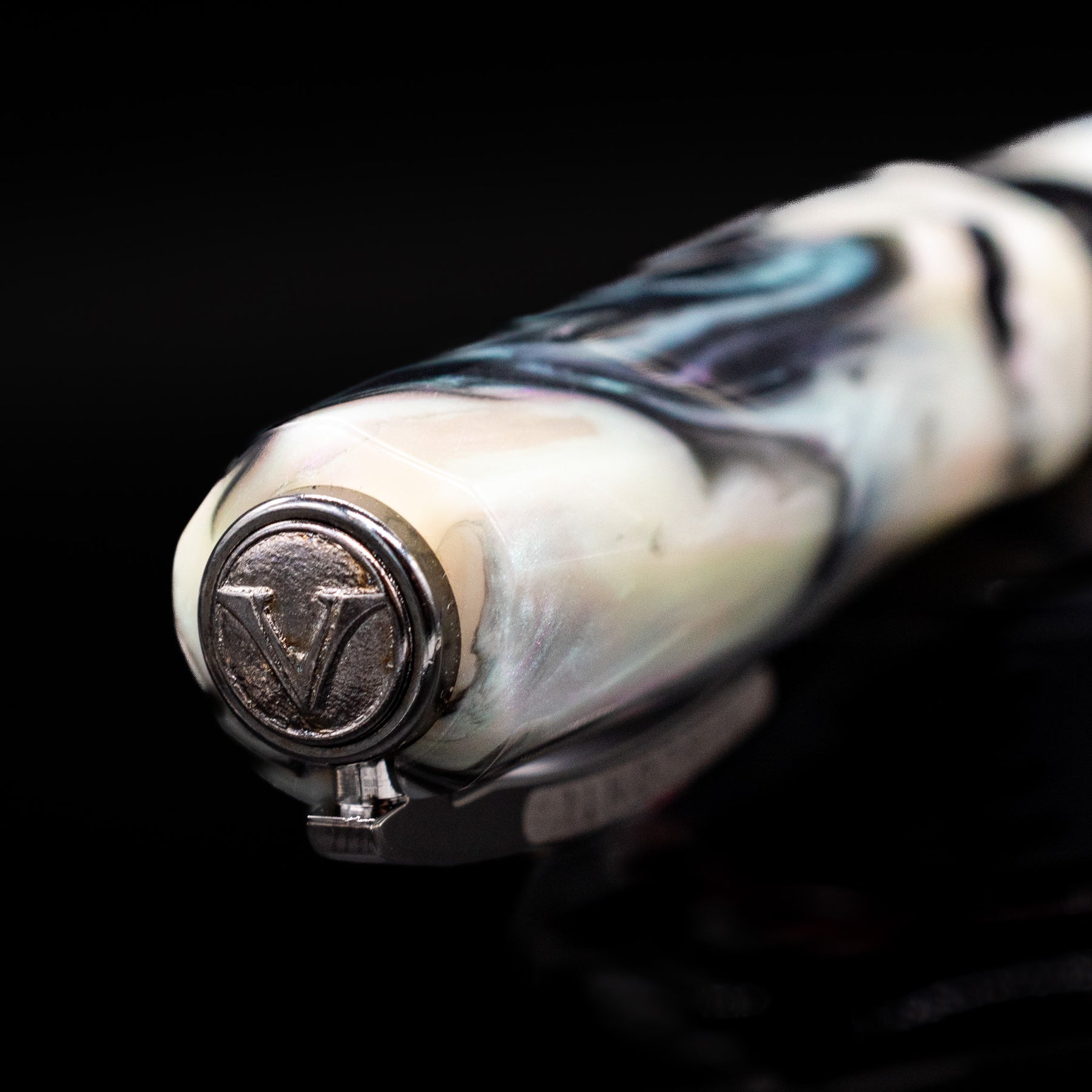 Close-up view of the cap on the Visconti Divina Abalone Fountain Pen.