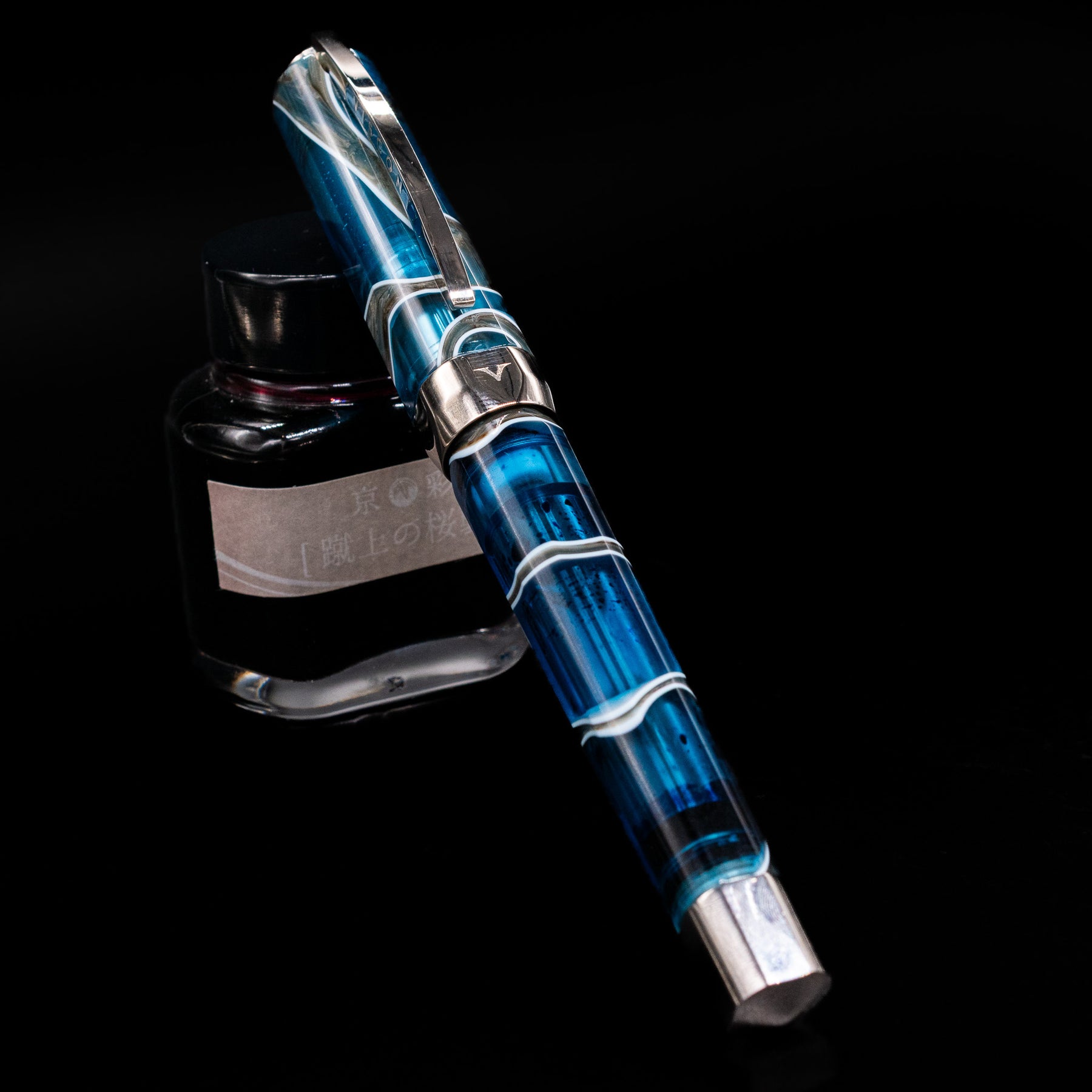 Visconti Opera Master Polynesia Fountain Pen - Preowned capped, leaning against an ink bottle.