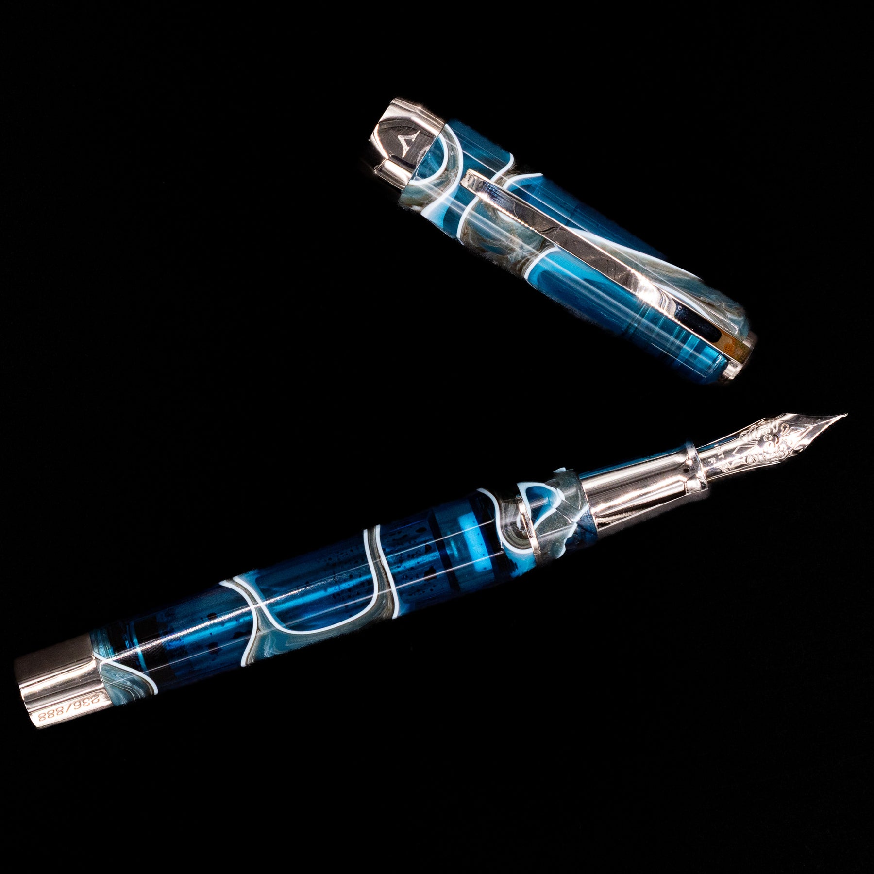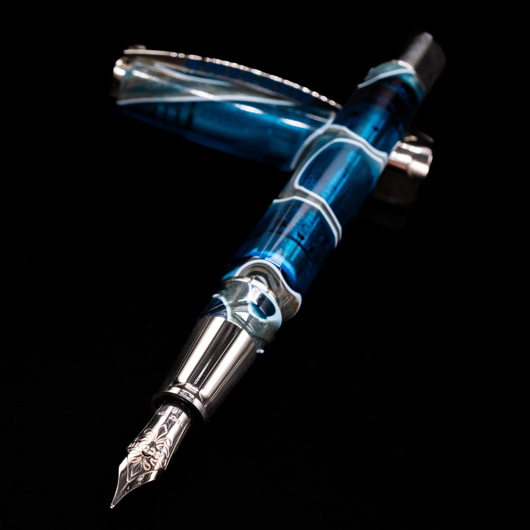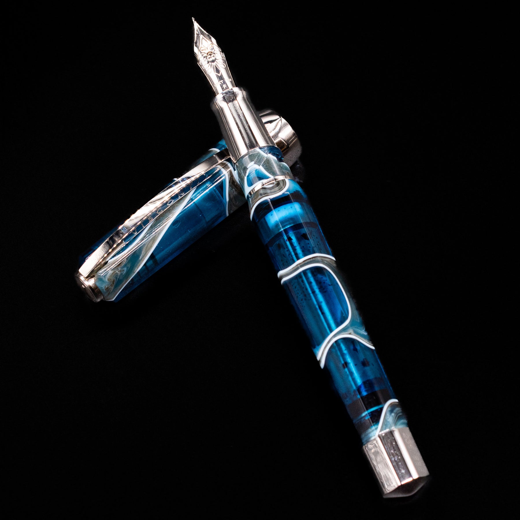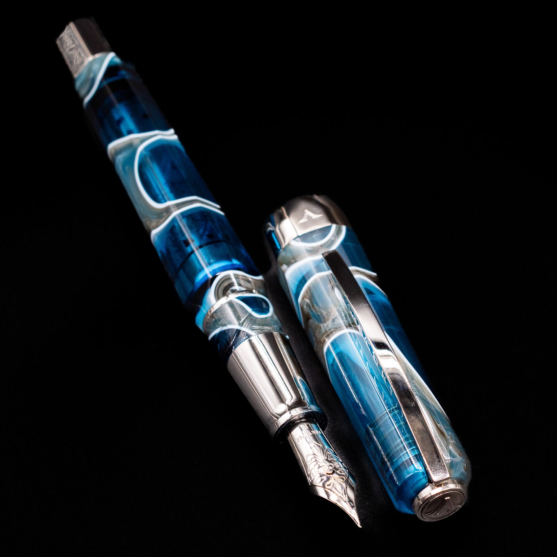 The pen’s body and cap are crafted from a richly layered acryloid resin that blends deep blues, greens, and hints of turquoise — all swirling together in a way that mimics the organic motion of ocean currents. No two pens look the same: each has its own unique pattern and depth, giving every owner a writing instrument with individual personality. Polished rhodium-plated trim provides cool, elegant contrast to the vibrant body, including a gracefully styled clip and refined metal accents that complete the polished look.