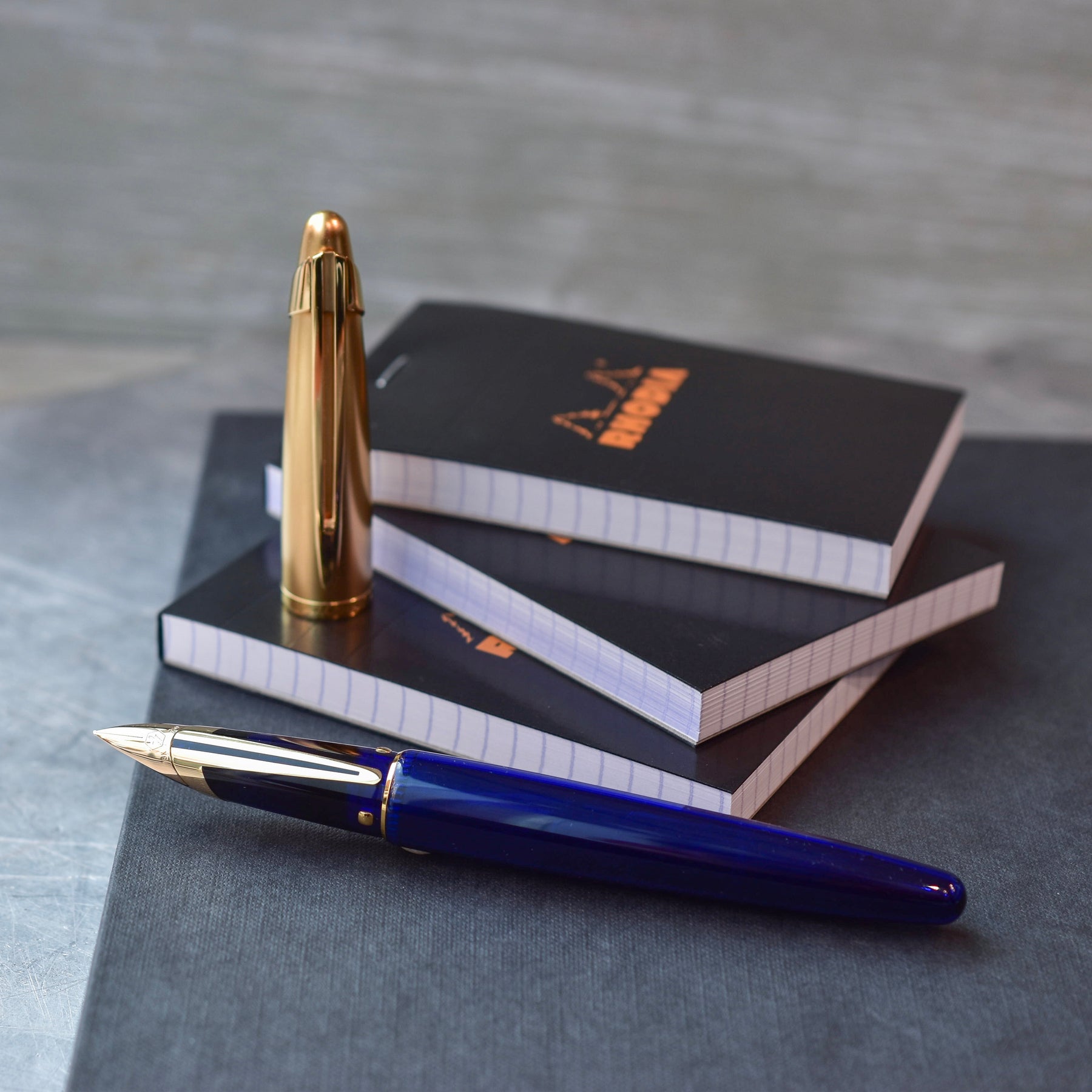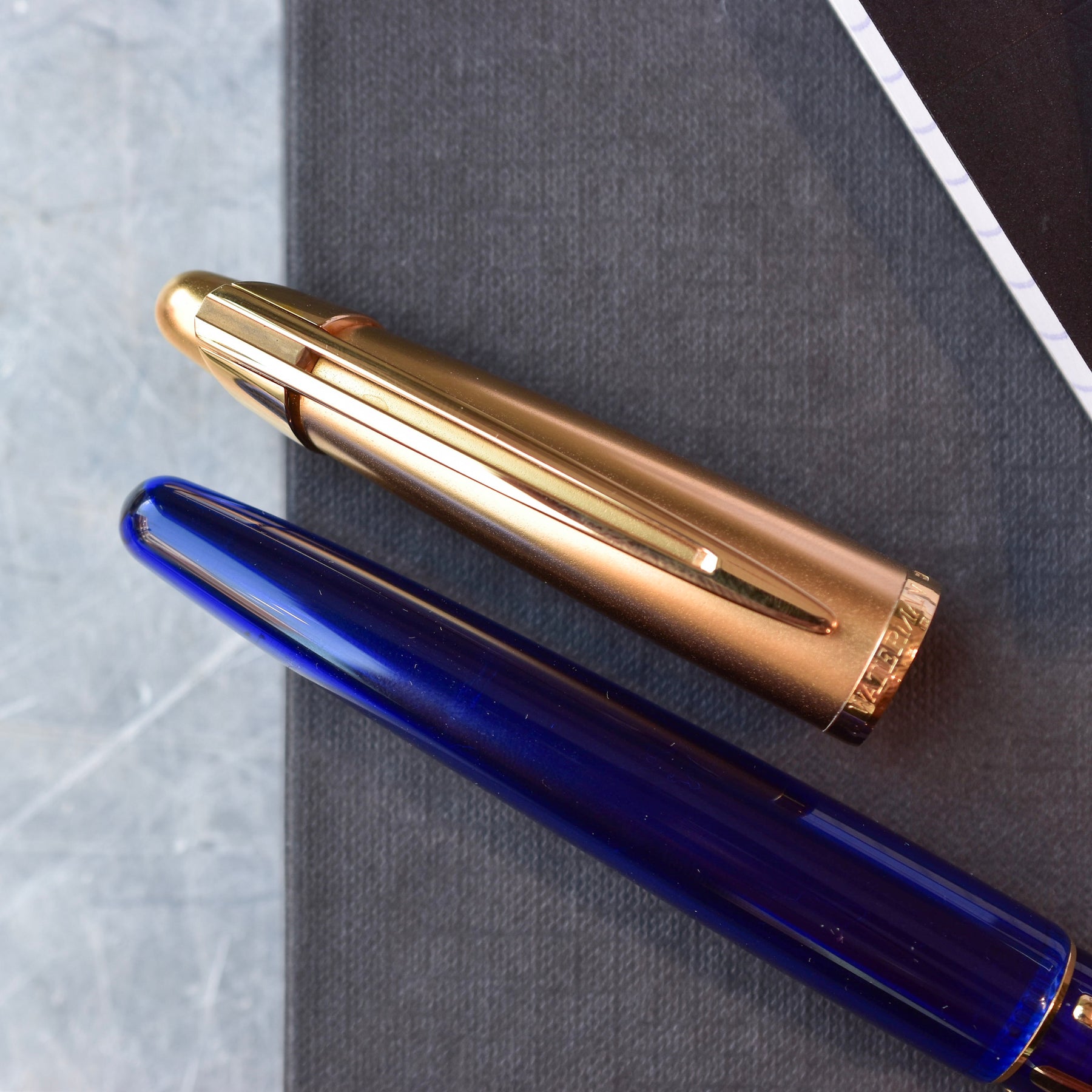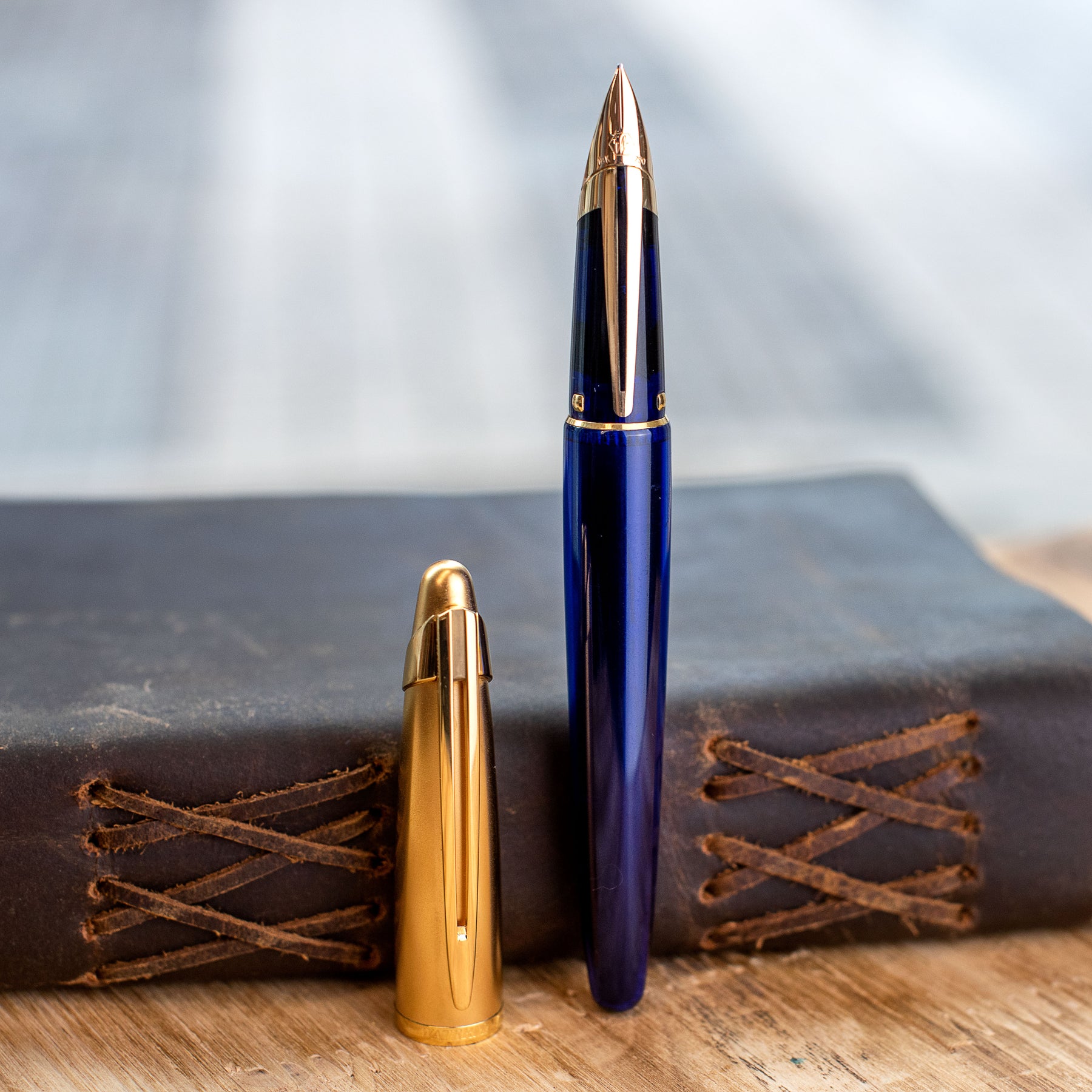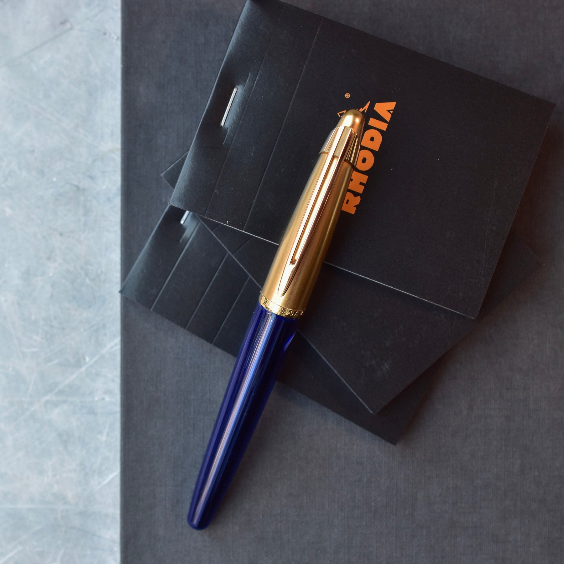 Waterman describes the immense color on this pen as, “A deep sea-blue pierced by a ray of light. A satin gold overlaid with glistening gold. A luminous blue….an unusual blue, reminiscent of the sea, pierced by a ray of sunlight. To capture the scintillating depth of color of the barrel, Waterman’s engineers have developed a structure with a double wall and a dual function. The Interior respects all technological restraints. The exterior absorbs the light and diffuses it, a deep marine or midnight blue. The space between the two is vital.”
