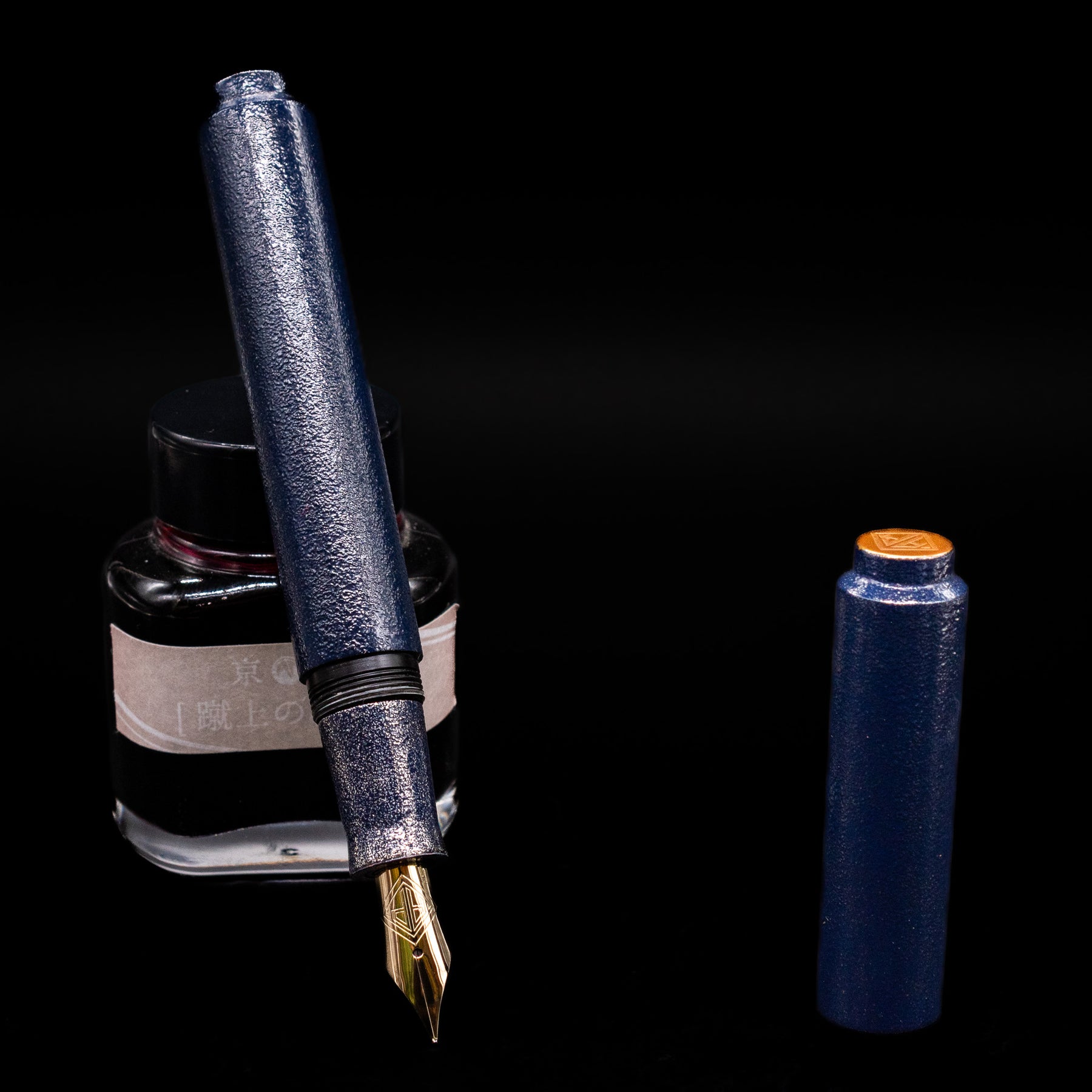 The body and cap are constructed from layered urushi lacquer, hand-applied in successive stages and cured under controlled humidity. The dominant tone is a saturated, midnight blue — cooler and more focused than bronze-leaning cosmic interpretations.