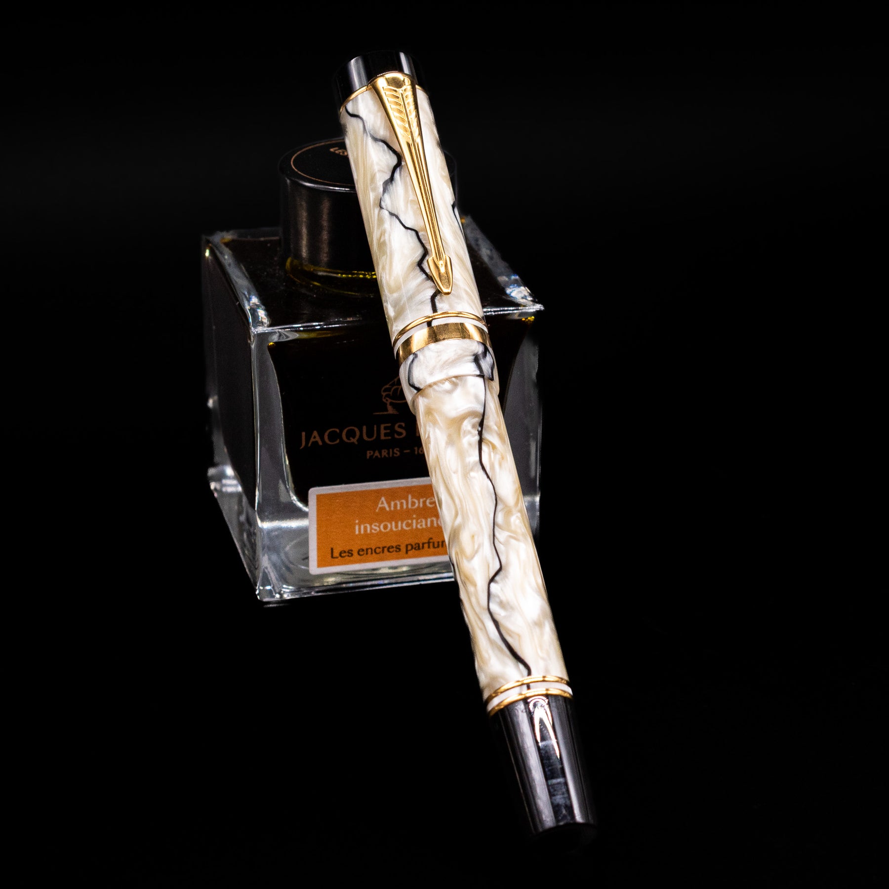 Parker Duofold Centennial Pearl & Black Fountain Pen - Preowned capped, leaning against an ink bottle.