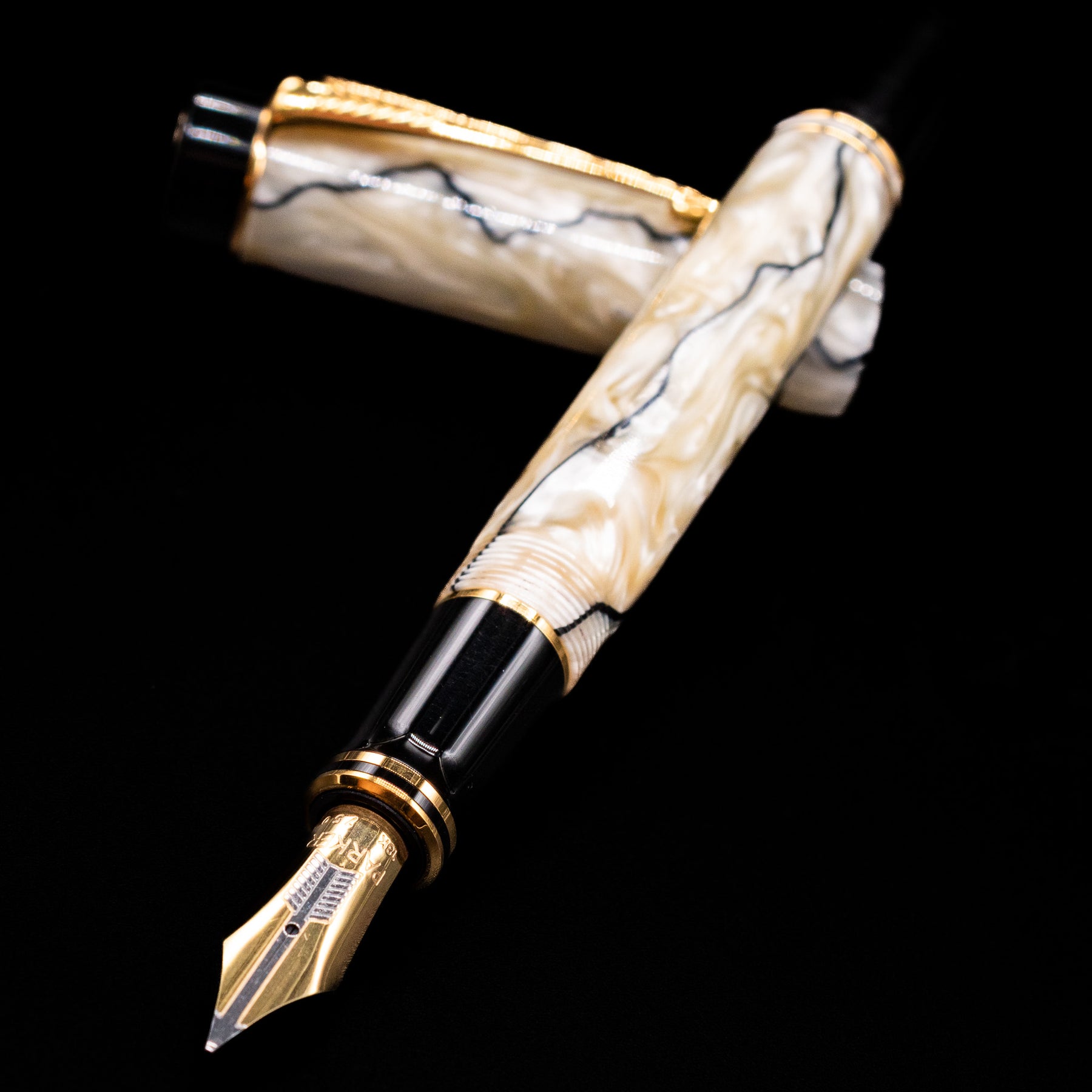 Parker Duofold Centennial Pearl & Black Fountain Pen - Preowned laying on top of its cap in a crossed position showing full view of the entire uncapped pen.
