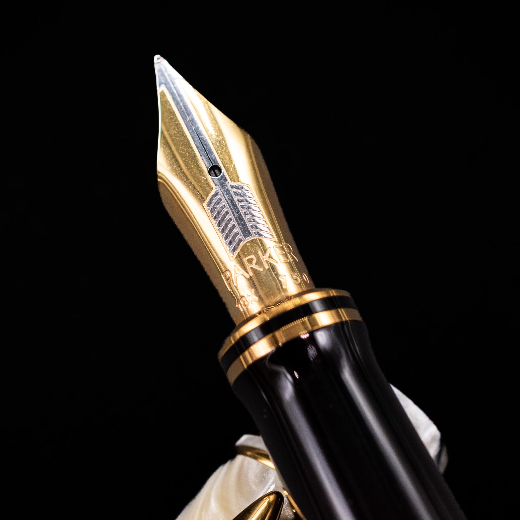 The pen's nib is made from 18-karat gold and features a fine tip that provides a smooth and consistent writing experience. The pen is also equipped with an ink converter that allows you to use your favorite bottled ink or a standard Parker cartridge. The pen's screw-on cap is designed to ensure a secure fit and prevent ink from drying out.