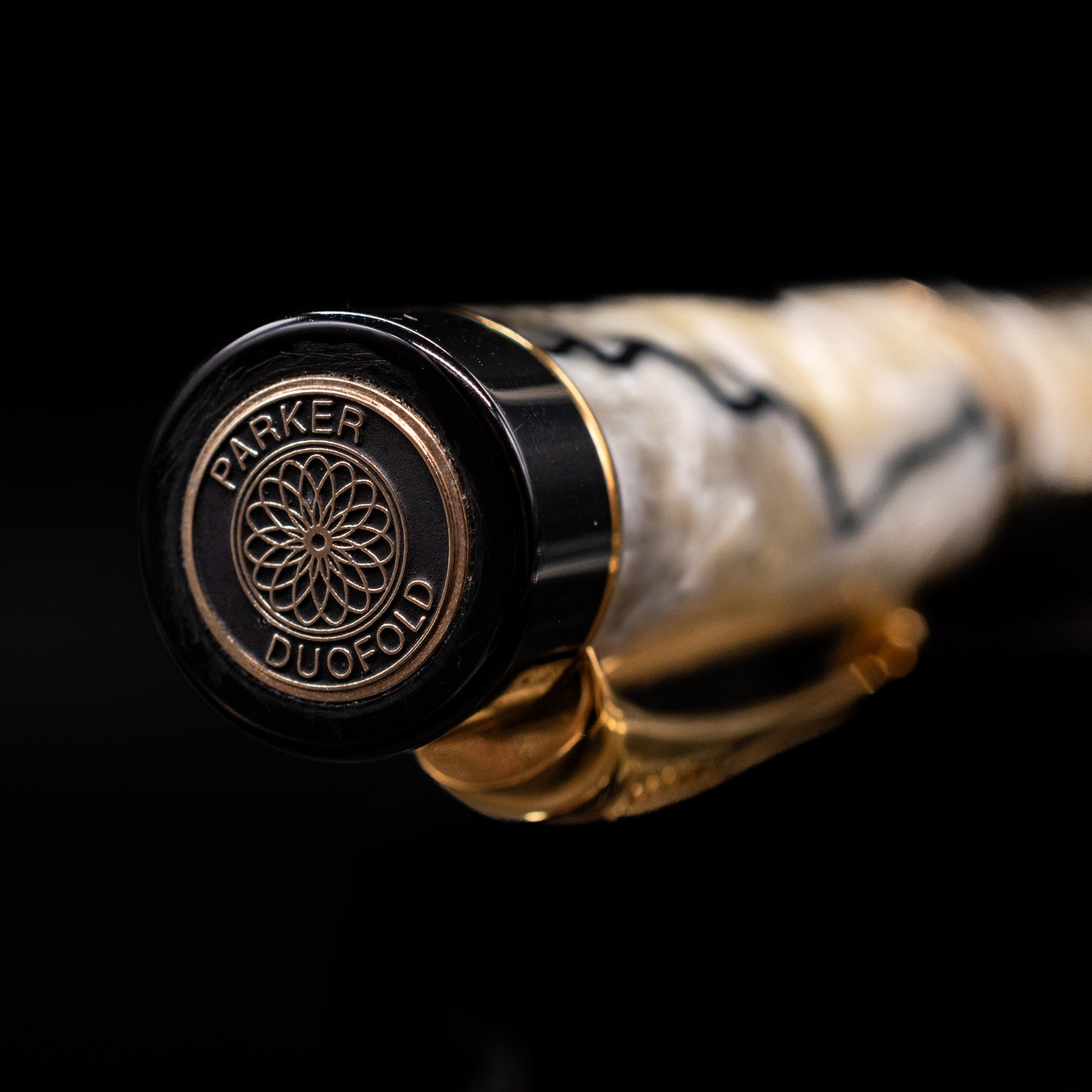 Zoomed-in view of the top of the cap with the finial on the Parker Duofold Centennial Pearl & Black Fountain Pen - Preowned.