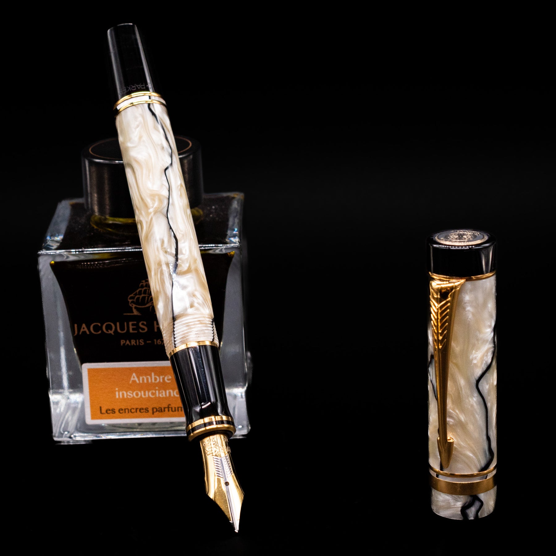 Parker Duofold Centennial Pearl & Black Fountain Pen - Preowned leaning on an ink bottle uncapped showcasing the detailing on the nib.