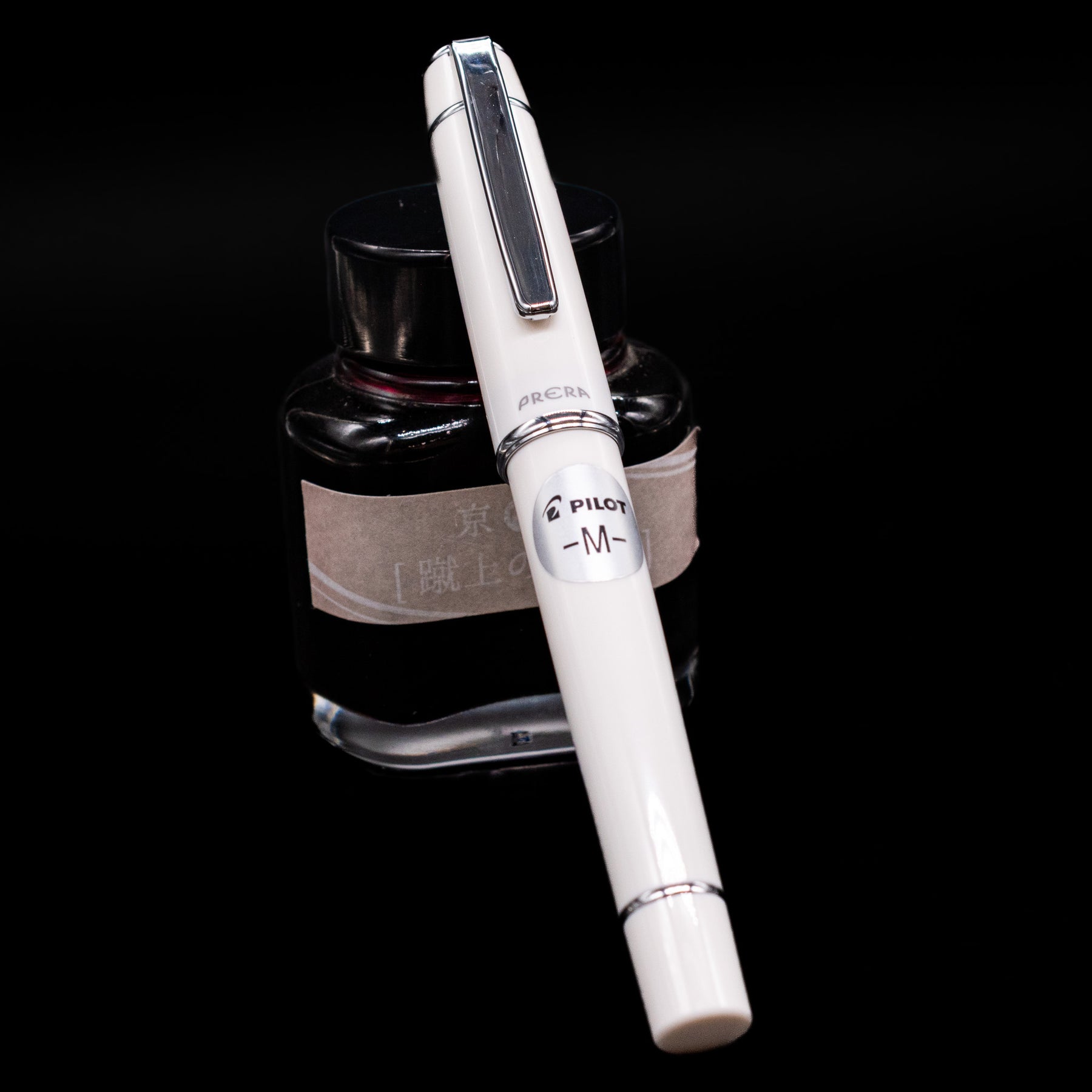 Pilot Prera Fountain Pen - Porcelain White capped, leaning against an ink bottle.