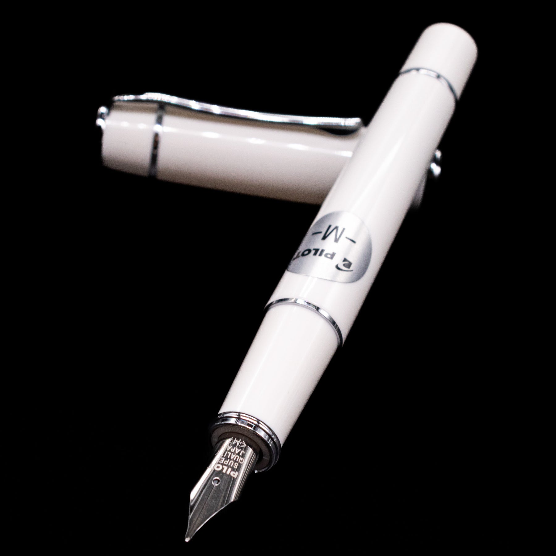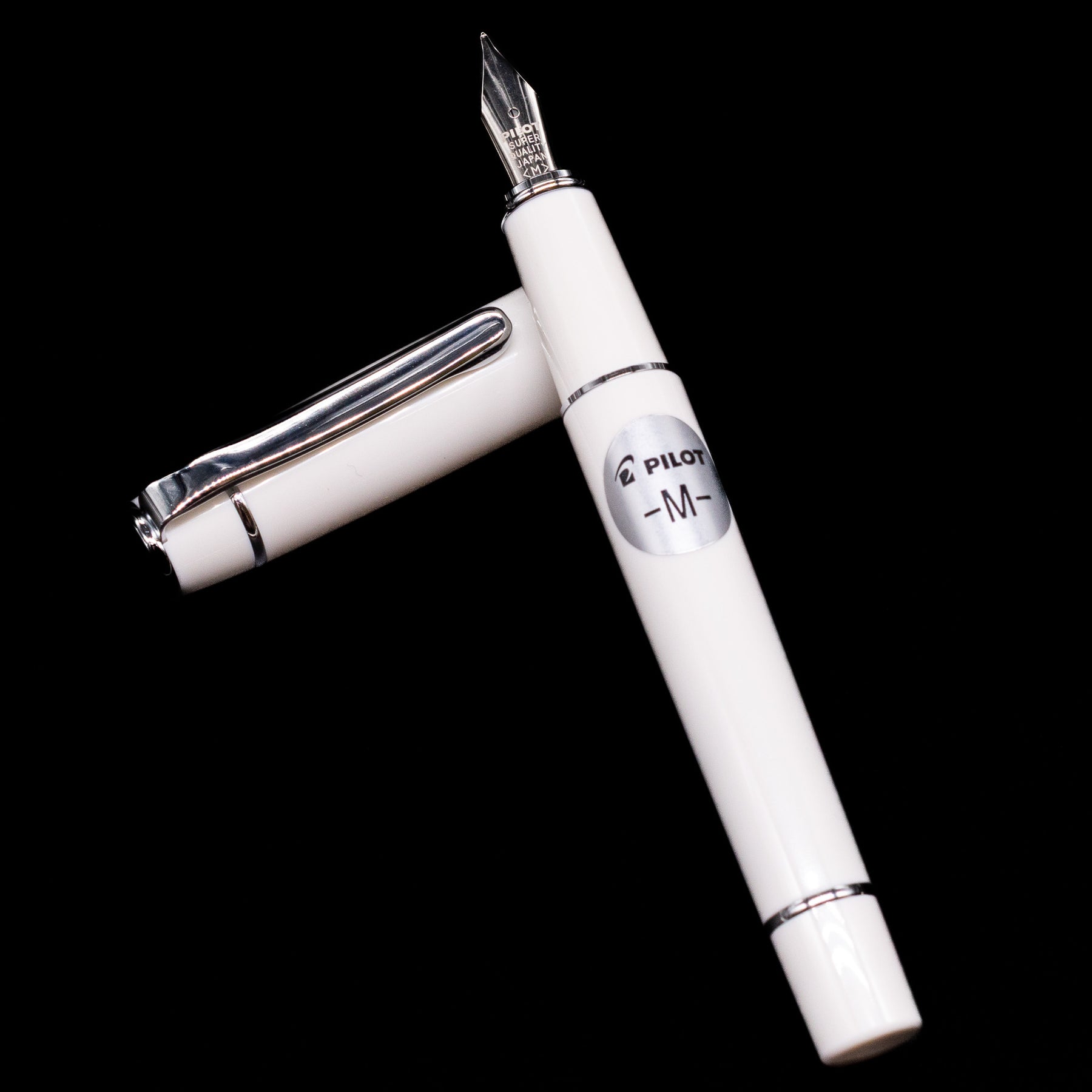 Pilot Prera Fountain Pen - Porcelain White laying on top of its cap in a crossed position showing full view of the entire uncapped pen.