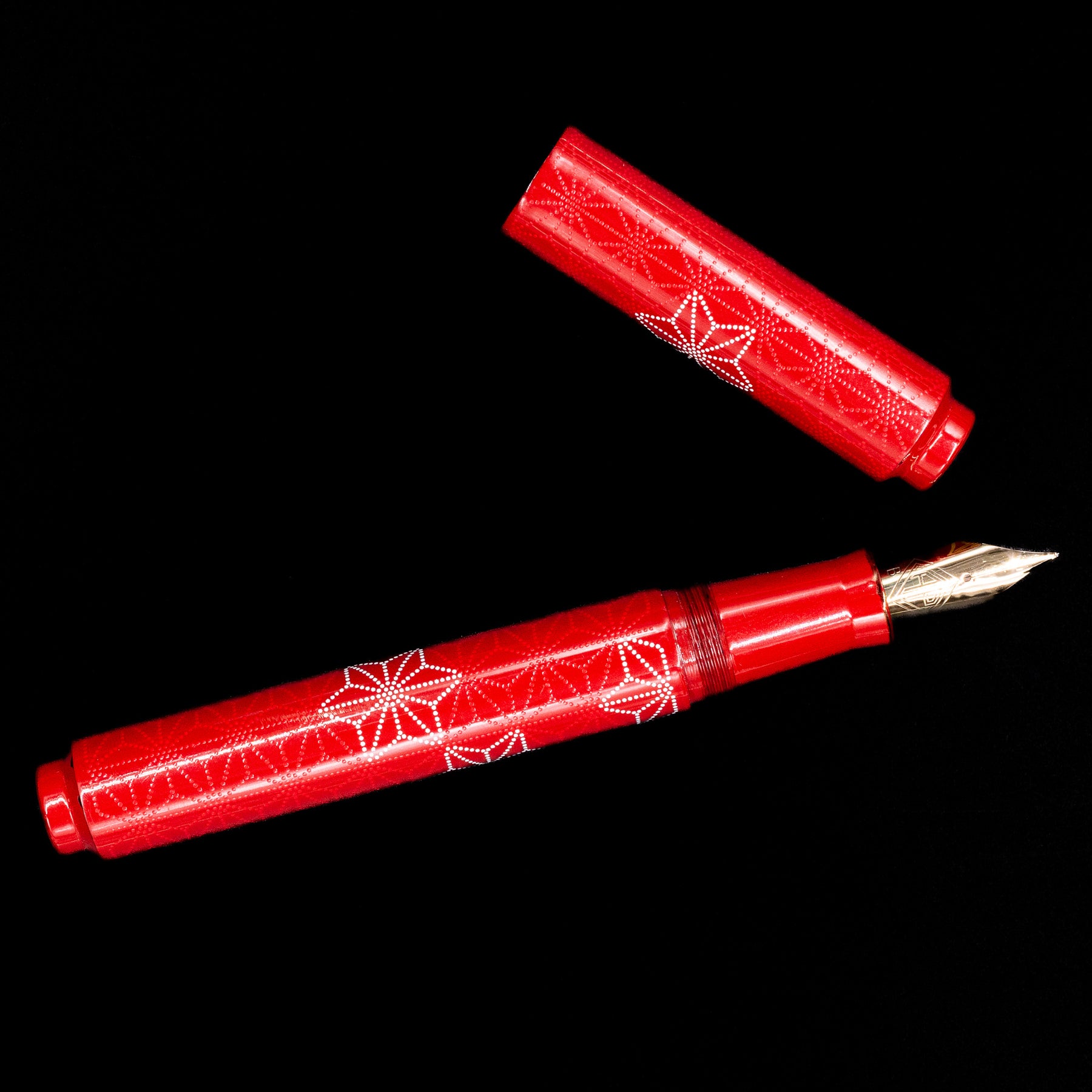 AP Limited Editions Sakura Lacquer Art Fountain Pen - Snowflakes Red laying on top of its cap in a crossed position showing full view of the entire uncapped pen.