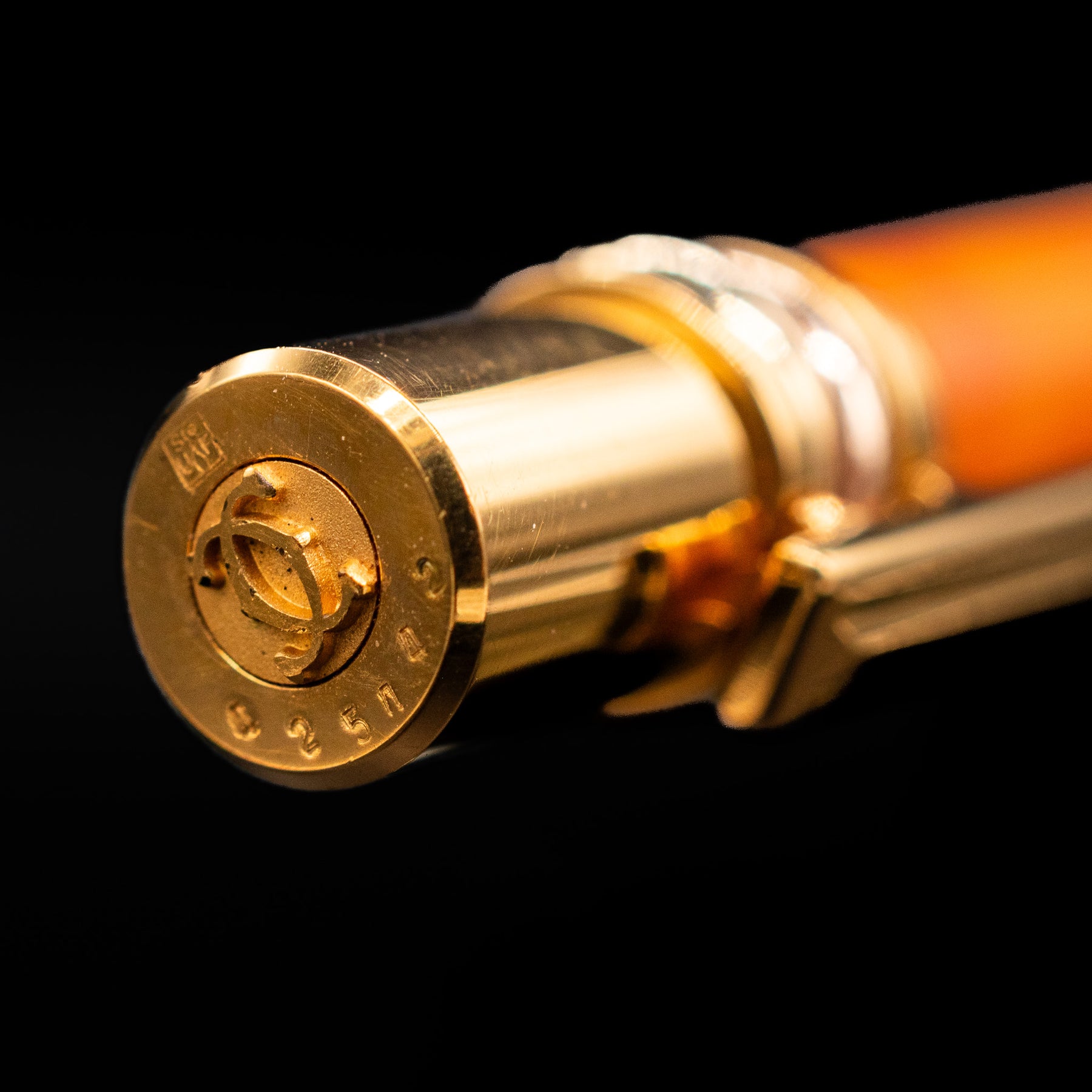 This example features a striking orange lacquer barrel, polished to a high gloss that beautifully contrasts with Cartier’s signature gold-plated trim. The sleek, minimalist silhouette is accented by the Trinity double-C emblem on the finial, offering a subtle nod to the brand’s timeless heritage. Its refined proportions make it exceptionally comfortable in the hand, transforming even routine writing into an elevated experience.