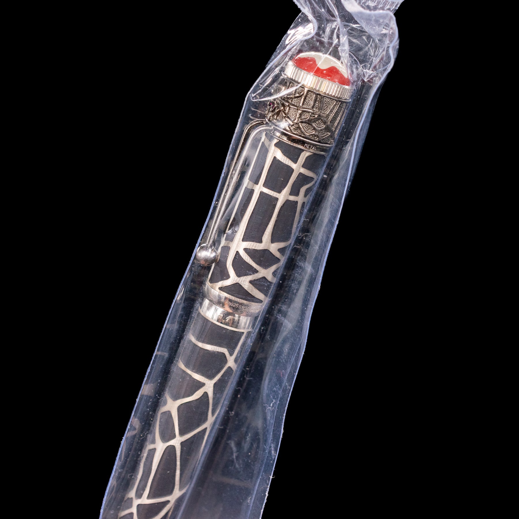 The Heritage Collection Rouge et Noir celebrates the 110-year-old pioneering spirit of Montblanc. Reinterpreting the legendary writing instrument, it features a longer, slimmer silhouette, modern piston filler technology and craftsmanship refined over generations. The exclusive fountain pen is made from Ag 925 sterling silver with a spider's web. Spider clip in vintage look with rubies for eyes.