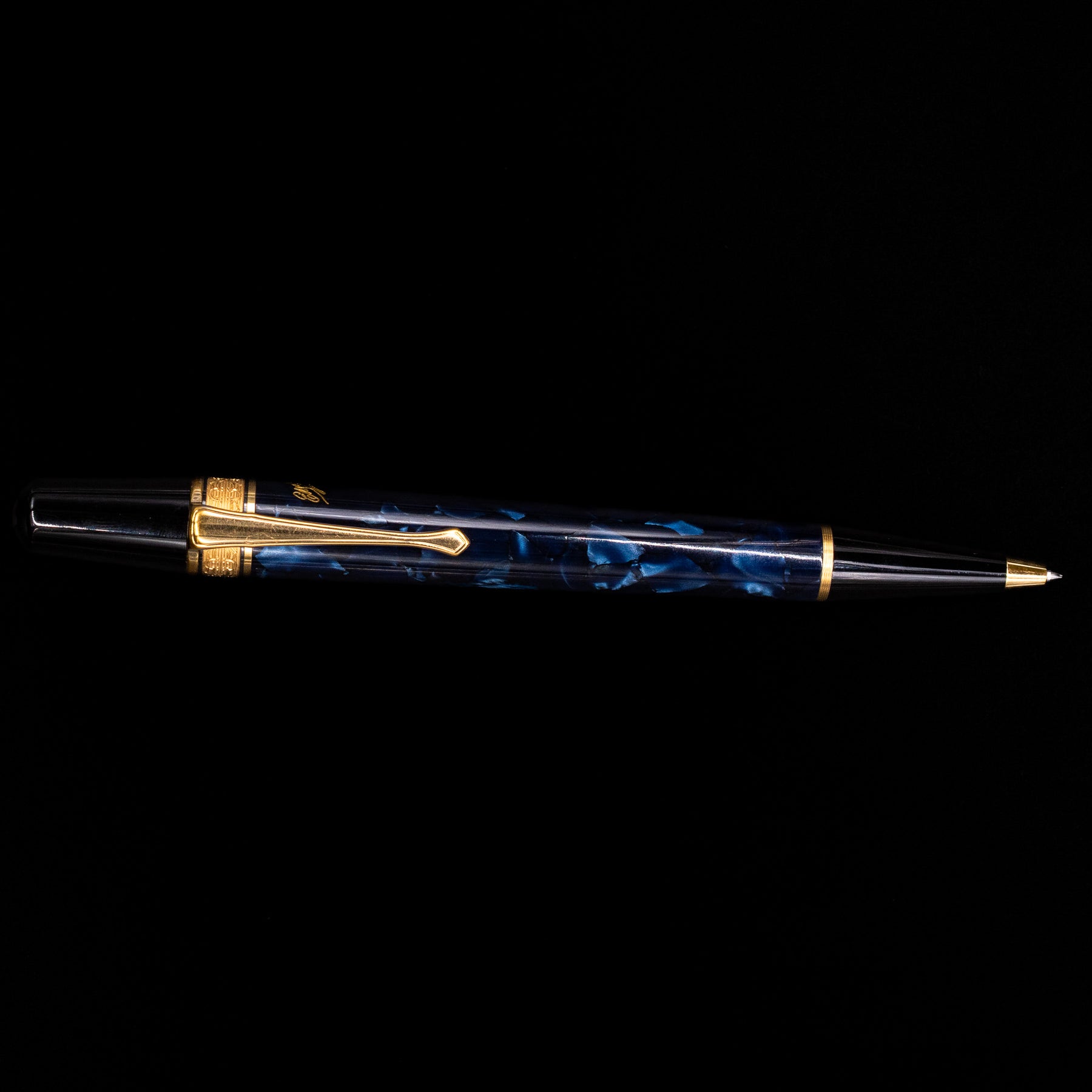 The pen features a deep midnight-blue celluloid barrel inspired by the mysterious atmosphere and nocturnal imagery that define Poe’s most iconic poems and tales. Subtle marbling evokes swirling fog and shadow, while gold-plated accents add refined contrast. The cap bears Poe’s signature, an homage to his lasting cultural and literary legacy.